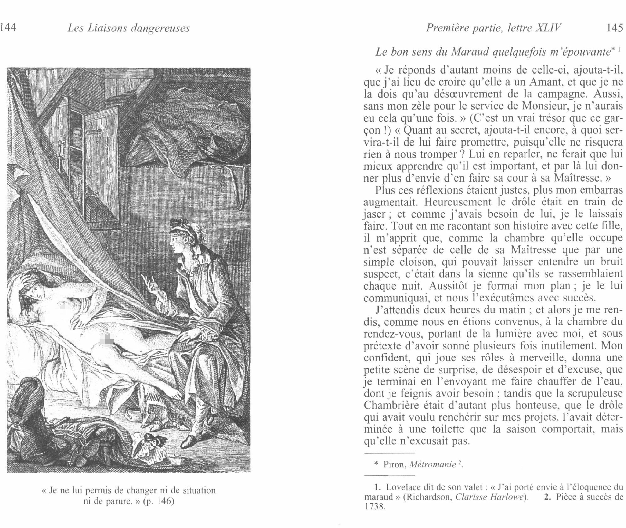 La jeune Cecile Volanges quitte son couvent pour faire l’apprentissage du monde et epouser le comte de Gercourt, mais une de ses parentes, la marquise de Merteuil, entend profiter de ce projet de mariage pour se venger d’une infidelite que lui a faite autrefois Gercourt. Elle charge donc son complice, le vicomte de Valmont, de pervertir Cecile avant ses noces. Mais loin de Paris, dans le chateau de sa vieille tante, Valmont s’est de son cote mis en tete de seduire la devote presidente de Tourvel, et une idylle bientot se noue entre la « petite Volanges » et le jeune Danceny.