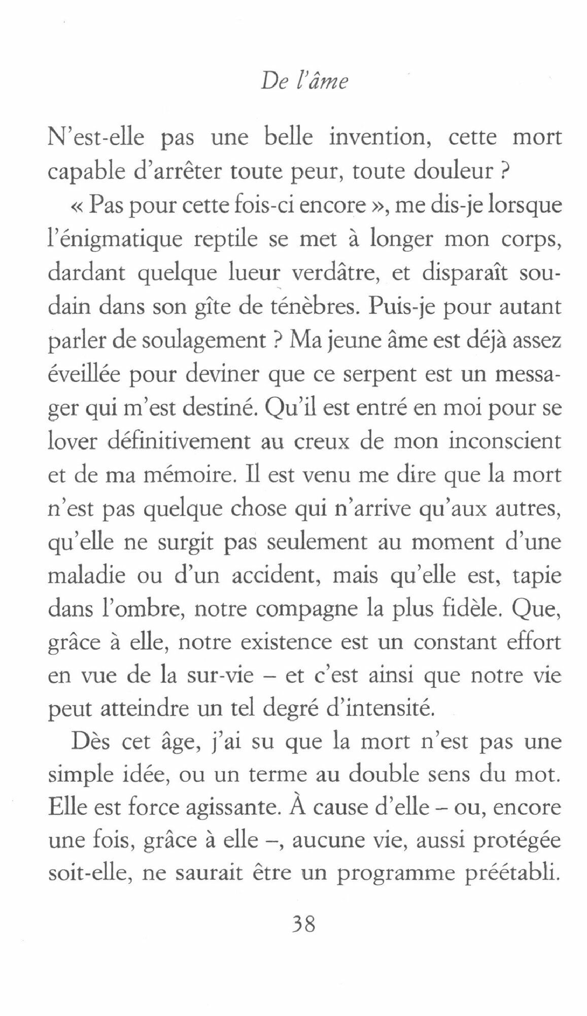 J’ecris le mot « ame », je le prononce en moi-meme, et je respire une bouffee d’air frais. Par association phonique, j’entends Aum, mot par lequel la pensee indienne designe le souffle primordial. Instantanement, je me sens relie a ce desir initial par lequel l’univers est advenu, je retrouve au plus profond de mon etre quelque chose qui s’etait revele a moi, et que j’avais depuis longtemps egare, cet intime sentiment d’une authentique unicite et d’une possible unite.