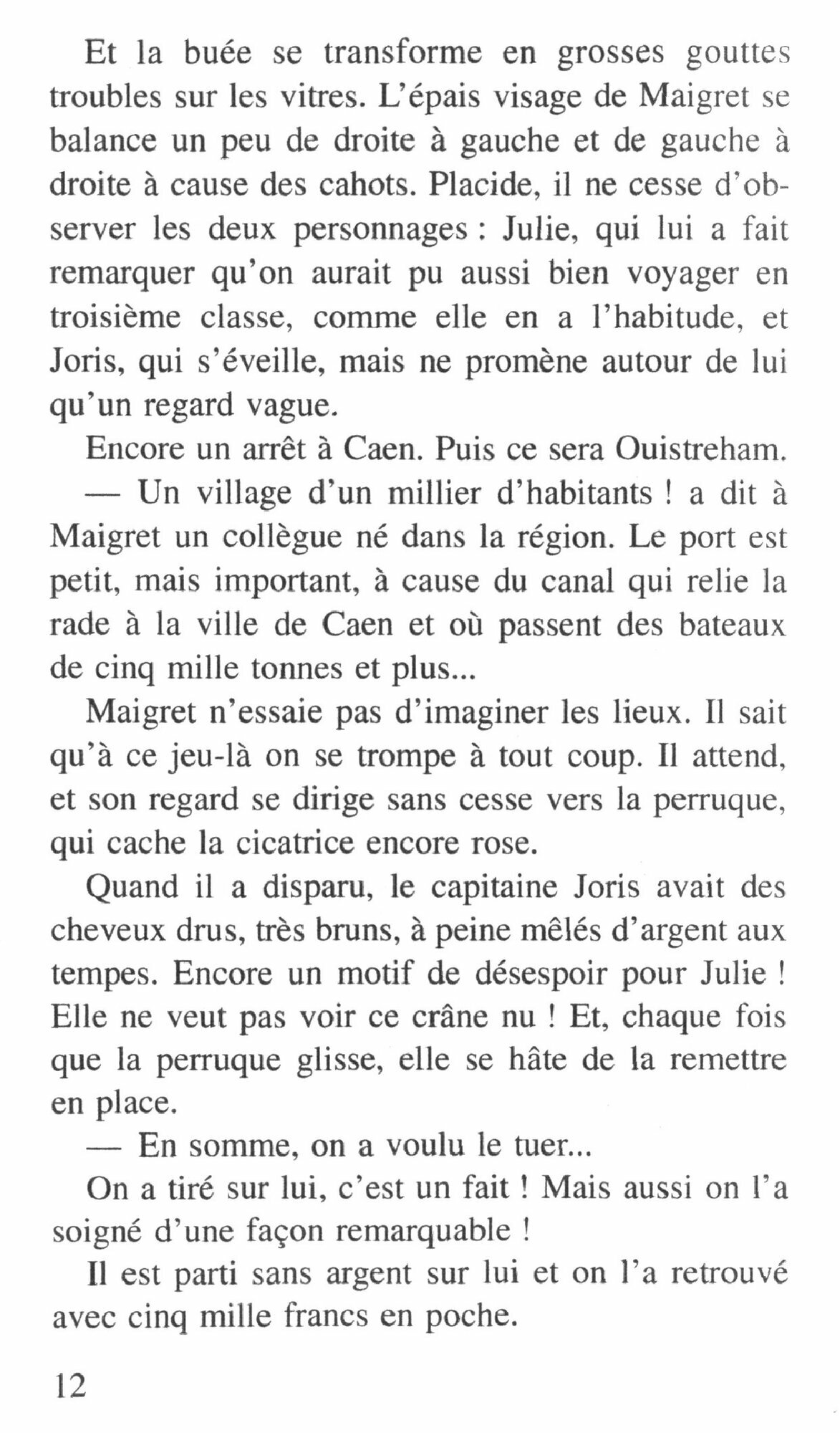 Quand on avait quitte Paris, vers trois heures, la foule s’agitait encore dans un frileux soleil d’arriere-saison. Puis, vers Mantes, les lampes du compartiment s’etaient allumees. Des Evreux, tout etait noir dehors. Et maintenant, a travers les vitres ou ruisselaient des gouttes de buee, on voyait un epais brouillard qui feutrait d’un halo les lumieres de la voie. Bien cale dans son coin, la nuque sur le rebord de la banquette, Maigret, les yeux mi-clos, observait toujours, machinalement, les deux personnages, si differents l’un de l’autre, qu’il avait devant lui. Le capitaine Joris dormait, la perruque de travers sur son fameux crane, le complet fripe. Et Julie, les deux mains sur son sac en imitation de crocodile, fixait un point quelconque de l’espace, en essayant de garder, malgre sa fatigue, une attitude reflechie. Joris ! Julie !