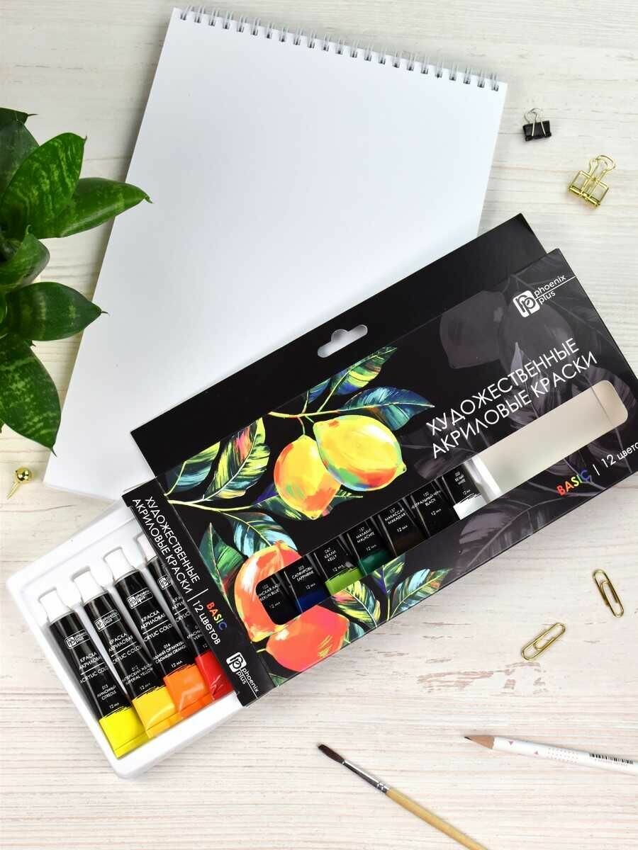 Краски акриловые Феникс+ арт. 64587/ 12 лимоны (25x12,5x2 см, 12 цветов, 12 мл, классические цвета, картонная коробка).