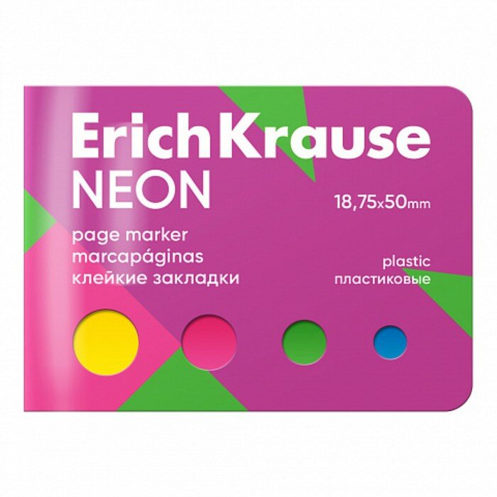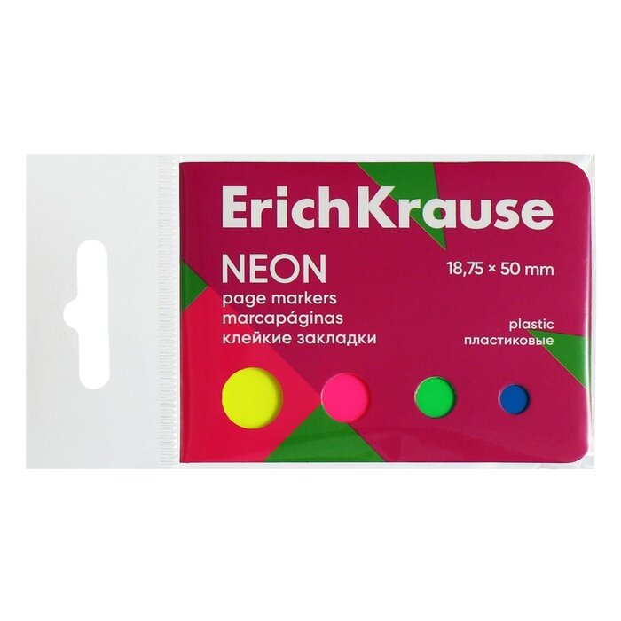 Клейкие закладки пластиковые ErichKrause предназначены для временных пометок страниц. На закладках можно делать надписи. Изготовлены из цветной полупрозрачной полимерной пленки, которая не закрывает текст страницы. Специальный клеевой состав позволяет надежно крепить и многократно переклеивать закладки, не оставляя следов и не повреждая поверхность. Размер закладки - 18.75x50 мм. В упаковке 4 неоновых цвета по 50 листов.