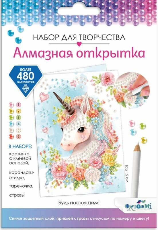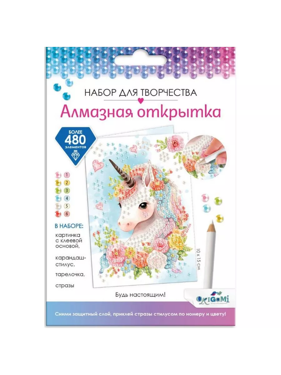 Открытка с очаровательным единорожком в формате "укрась и подари" подарит радость и веселье самым близким! Страз в комплекте оживят красочную иллюстрацию ярким блеском. Творчество-антистресс поможет расслабиться и забыть о повседневных заботах. Процесс создания позволит улучшить мелкую моторику рук и станет интересным хобби для взрослых и детей. Уютный подарок и медитация 2в1!