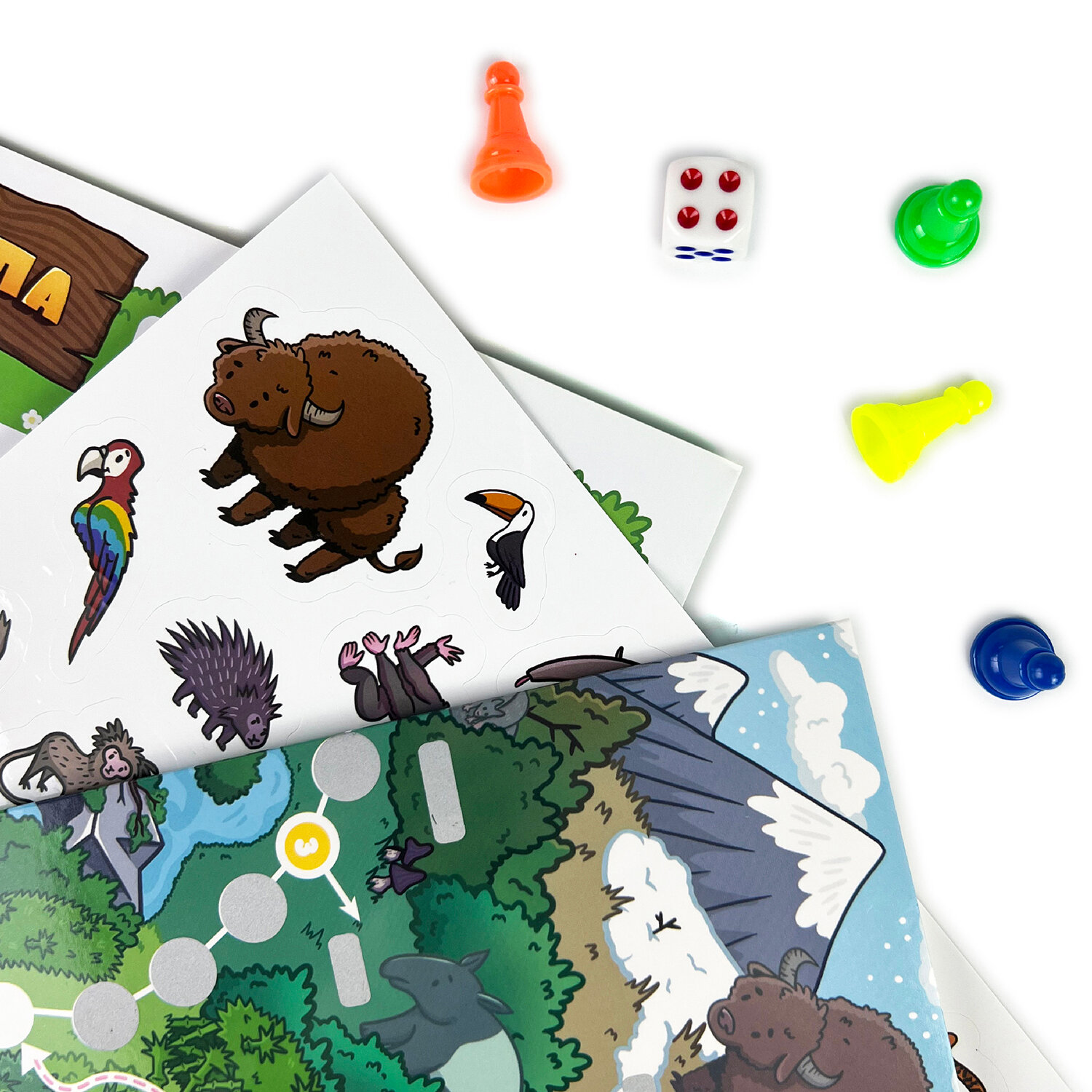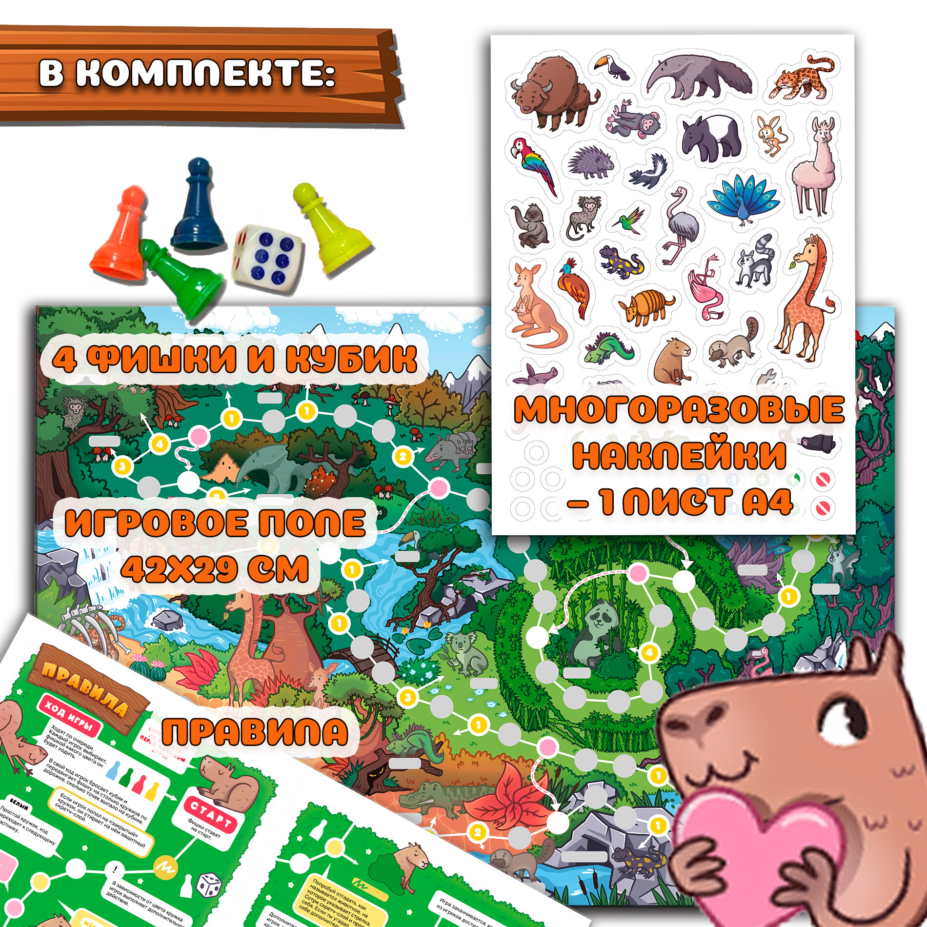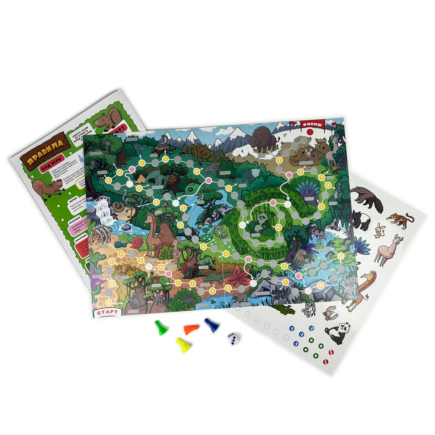 В комплекте: игровое поле, лист с наклейками, 4 фишки, кубик, правила.
