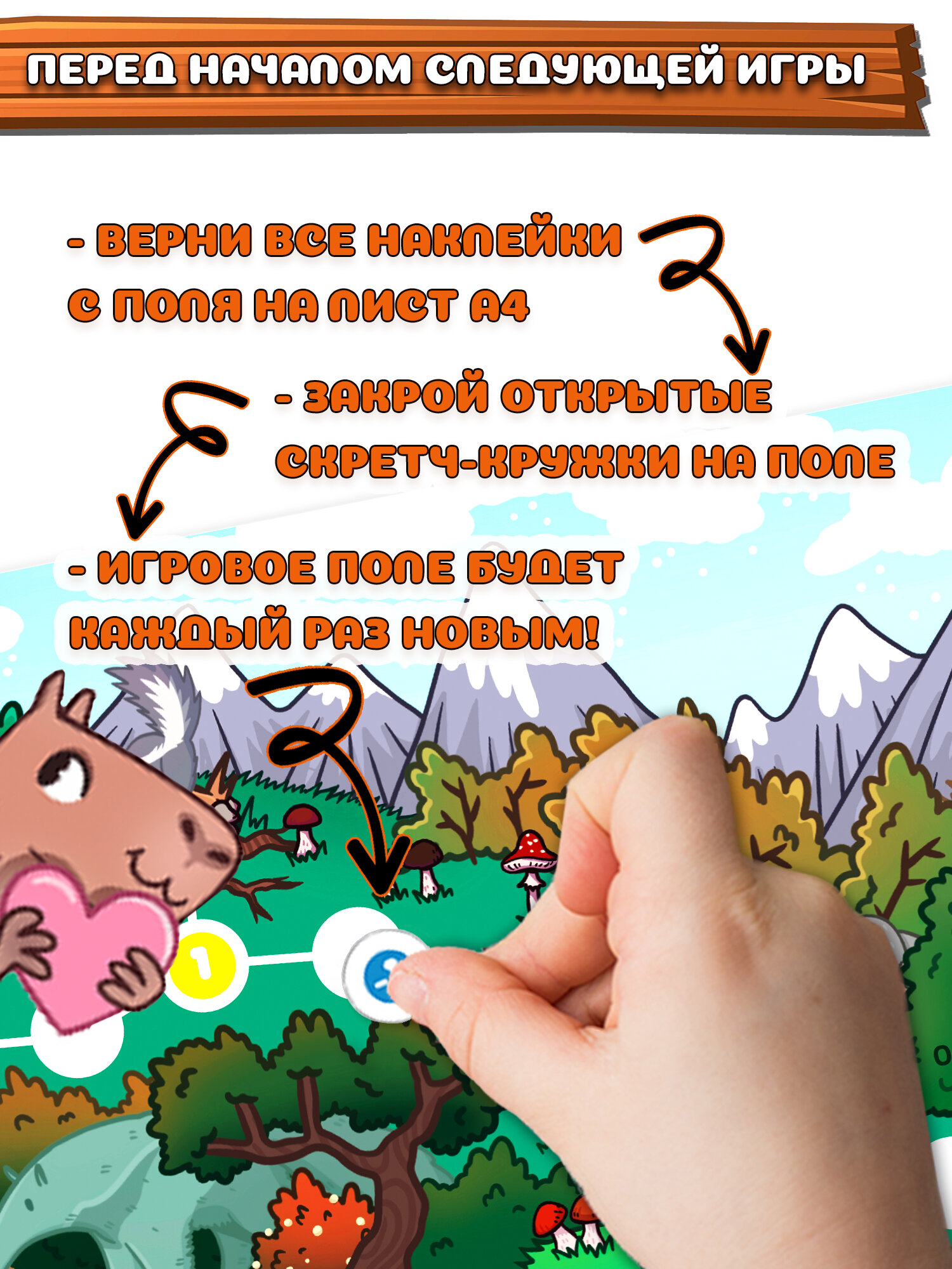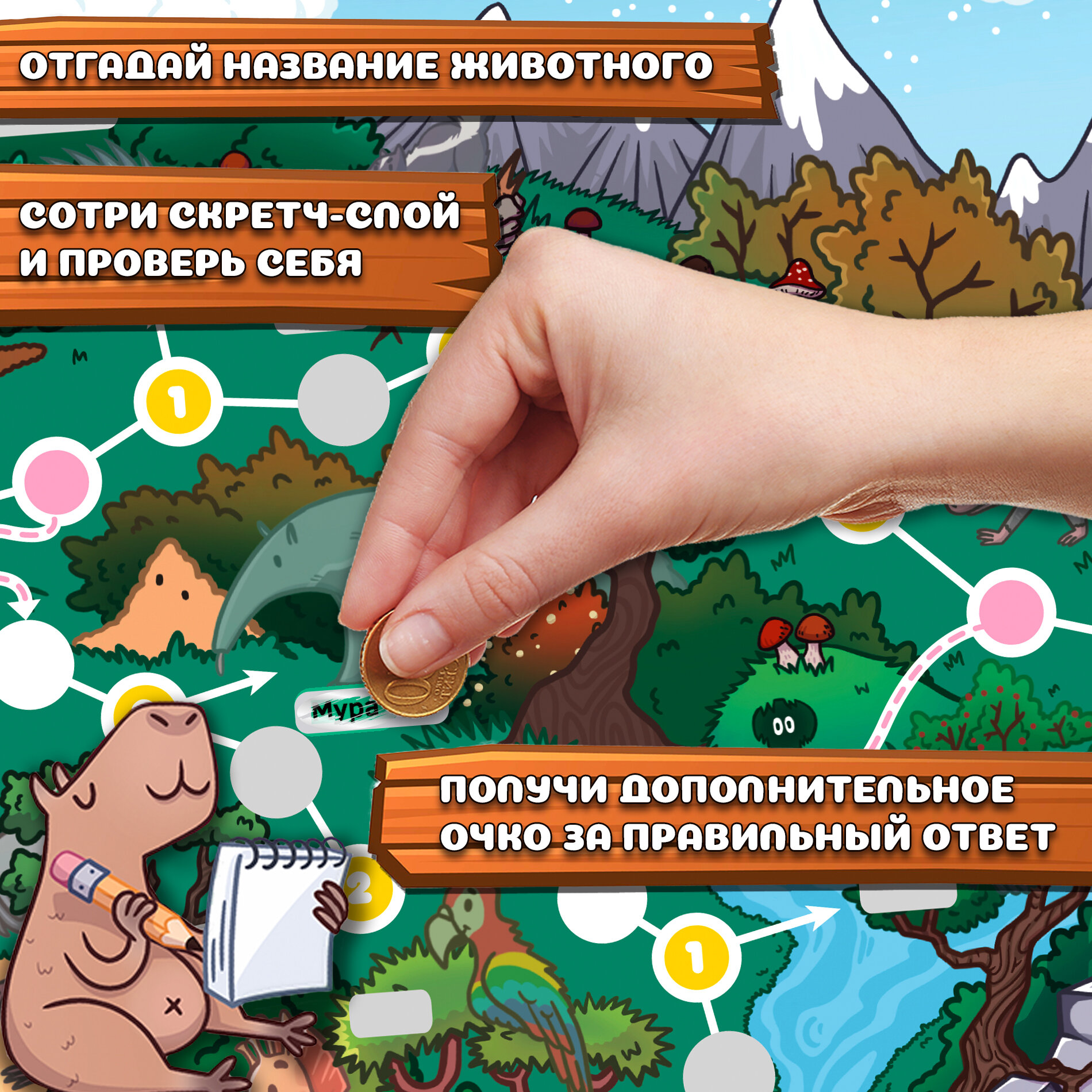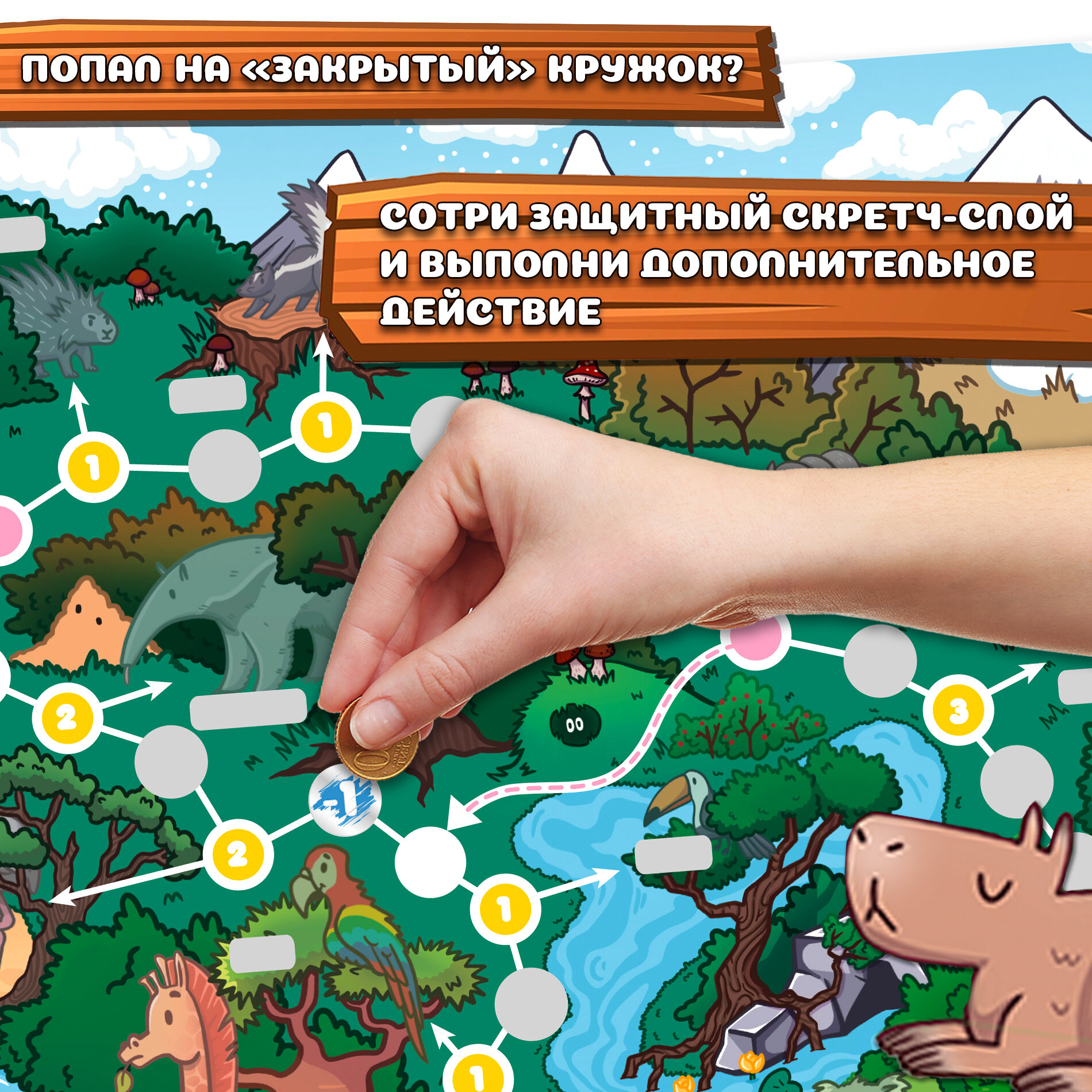 Перед вами необычная игра-ходилка с фишками и кубиком: после перемещения фишки нужно стереть защитный скретч-слой, чтобы узнать, какое приключение ждёт тебя на пути! Скретч - это слой блестящей краски, который не позволяет увидеть секретное изображение, как на лотерейном билете. Скретч-слой легко стирается и не оставляет следов на игровом поле.