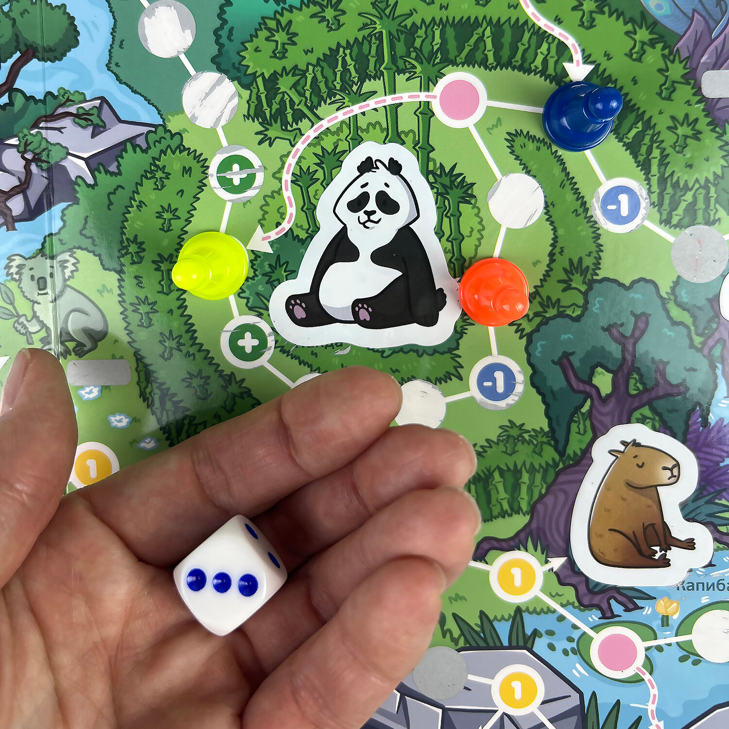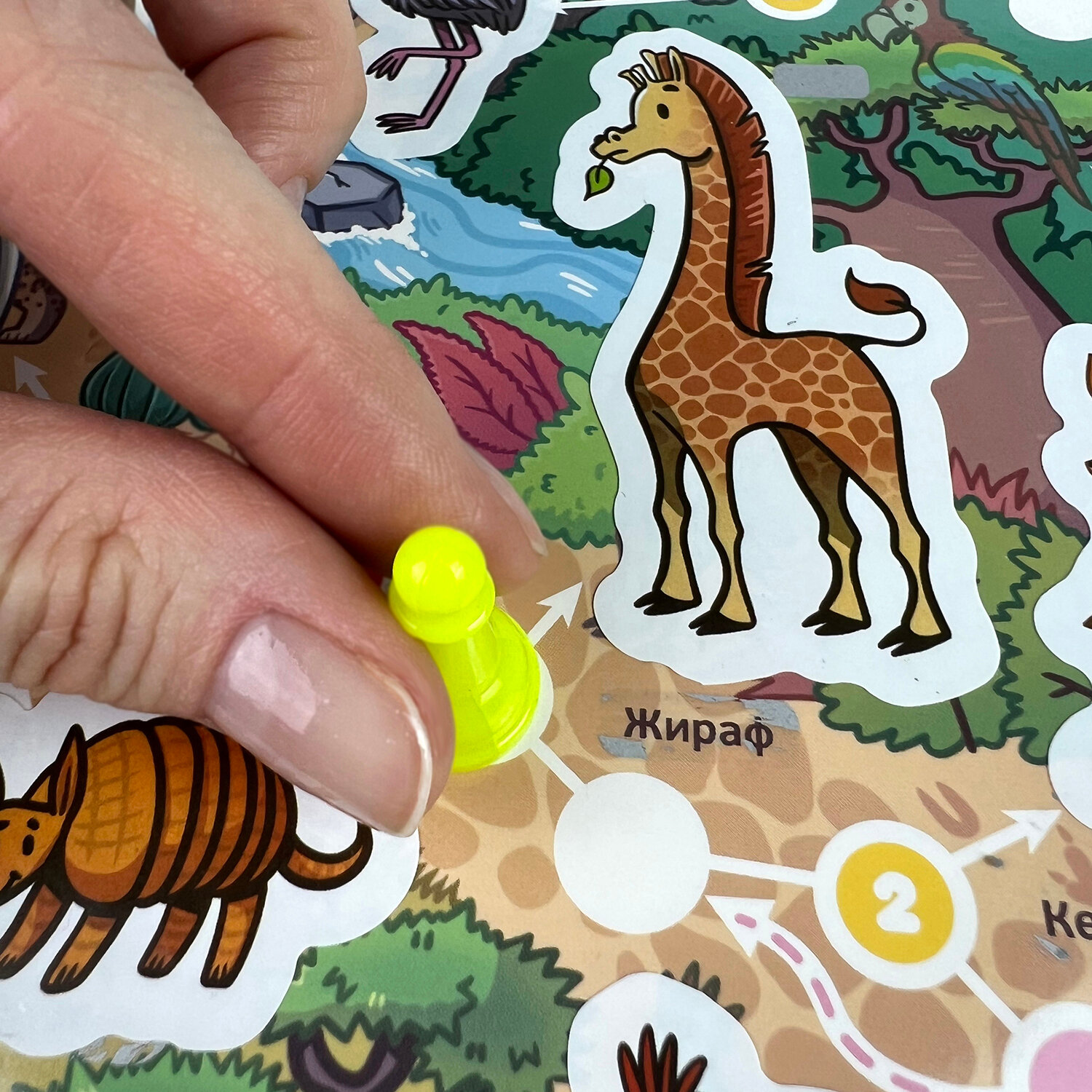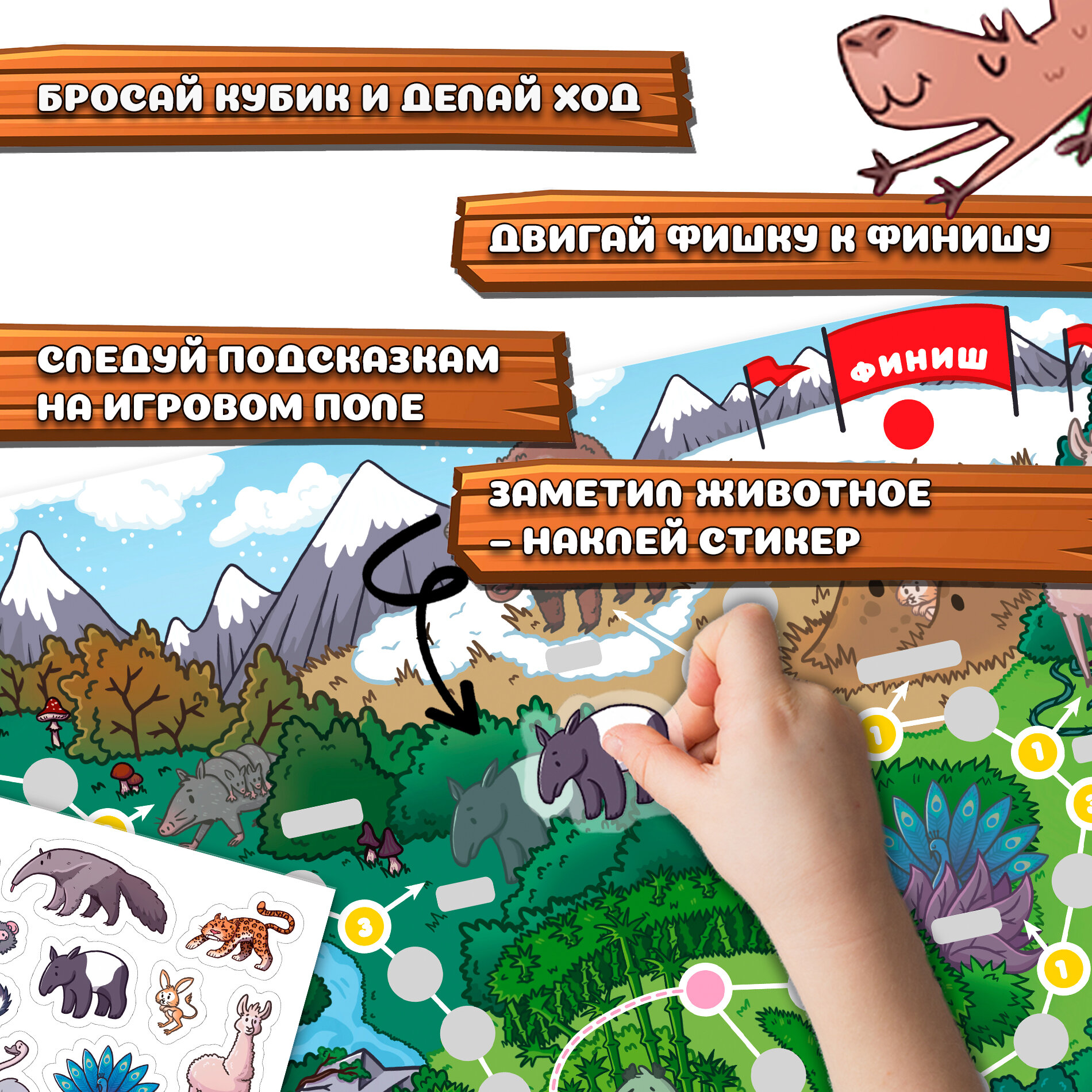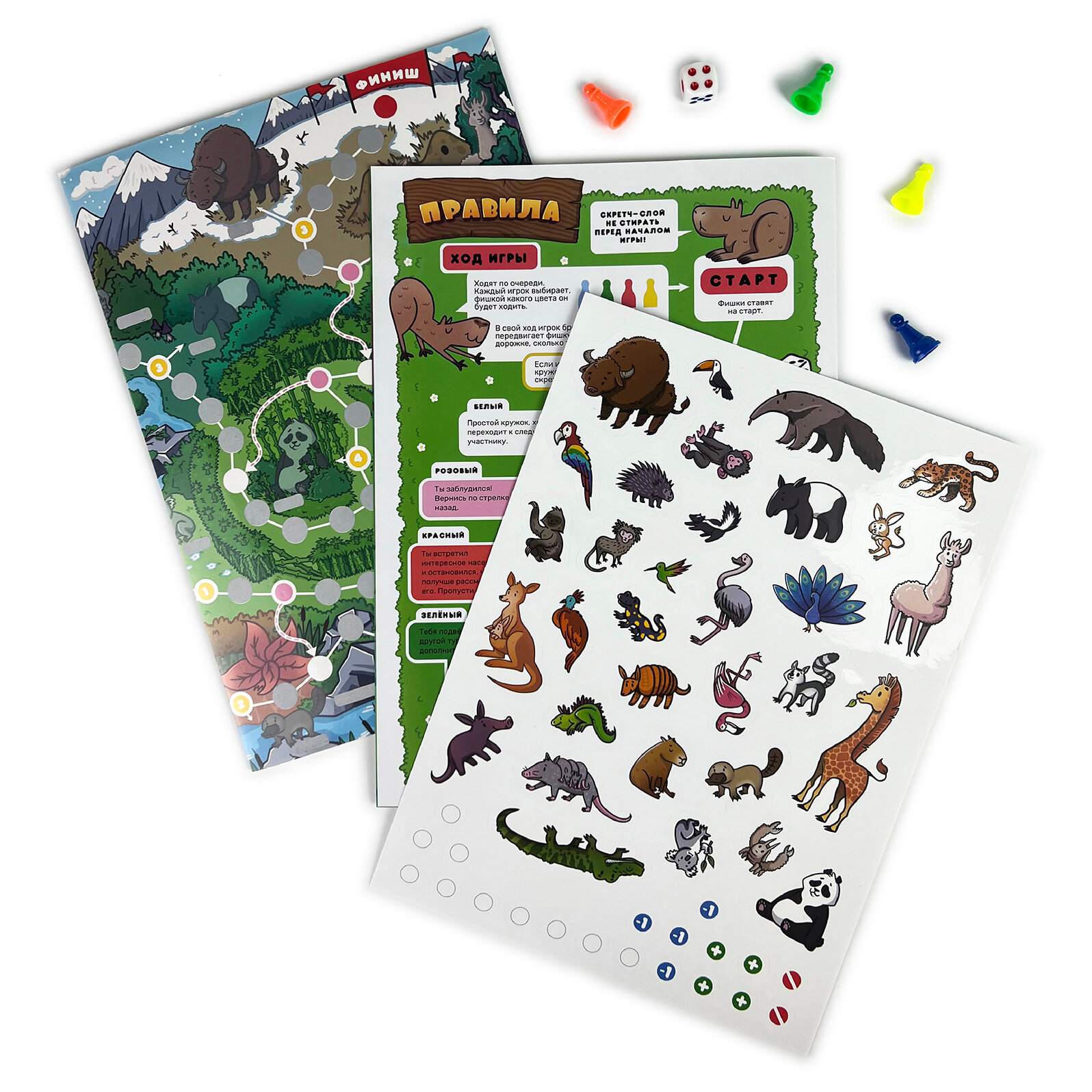 Кроме того, в игре 32 многоразовые пластиковые наклейки с животными, которые сделают игровое поле еще ярче, и 20 разноцветных наклеек, которые помогут изменять поле перед каждой игрой, делая маршрут непредсказуемым. Зарабатывай очки за редких животных, стирай скретч-слой, наклеивай наклейки!