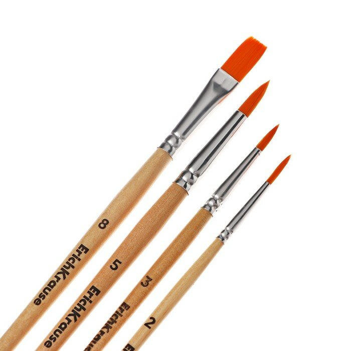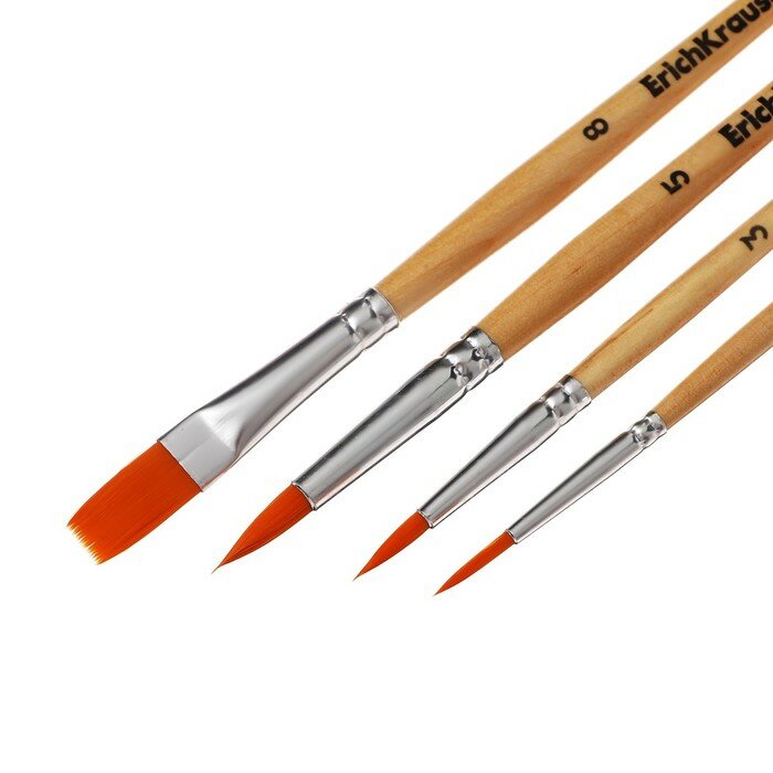 Кисти ErichKrause для рисования акварельными красками и гуашью изготовлены из синтетики. Рабочая часть кисти покрыта гуммирующим составом, защищающим ее при хранении и транспортировке. Ручка изготовлена из натурального дерева и покрыта защитным лаком. Цельнометаллическая бесшовная обойма из алюминия устойчива к коррозии. Круглые 2, 3, 5, плоская - 8.
