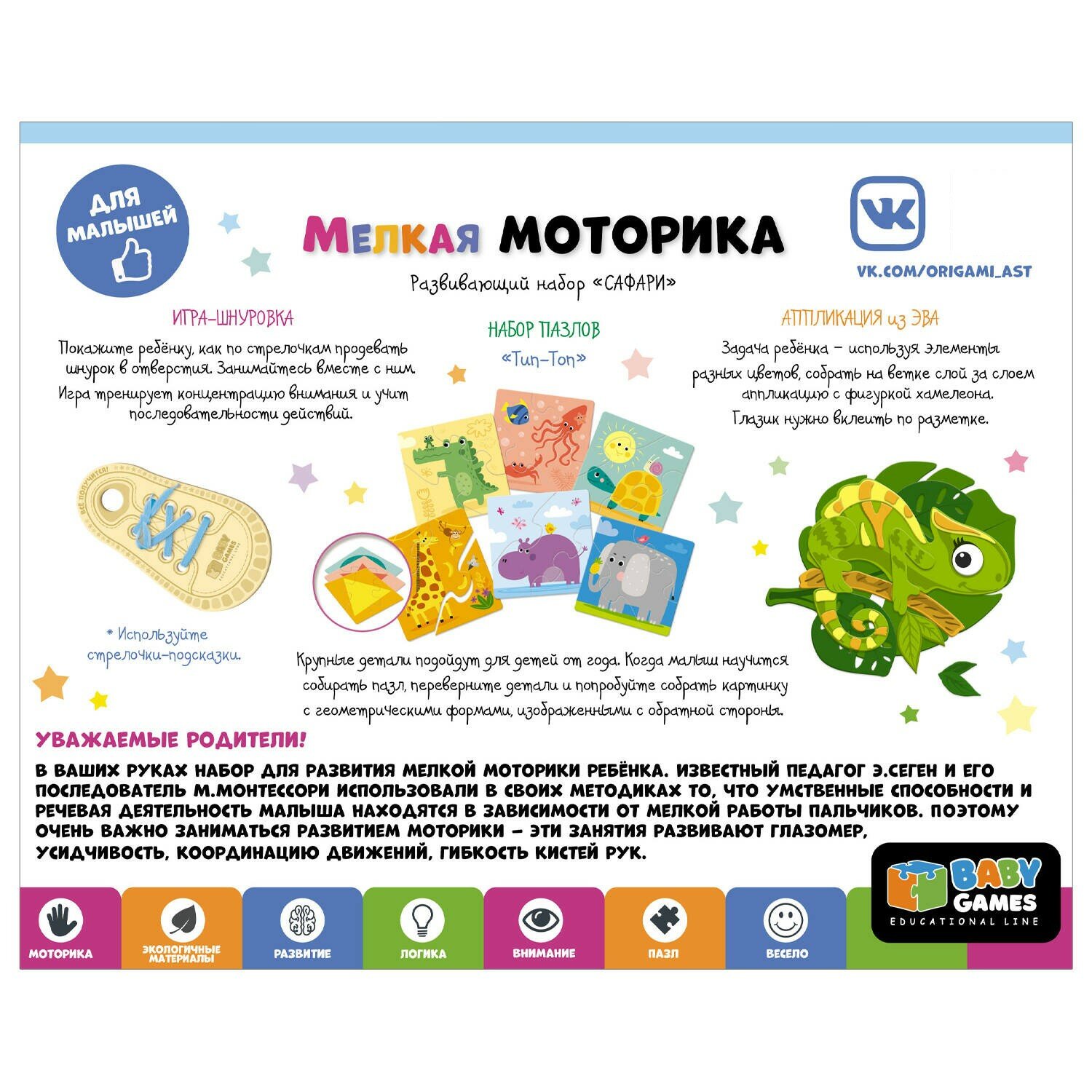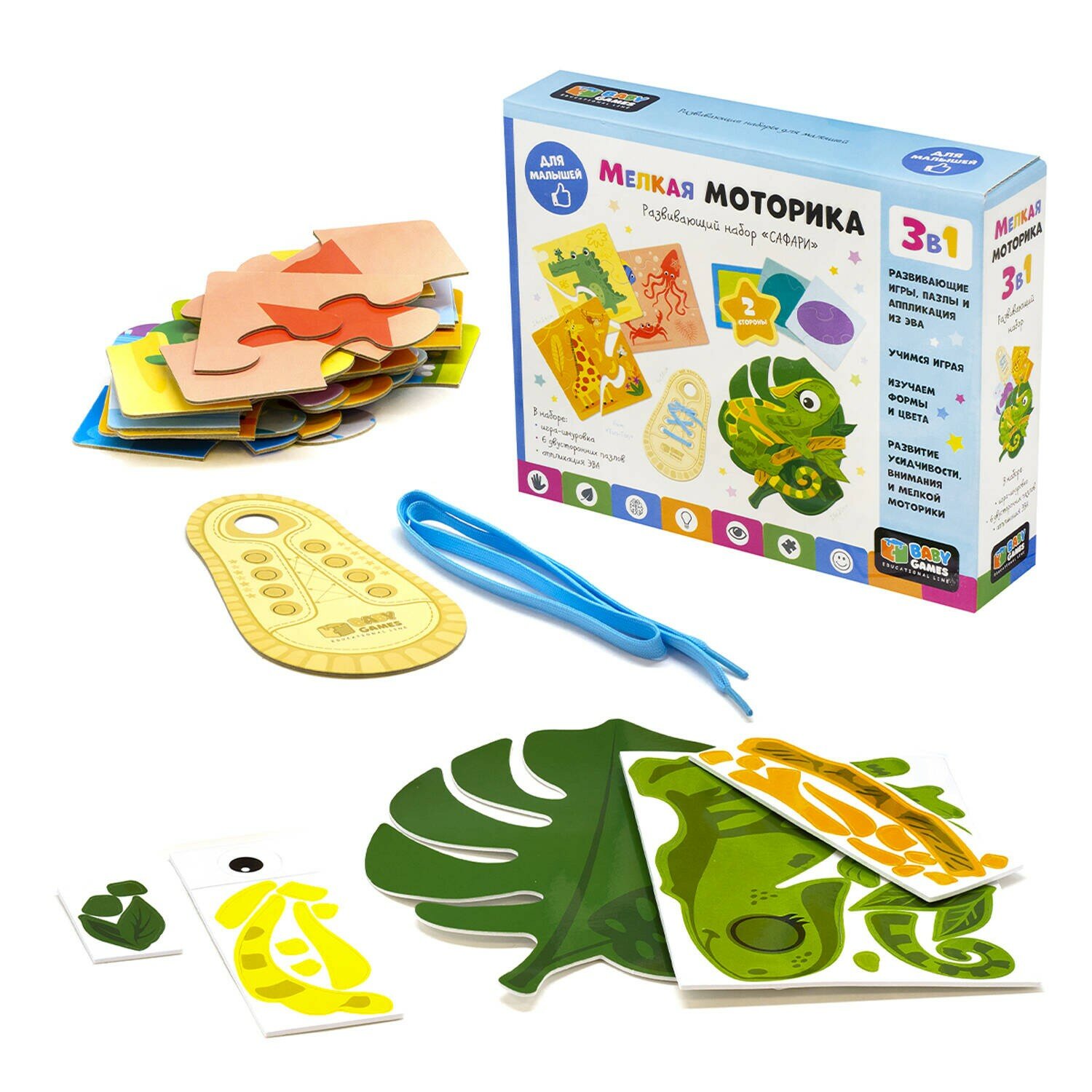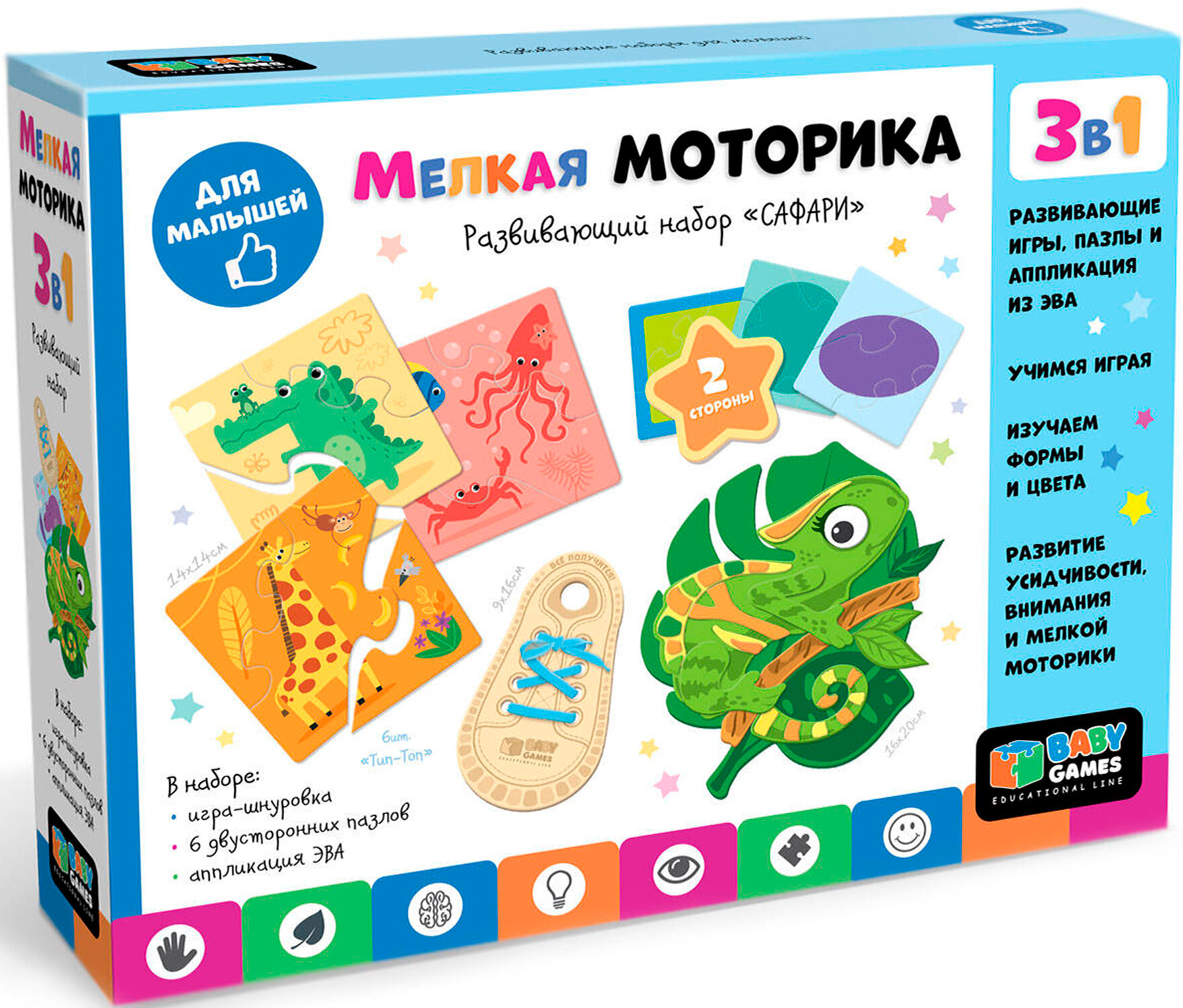 Развивающий набор 3в1 Развиваем мелкую моторику. Сафари - это уникальный набор, включающий в себя ряд развивающих настольных игр, благодаря которым ребёнок научится собирать пазлы, создаст своими руками аппликацию из Эвы и начнет развивать мелкую моторику благодаря игре- шнуровке! Развивающий набор «3в1» – это не только отличная возможность сделать окружающий мир ярче, но и самый лучший способ увлечь ребёнка, рассказав ему в игре о пока ещё новых для него, но очень нужных и увлекательных вещах!