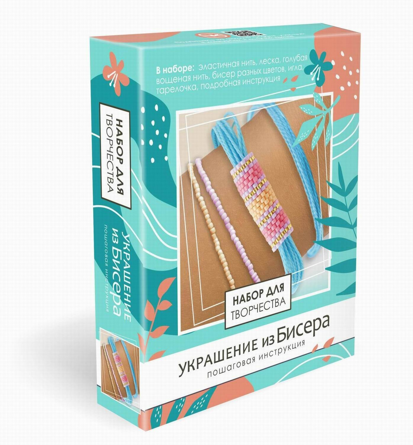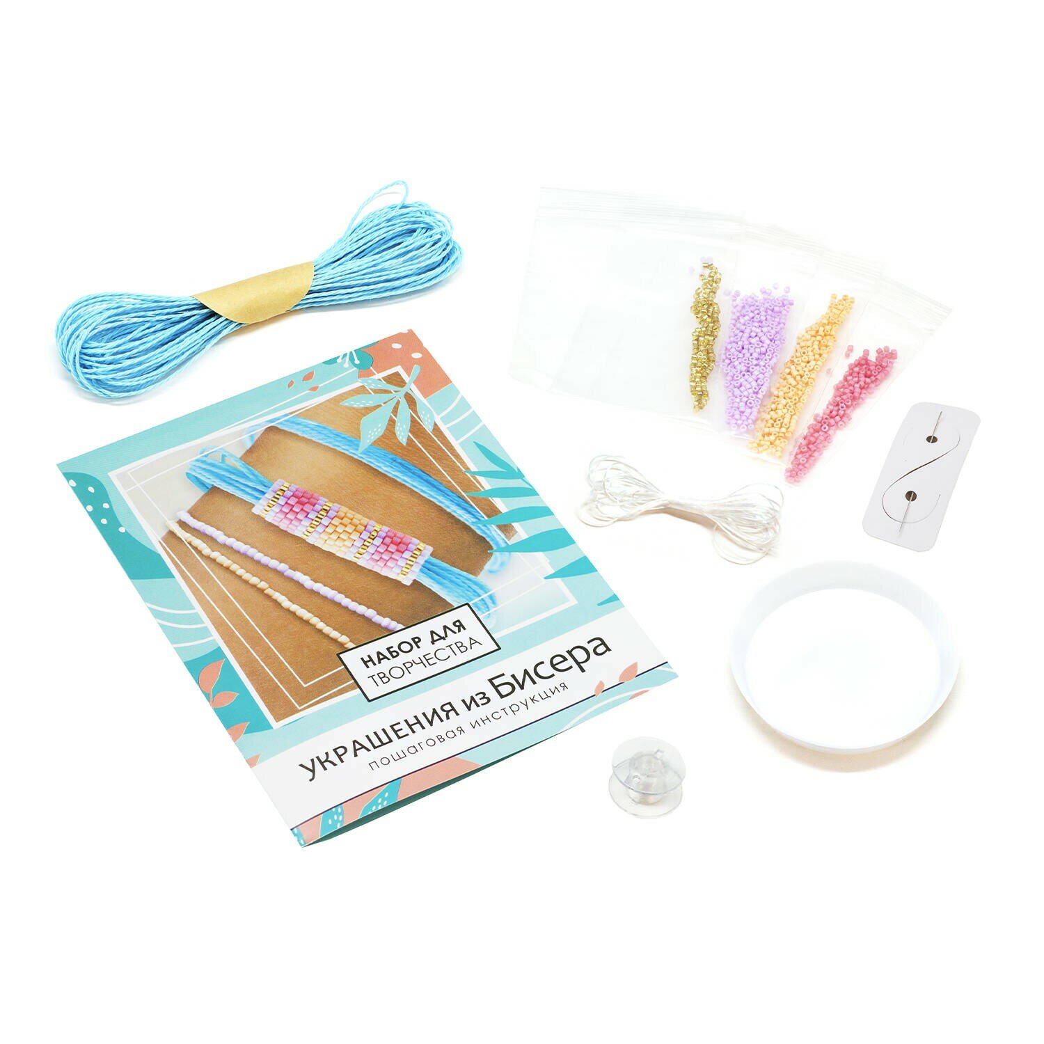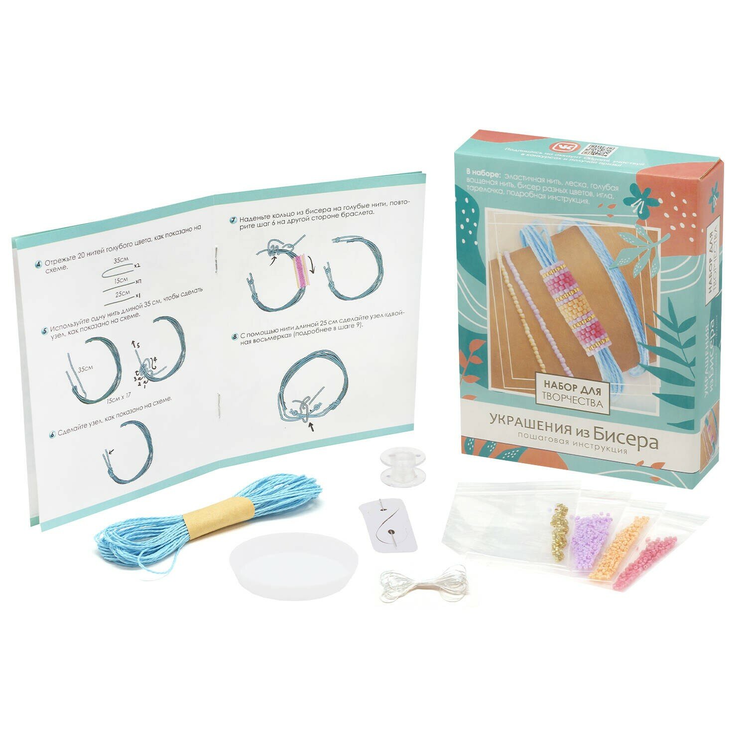 В наборе: эластичная нить, леска, голубая вощеная нить, бисер разных цветов, игла, тарелочка, инструкция.
