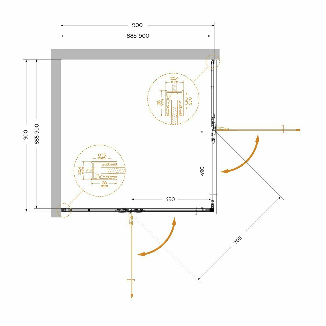 - Размеры с диапазоном регулировок (ШхД): 885-900х885-900 мм.