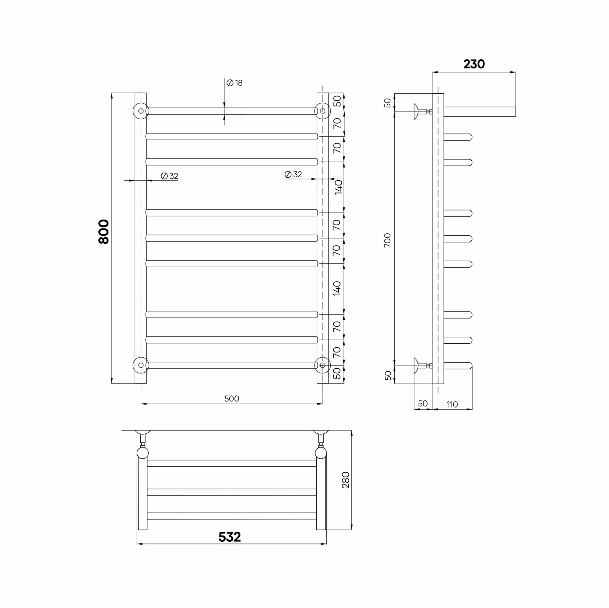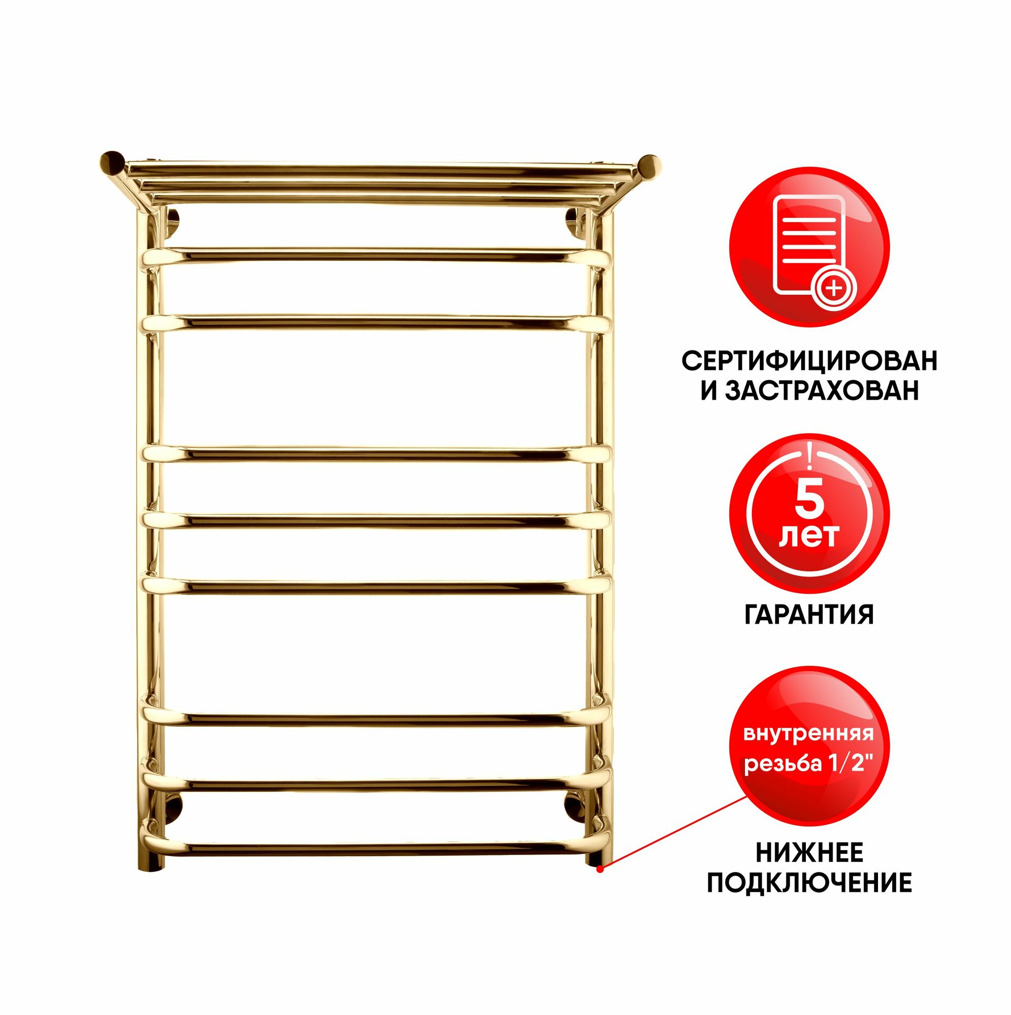 Полотенцесушитель водяной INDIGO Brace с полкой в размере 800х500 (ВхШ) выбирают за его скобообразные перекладины и функциональность. Модель изготовлена из высококачественной нержавеющей стали. Качественная металлообработка в местах подключений обеспечивает плотное прилегание прокладки. Изделие с безупречным блеском в золотом цвете. Комплектация включает в себя полный набор для подключения - к3. Полотенцесушитель INDIGO Brace застрахован и имеет гарантию.Выбирая INDIGO, вы получаете надежный продукт из нержавеющей стали с гарантией качества от Российского производителя.