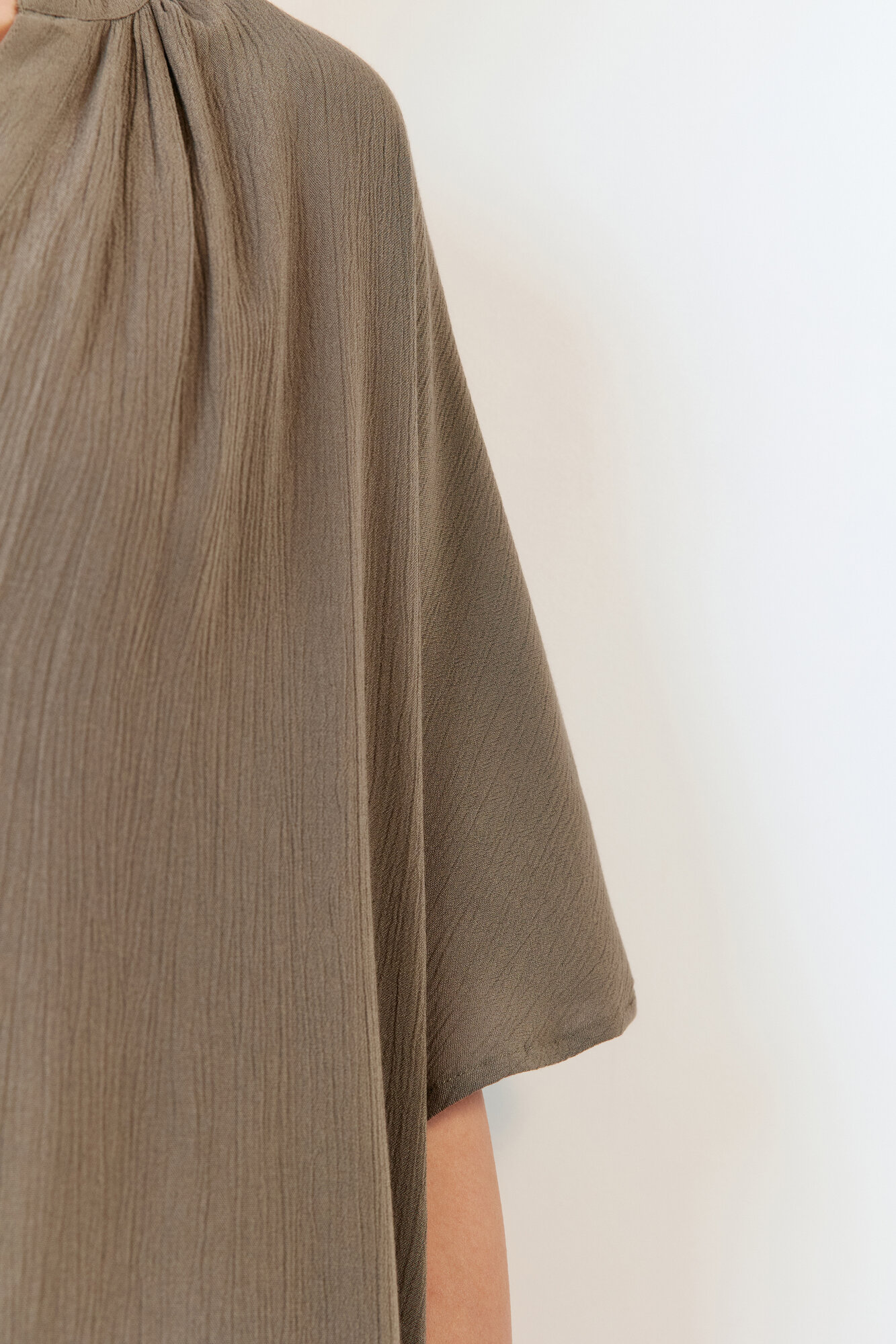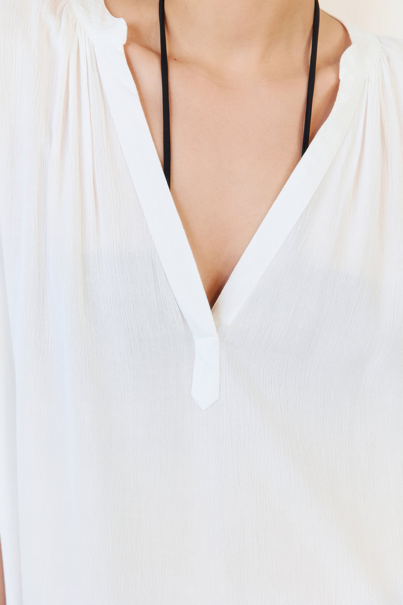 - Короткие свободные рукава с прямыми манжетами и спущенной линией плеча, глубокий V-образный вырез на груди