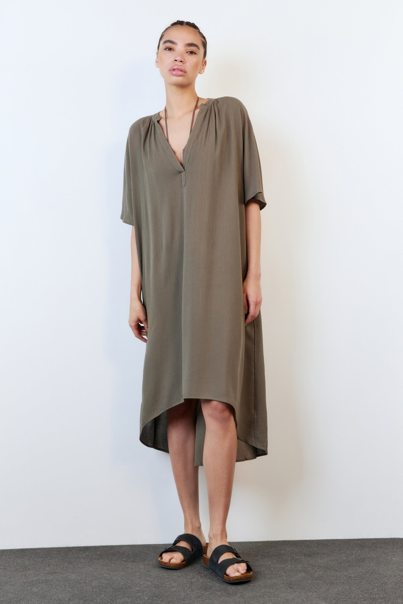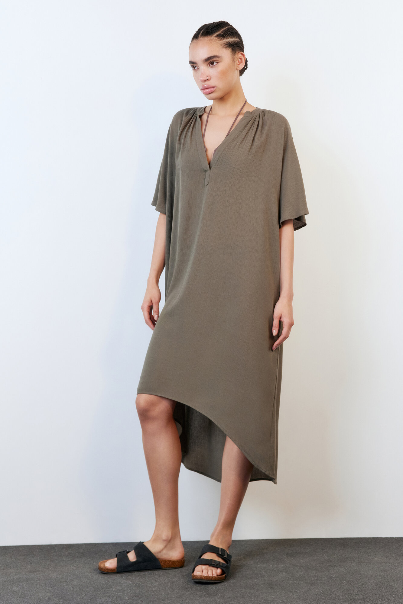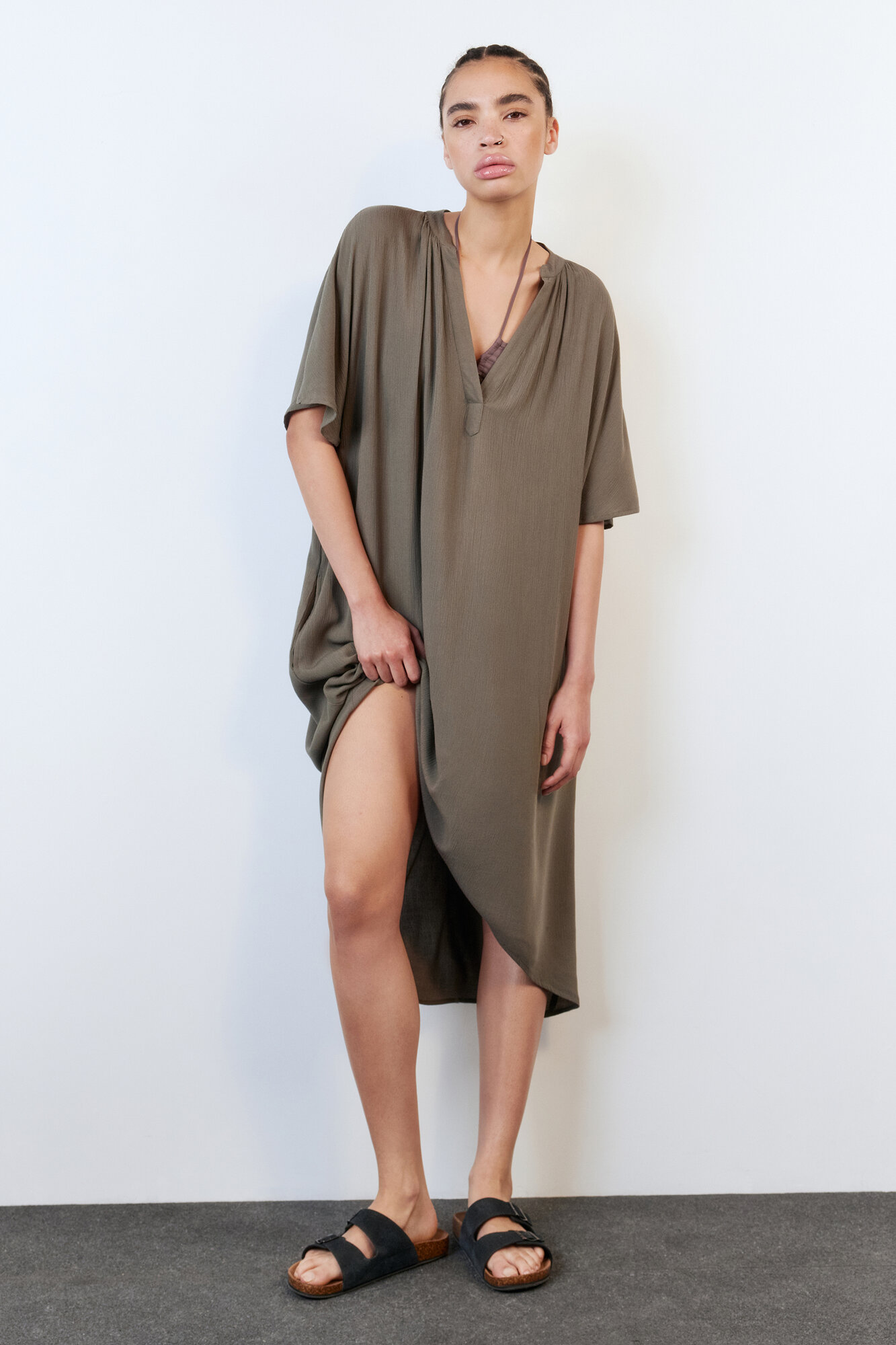 - Однотонная белая / хаки пляжная туника для расслабленных образов в отпуске