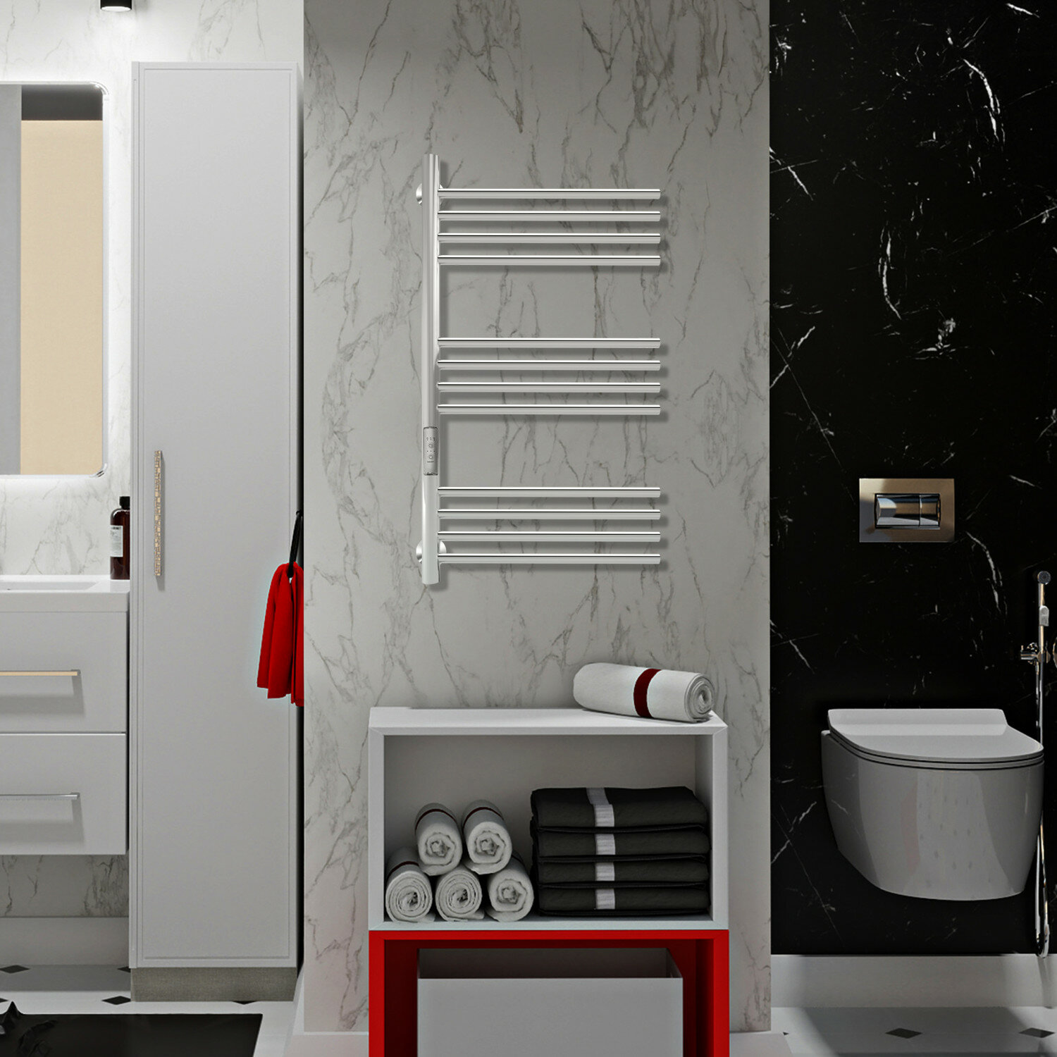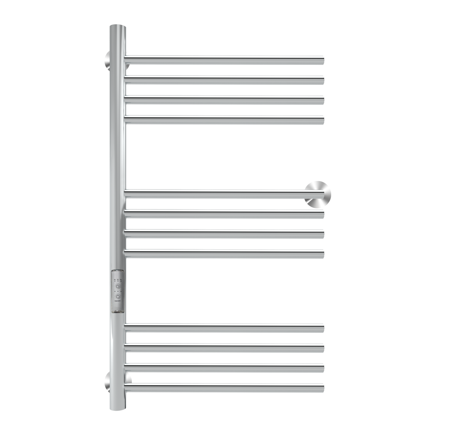 Полотенцесушитель электрический INDIGO Family хром. Полотенцесушитель с одной стойкой, имеет 3 держателя для надежной фиксации на стене.Хромированное изделие с блестящей поверхностью, которое достигается путем электрохимической полировки. Перекладины удобны для размещения большого количества текстильных вещей на просушивание, подходит для большой семьи. С помощью терморегулятора можно регулировать температуру в диапазоне от 40 до 50 градусов (с шагом 5 градусов) — уровень температуры показывается количеством горящих светодиодов. Таймер можно настроить на отключение через 2, 4, 6 часов.Возможно скрытое подключение, а также прямое подключение в розетку, шнур расположен слева изделия, длина 1,1 м.В комплектацию входят: 3 телескопических держателя, комплект монтажа (дюбели и саморезы), инструкция с гарантийным талоном. Гарантия от производителя 3 года. Срок службы изделия не ограничен.
