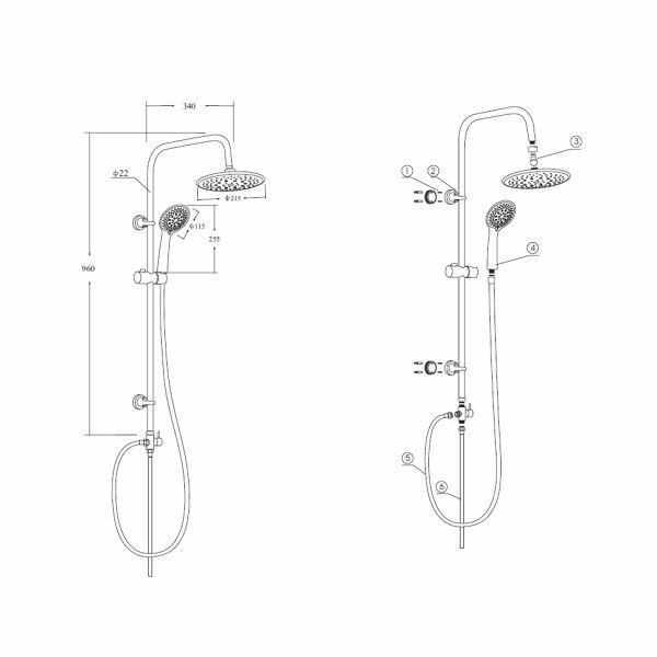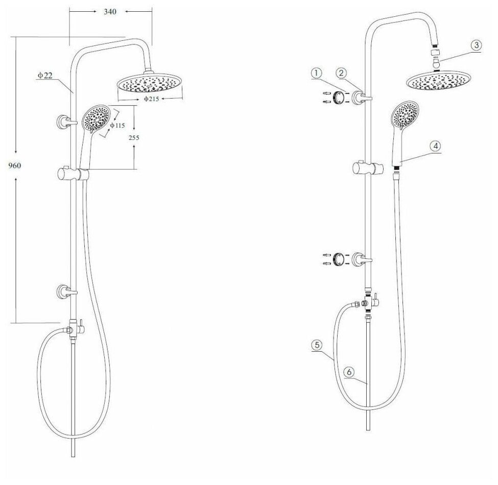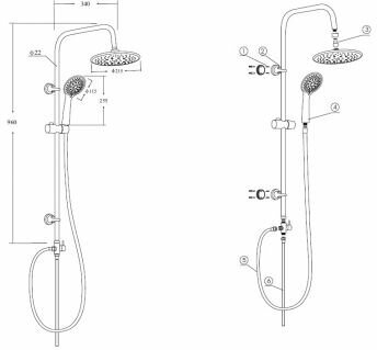 - Комплектация: стойка душевая 1 шт., лейка нижняя 1 шт., лейка верхняя 1 шт., дивертор 1 компл., держатель для лейки 1 шт., паспорт 1 шт., крепеж 1 компл.