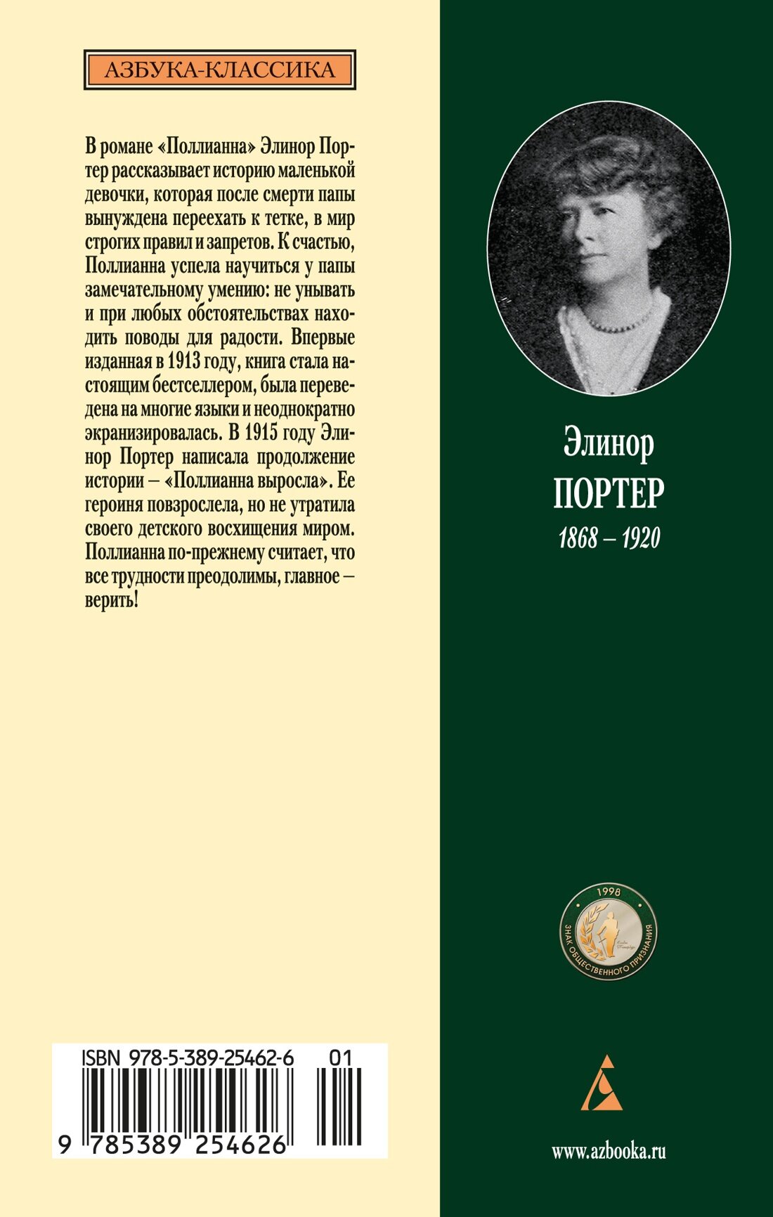 В романе «Поллианна» Элинор Портер рассказывает историю маленькой девочки, которая после смерти папы вынуждена переехать к тетке, в мир строгих правил и запретов. К счастью, Поллианна успела научиться у папы замечательному умению: не унывать и при любых обстоятельствах находить поводы для радости. Впервые изданная в 1913 году, книга стала настоящим бестселлером, была переведена на многие языки и неоднократно экранизировалась. В 1915 году Элинор Портер написала продолжение истории — «Поллианна выросла». Ее героиня повзрослела, но не утратила своего детского восхищения миром. Поллианна по-прежнему считает, что все трудности преодолимы, главное — верить!