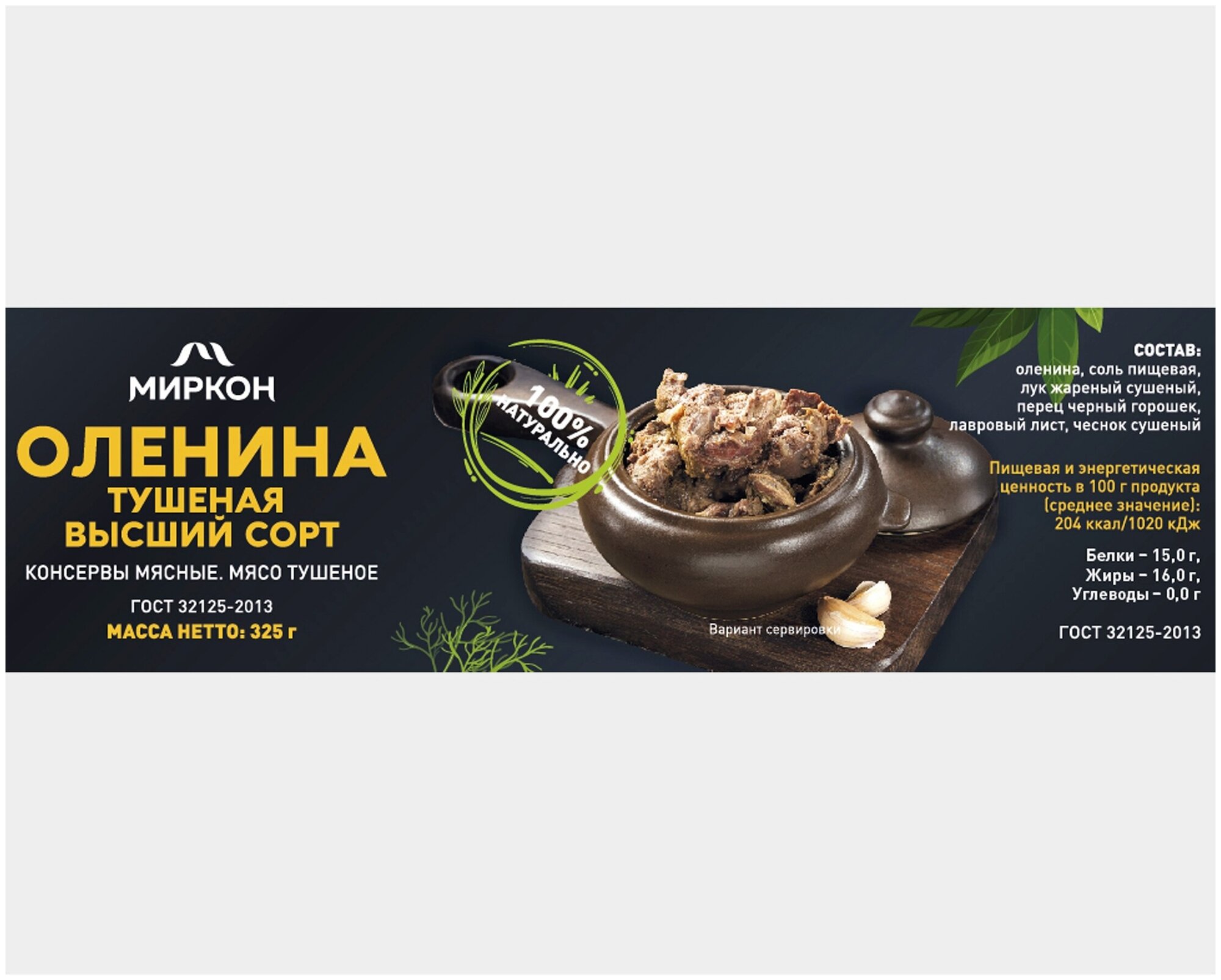 Продукция миркон выполнена в соответствии с гостом 32125-2013, по которому содержание мяса составляет не менее 80%, на полностью автоматизированных линиях, с контролем качества в лаборатории каждой партии. Всё для того, чтобы Вы смогли насладиться изысканым вкусом, полностью натурального продукта без консервантов, красителей, усилителей вкуса и ГМО. Упаковано в железную банку с кольцом для Вашего удобства. Желаем приятного аппетита!