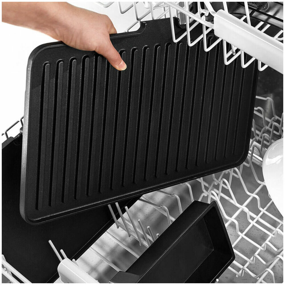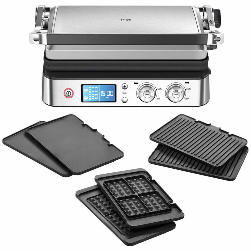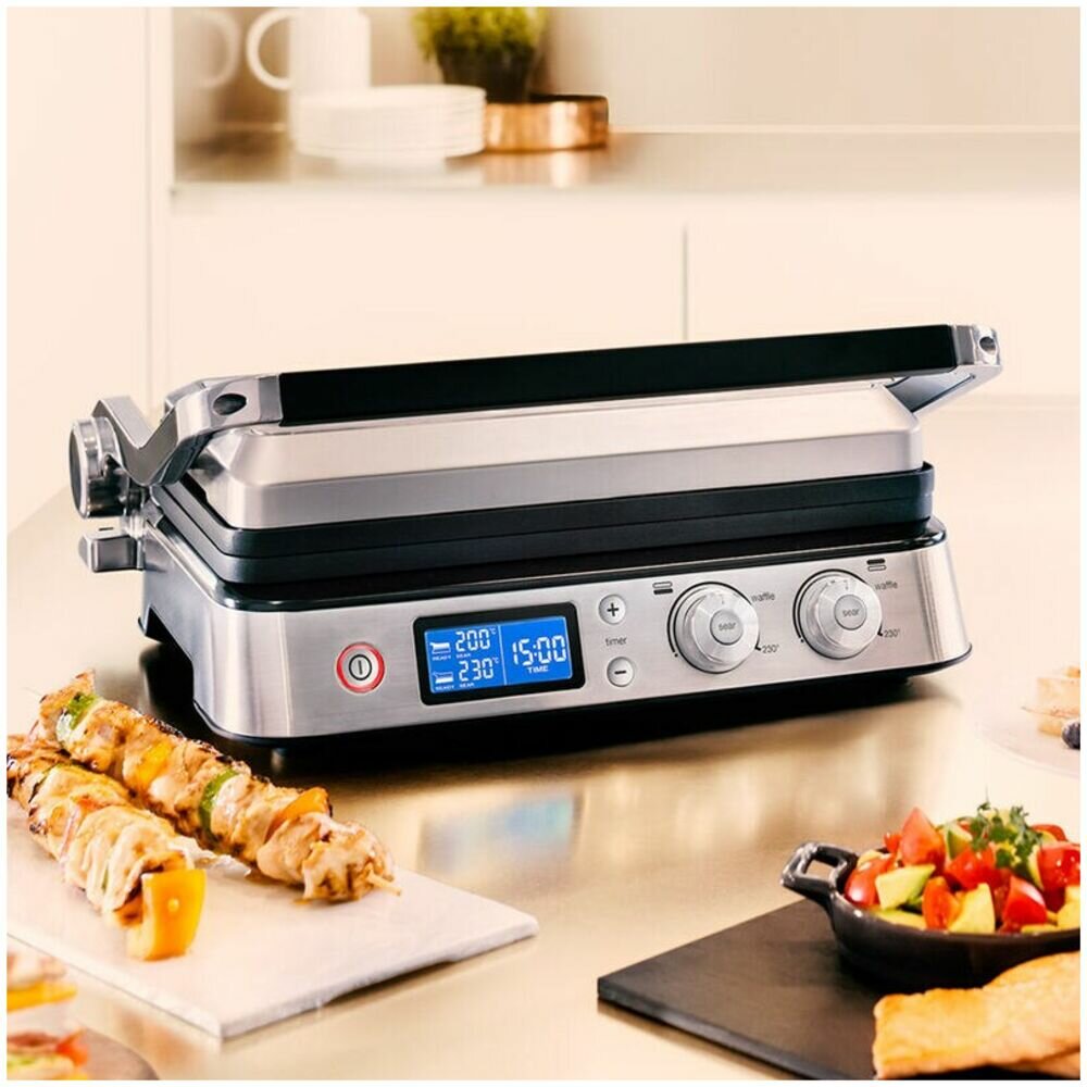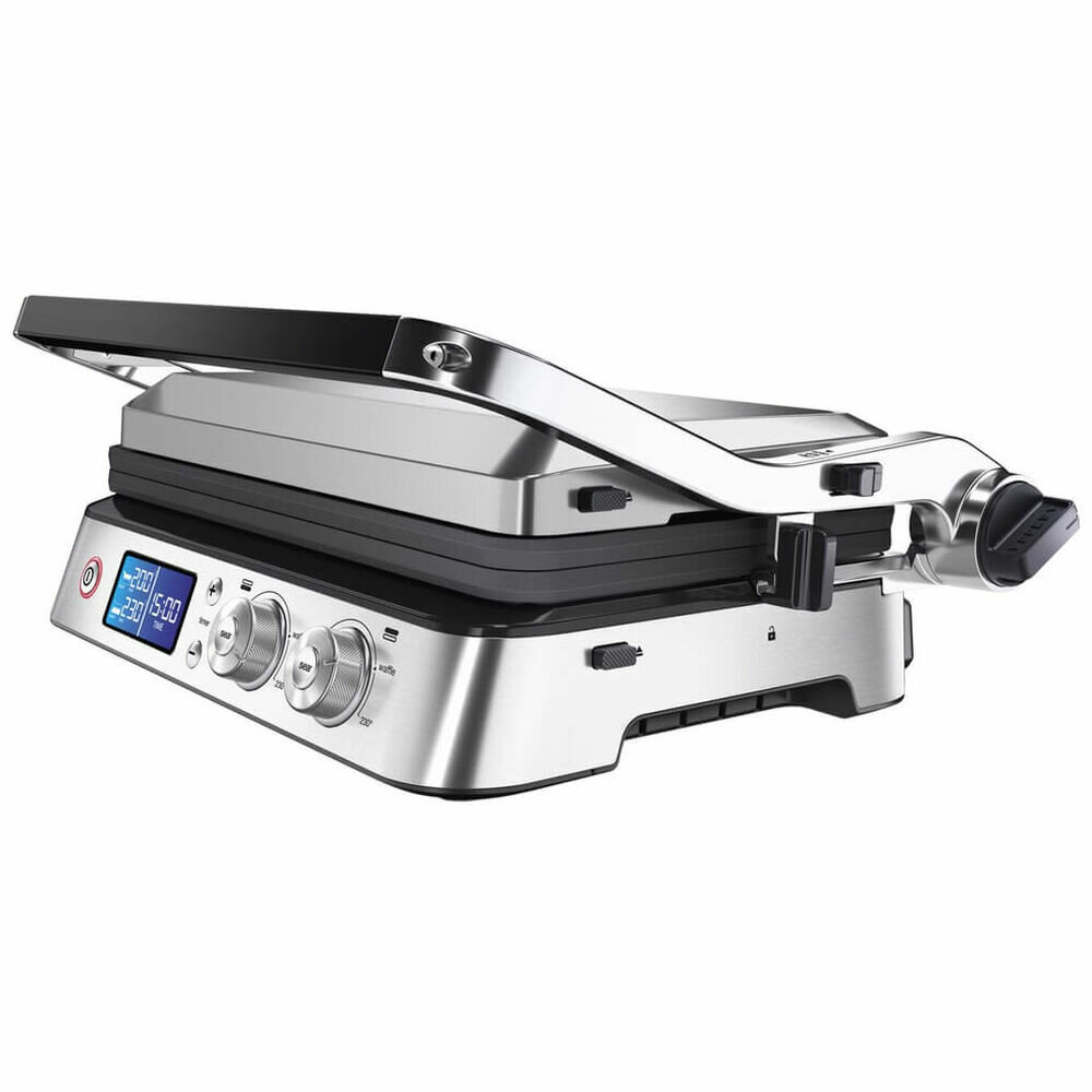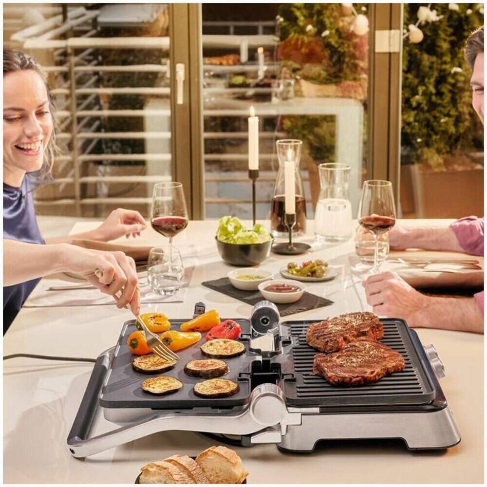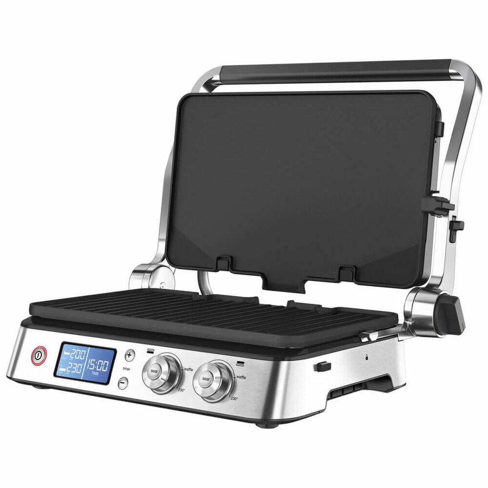 Многофункциональный контактный гриль с 3 в 1 положениями приготовления, 3 наборами пластин, встроенными нагревательными элементами, независимыми электронными термостатами, функцией "Обжарка", съемным поддоном для жира, элементами, которые можно мыть в посудомоечной машине.