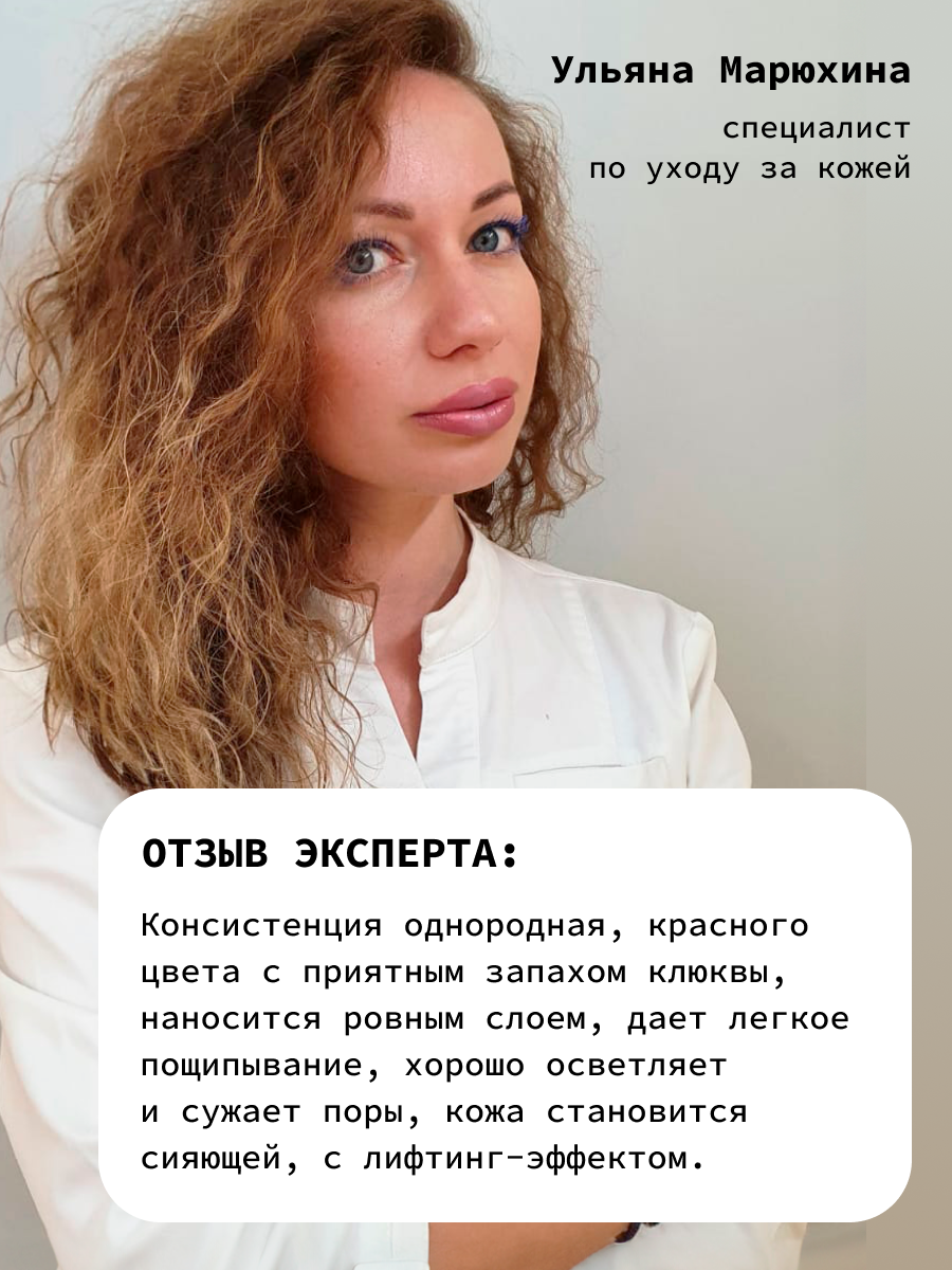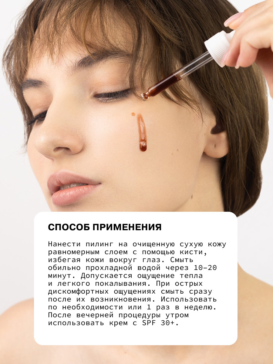 | Способ применения | Нанести пилинг на очищенную сухую кожу равномерным слоем с помощью кисти, избегая кожи вокруг глаз. Смыть обильно прохладной водой через 1020 минут. Допускается ощущение тепла и легкого покалывания. При острых дискомфортных ощущениях смыть сразу после их возникновения. Использовать по необходимости или 1 раз в неделю. После вечерней процедуры утром использовать крем с SPF 30+. |