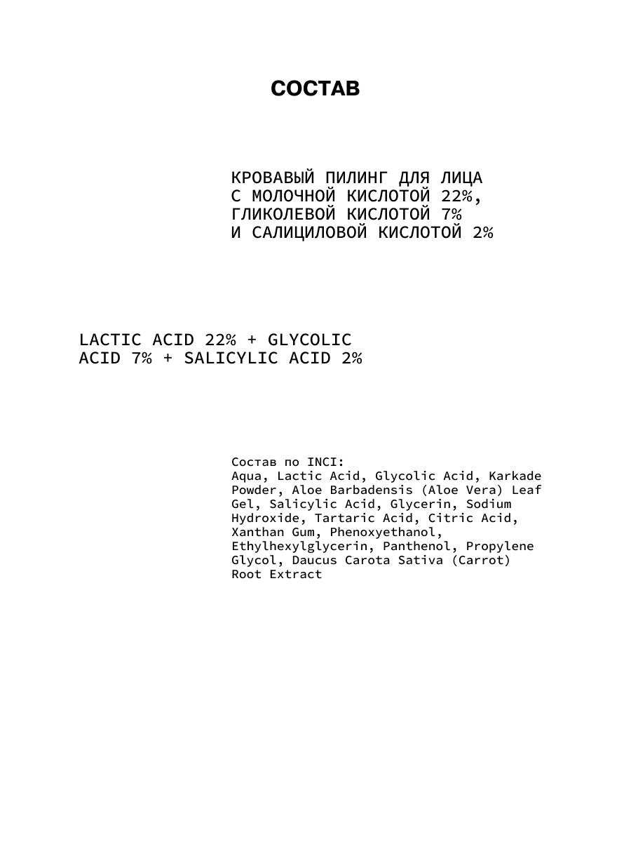 | Состав | Aqua, Lactic Acid, Glycolic Acid, Karkade Powder, Aloe Barbadensis (Aloe Vera) Leaf Gel, Salicylic Acid, Glycerin, Sodium Hydroxide, Tartaric Acid, Citric Acid, Xanthan Gum, Phenoxyethanol, Ethylhexylglycerin, Panthenol, Propylene Glycol, Daucus Carota Sativa (Carrot) Root Extract. |