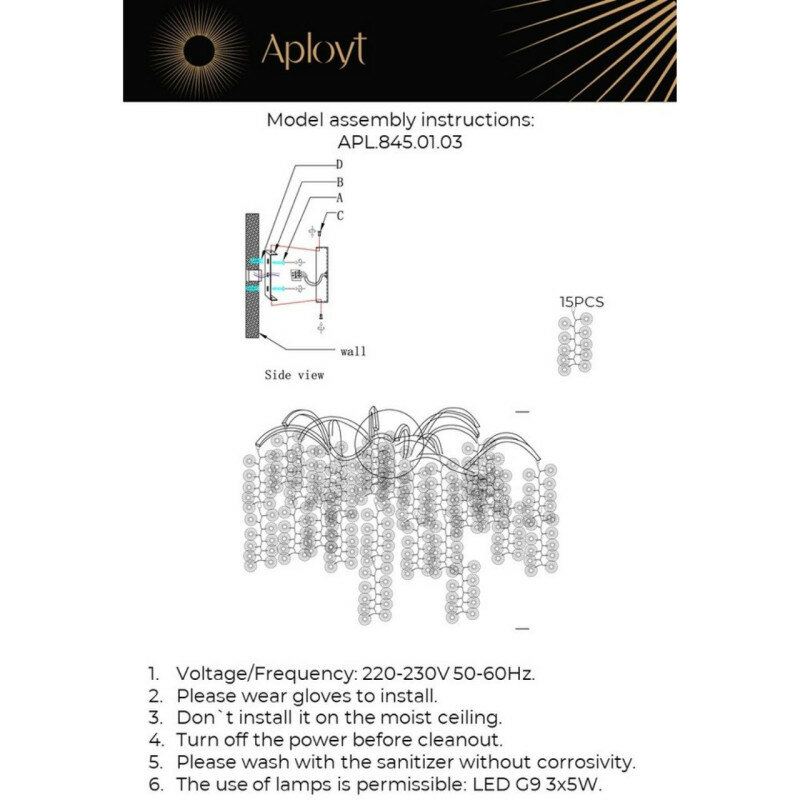 Настенный светильник Aployt Aurora бренда Aployt из Польши коллекции Aurora в стиле Неоклассика. Одна из зон рекомендованных к размещению (необязательно) В спальню. Место расположения - На стену. Материал плафона/абажура - Хрусталь. Цвет плафона/абажура - Прозрачный. Форма плафона - Декоративный. Направление абажуров/плафонов: В стороны. Количество плафонов/абажуров - 1. Материал арматуры - Металл. Цвет арматуры - Золото. Тип крепления: Монтажная пластина. Тип подключаемых ламп: Светодиодная цоколя G9. Световой поток, лм: 825. Мощность лампы, W: 5. Общая мощность, W: 15. Количество ламп - 3. Напряжение - 220. Степень защиты (IP): 20. Высота, мм - 350. Ширина, мм - 380. Длина, мм - 240