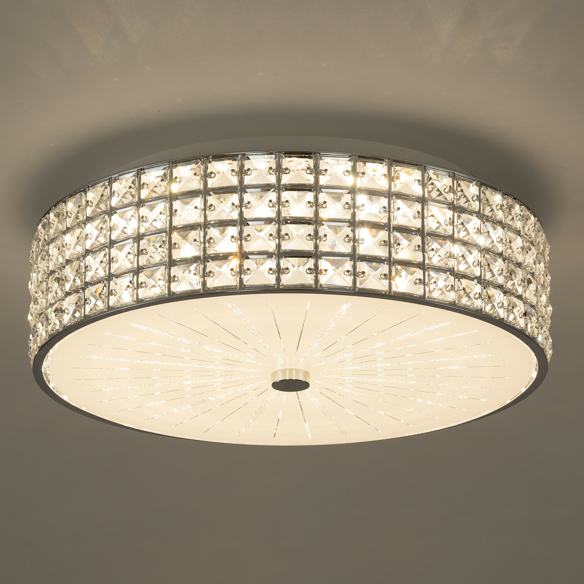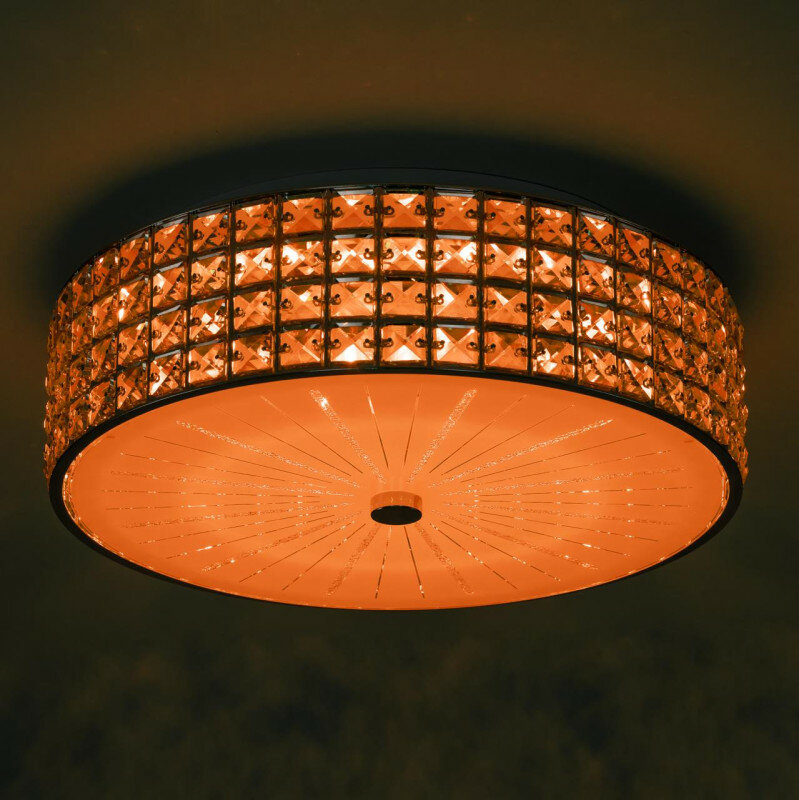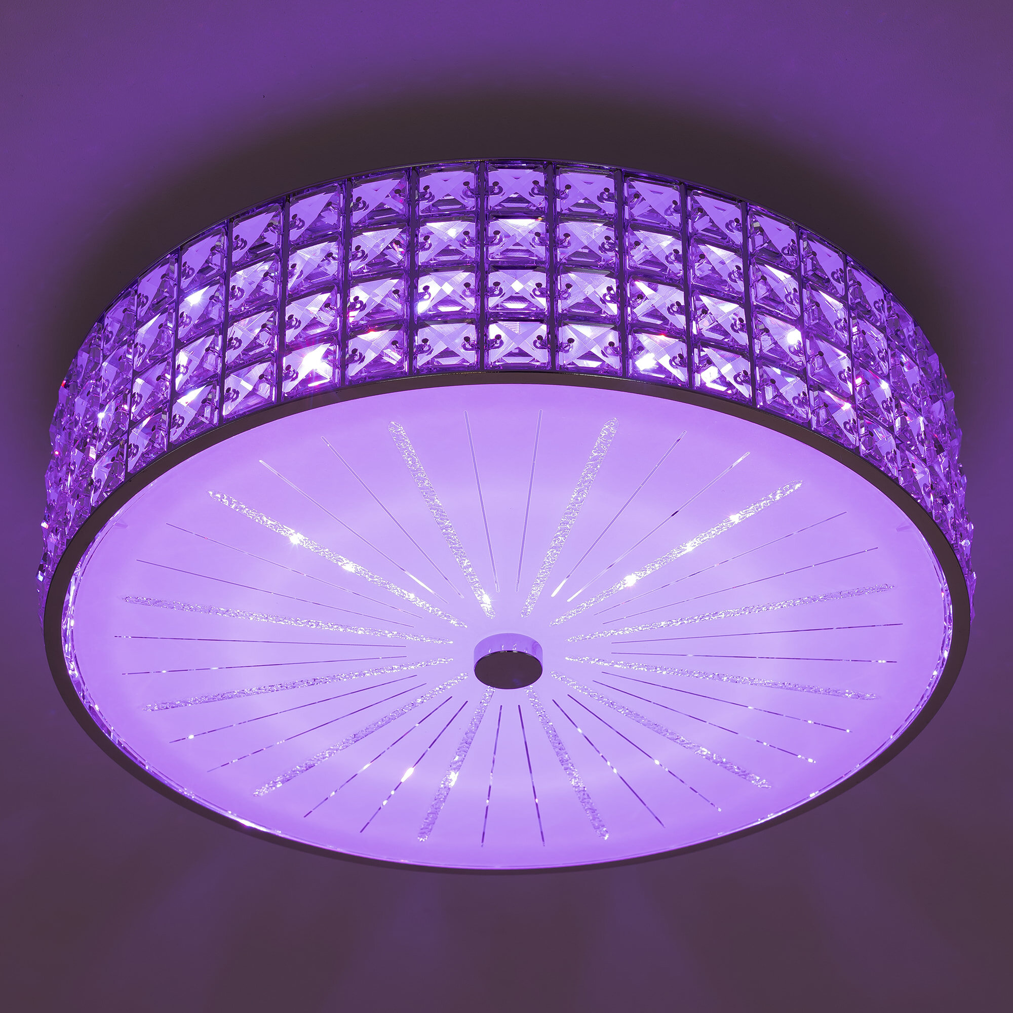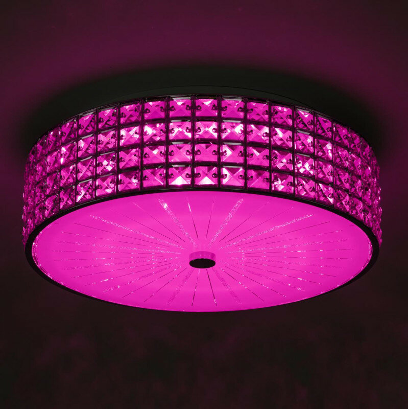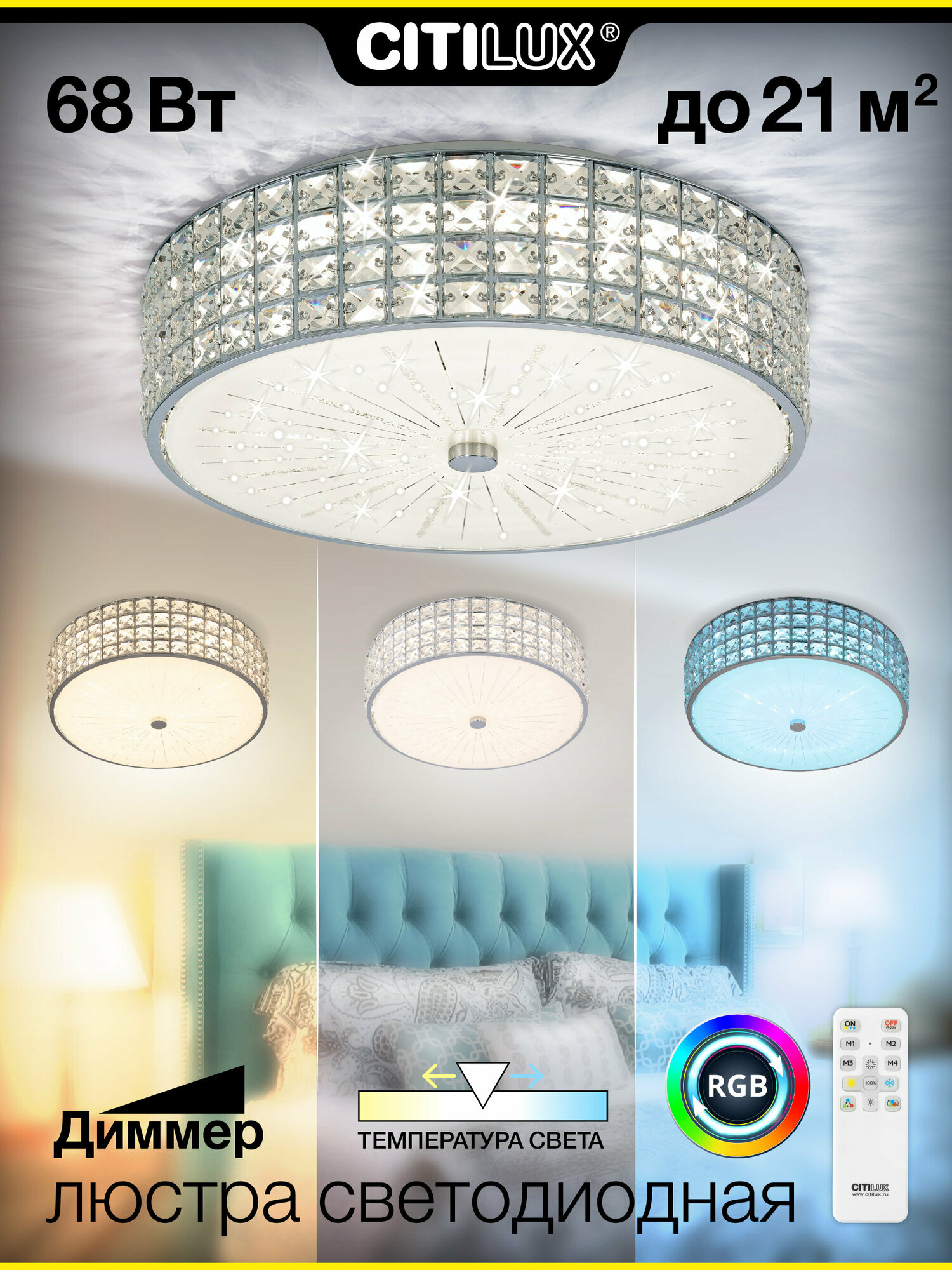 Хрустальная потолочная люстра Citilux Портал выполнена в стиле современной классики. Корпус металлический, цвет глянцевый хром. Боковая часть светильника украшена хрустальными элементами с классической огранкой, в нижней части установлен стеклянный глянцевый рассеиватель с лучистым рисунком. В изделии установлены яркие светодиоды основного света и цветной RGB подсветки. С помощью пульта доступно: плавная регулировка яркости от 10 до 100%, управление цветовой температурой от 3000К до 5500К позволяет настроить любые оттенки теплого, нейтрального или холодного света. Цветная RGB подсветка имеет различные режимы работы. Есть функция отсроченного выключения, 4 настраиваемых режима памяти, которыми также можно управлять настенным выключателем. Пульт ДУ в комплекте, тип батареек ААА (батарейки в комплект не входят, приобретаются отдельно). Подходит для всех типов потолков, в том числе натяжных. Тип крепления – планка. Мощность изделия 68Вт, световой поток 5800Лм. Свет безопасный для глаз, без мерцания и пульсаций. Потолочная люстра Ситилюкс Портал отлично подойдёт для основного освещения гостиной, столовой, спальни и кабинета оформленных в современном и классическом стиле.