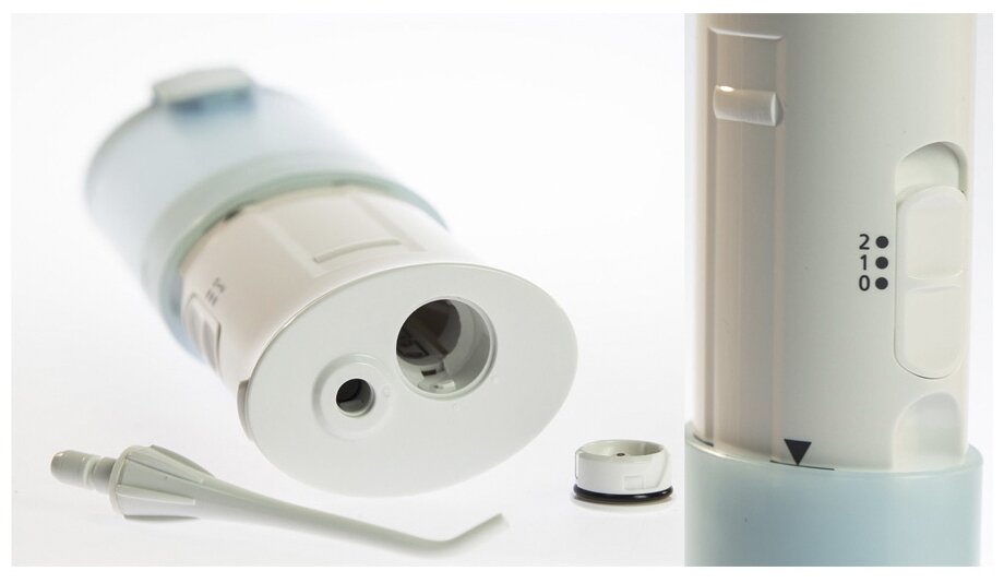 Ирригатор весит всего 210 г, при этом имеет довольно вместительный резервуар - 165 мл, что позволяет ему непрерывно подавать воду в течение 40 секунд! Он работает от 2-ух батареек типа АА, которые позволяют подавать воду с частотой 1400 пульсаций в минуту. Максимальная мощность ирригатора довольно высокая для портативного прибора - 530 кПа.