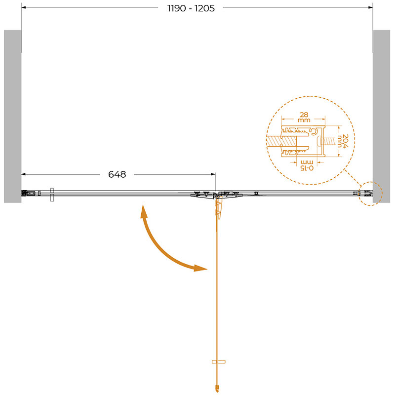 - Размеры с диапазоном регулировок (ШхВ): 1190-1205x1950 мм.