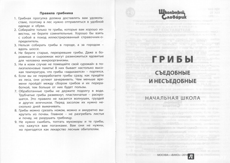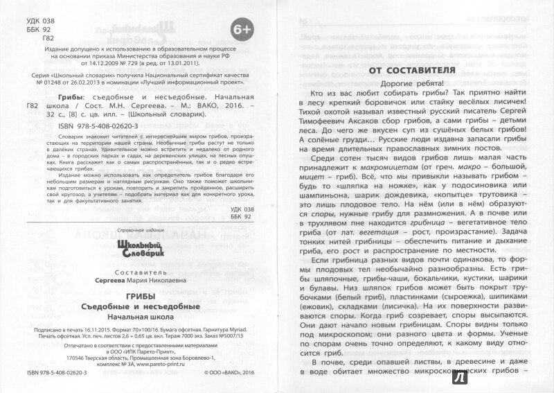 Словарик знакомит читателей с интереснейшим миром грибов, произрастающих на территории нашей страны. Необычные грибы растут не только в далёких странах. Удивительное можно встретить и недалеко от родного дома - в городских парках и садах, на деревенских улицах, на лесных опушках. Книга расскажет как о самых распространённых, так и о редко встречающихся грибах. Издание можно использовать как определитель грибов благодаря его небольшим размерам и наглядным рисункам. Оно также поможет школьникам подготовиться к урокам, повторить и закрепить пройденное, расширить свой кругозор, а учителям - подобрать материал как для конкретного урока, так и для факультативного занятия. Составитель: Сергеева М.Н. Допущено к использованию в образовательном процессе на основании приказа Министерства образования и науки РВ № 729. 2-е издание, переработанное и дополненное