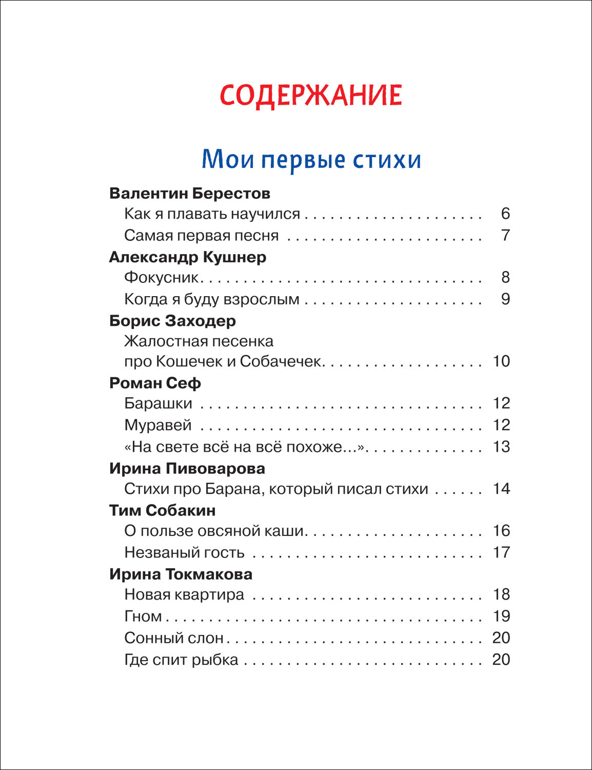 В сборник вошли стихотворения Бориса Заходера, Корнея Чуковского, Ирины Токмаковой и других поэтов, а также известные русские и зарубежные сказки: «Муха-цокотуха», «Петушок золотой гребешок», «Кот в сапогах» и «Красная Шапочка».