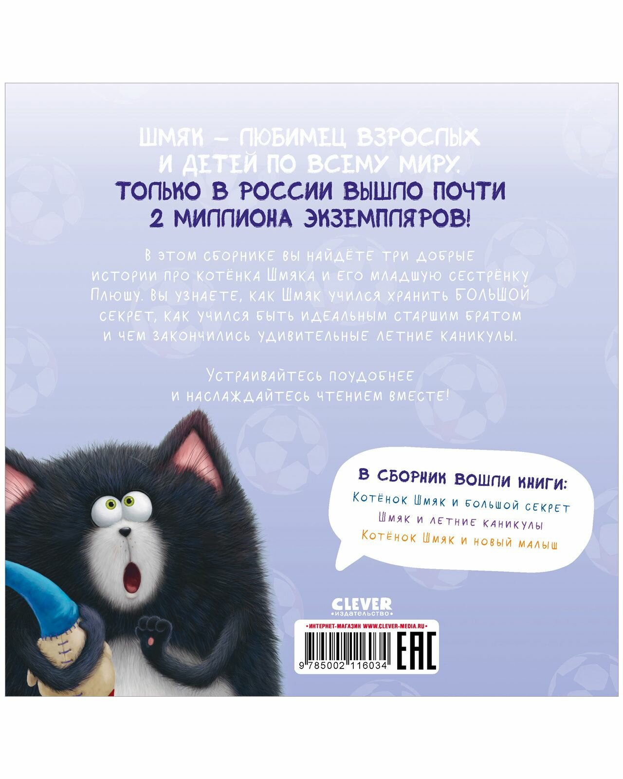 В этом сборнике вы найдёте три добрые истории про котёнка Шмяка и его младшую сестрёнку Плюшу. Вы узнаете, как Шмяк учился хранить БОЛЬШОЙ секрет, как учился быть идеальным старшим братом и чем закончились удивительные летние каникулы. Устраивайтесь поудобнее и наслаждайтесь чтением вместе!