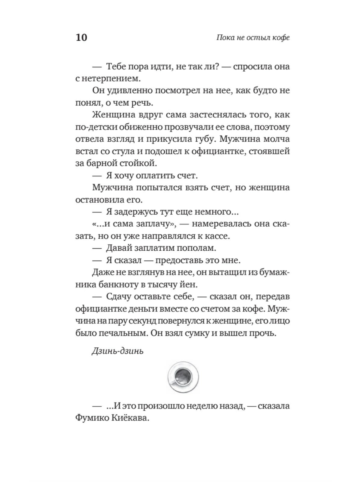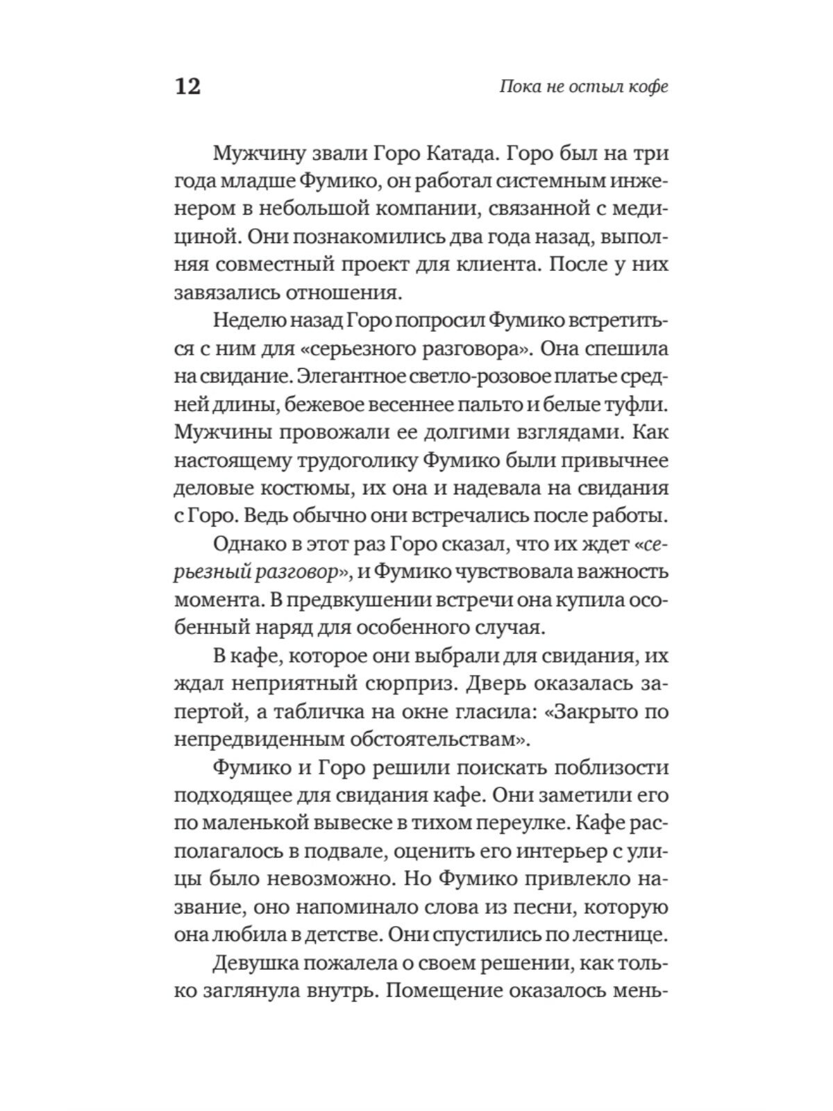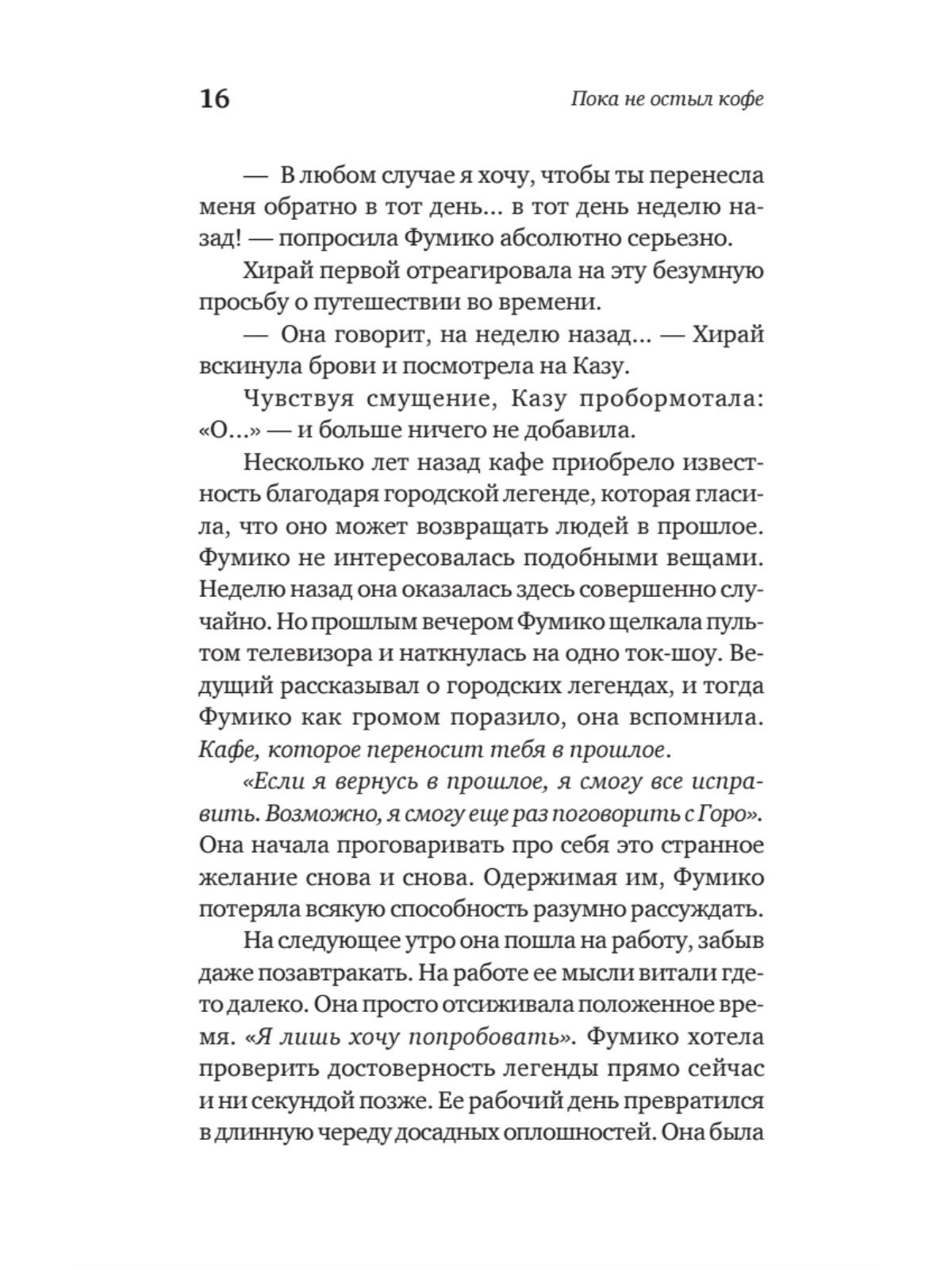 Вы когда-нибудь хотели вернуться в прошлое? Чтобы подобрать другие слова для важного разговора? Чтобы принять верное решение? Чтобы просто побыть с дорогим человеком? Городская легенда гласит: в одном японском кафе посетителям дарят такую возможность. Однако следует соблюдать пять обязательных правил. Главные из них – что бы вы ни сделали в прошлом, настоящее не изменится, вы должны успеть вернуться, пока не остыл ваш кофе.