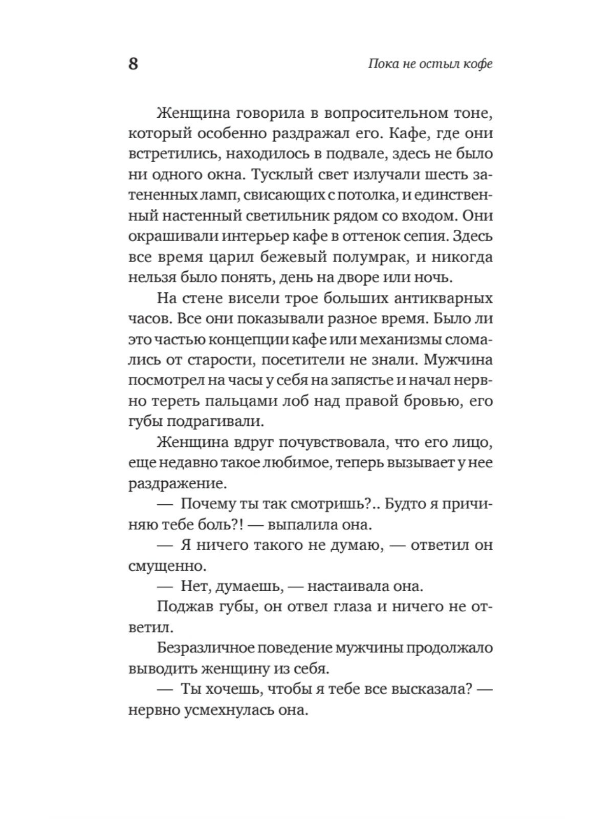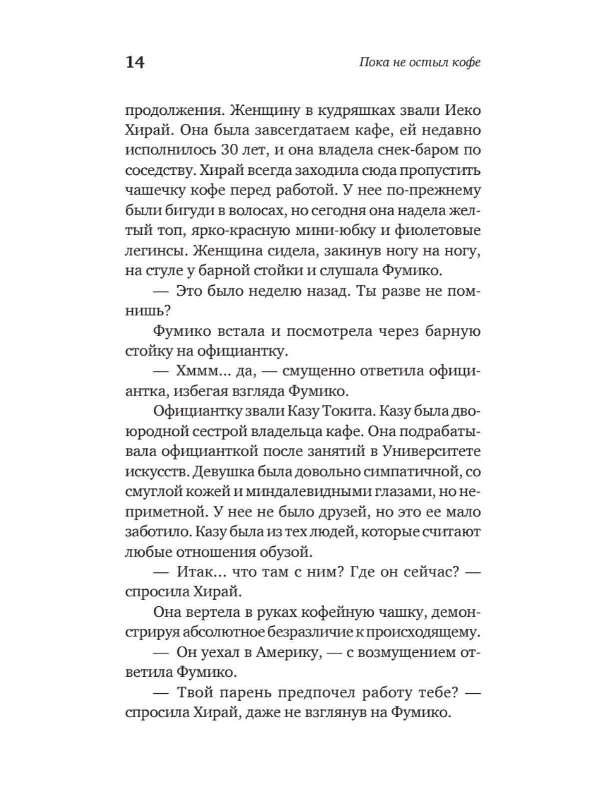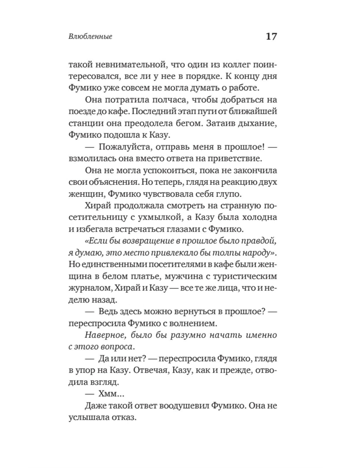 Вы когда-нибудь хотели вернуться в прошлое? Чтобы подобрать другие слова для важного разговора? Чтобы принять верное решение? Чтобы просто побыть с дорогим человеком? Городская легенда гласит: в одном японском кафе посетителям дарят такую возможность. Однако следует соблюдать пять обязательных правил. Главные из них – что бы вы ни сделали в прошлом, настоящее не изменится, вы должны успеть вернуться, пока не остыл ваш кофе.