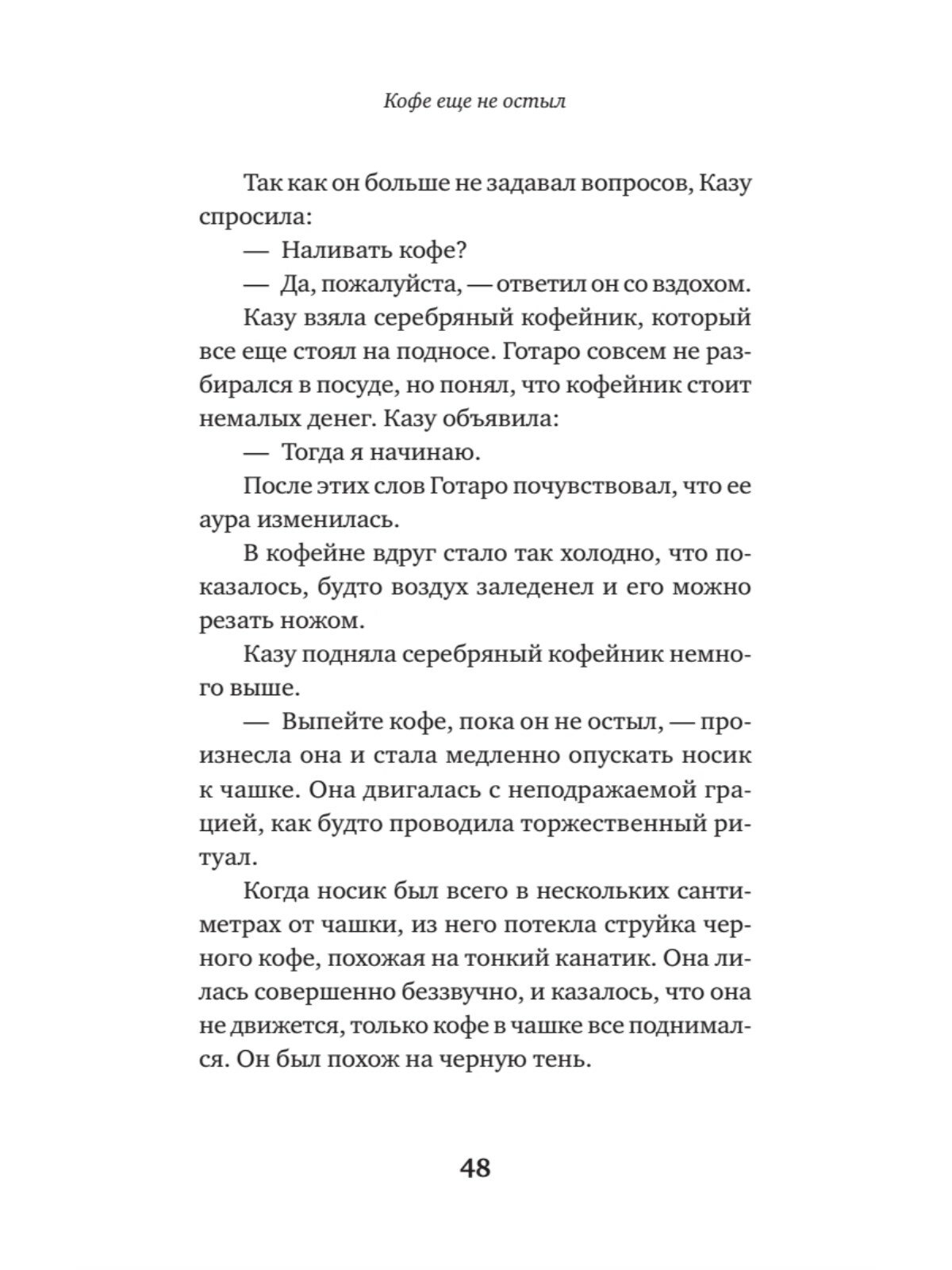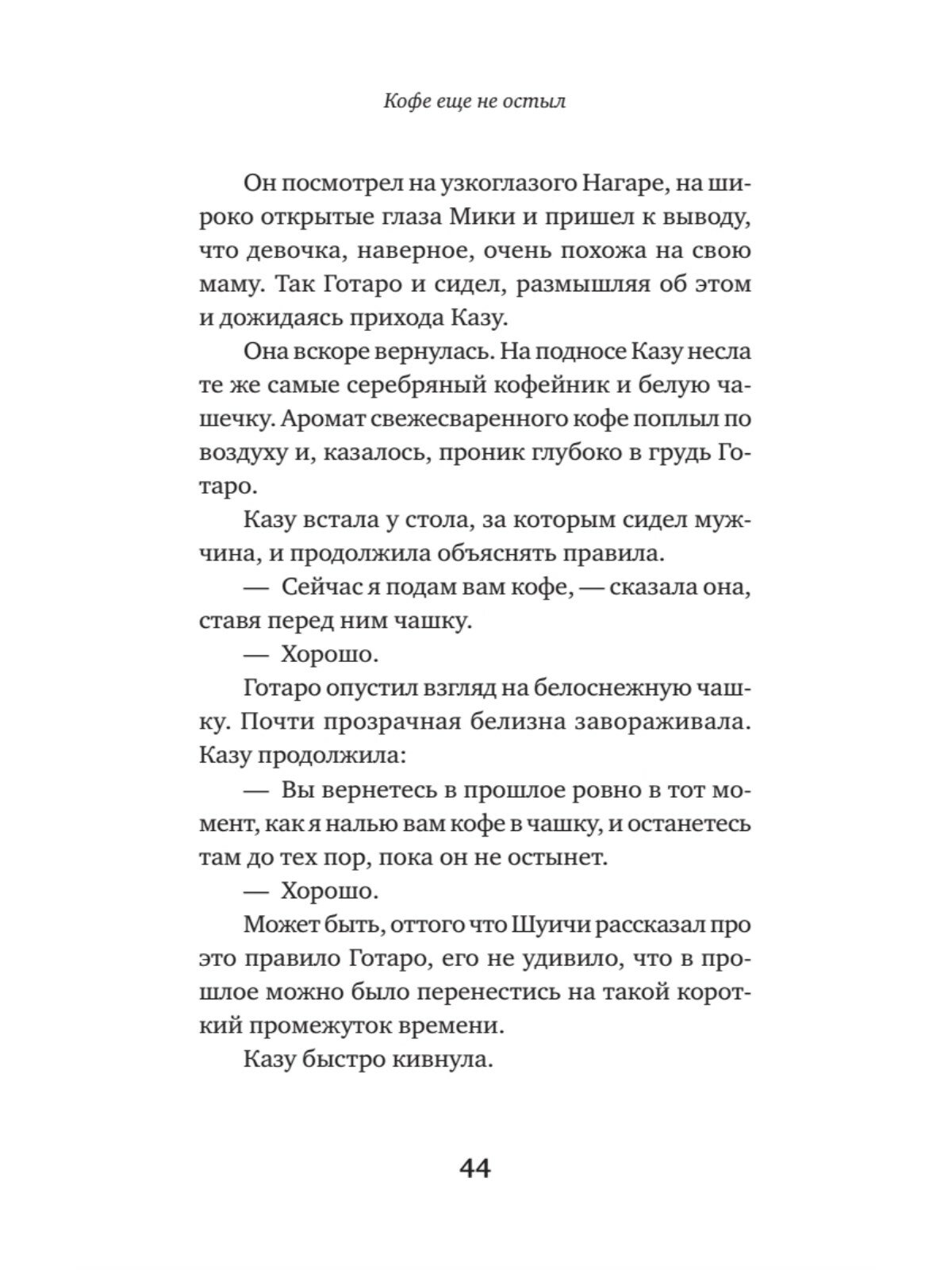 Тосикадзу Кавагути в своем романе "Кофе еще не остыл" рассказывает о тех, кто пришел в маленькое японское кафе и надеется отправиться в прошлое. В глухом переулке Токио есть местечко, в котором уже более ста лет подают необыкновенный кофе.