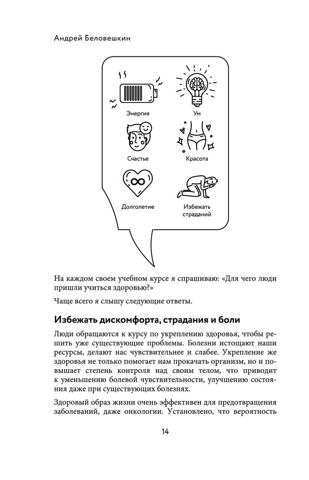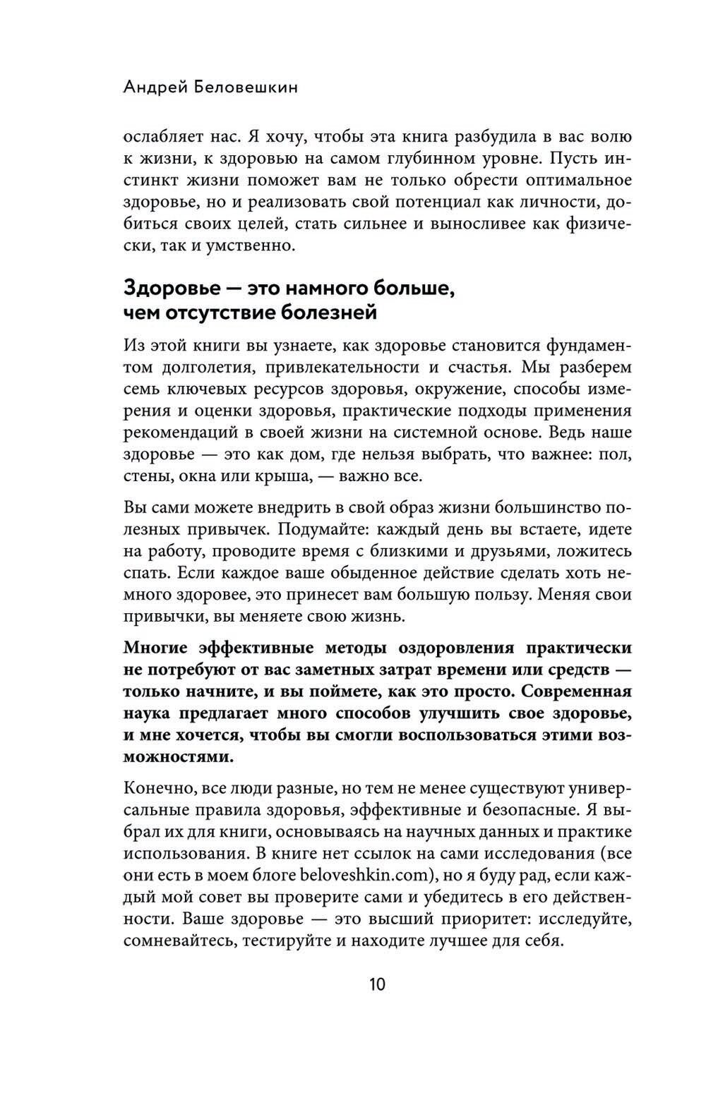 Андрей Беловешкин, к.м.н., врач и автор книги-бестселлера, предлагает рассматривать здоровье как систему и, соответственно, системный подход ко всему, что его касается. В этой книге он наглядно показывает взаимосвязь того, что мы делаем, и того, как мы себя чувствуем, и пошагово учит осознанности по отношению не только к здоровью, но и ко всей нашей жизни.