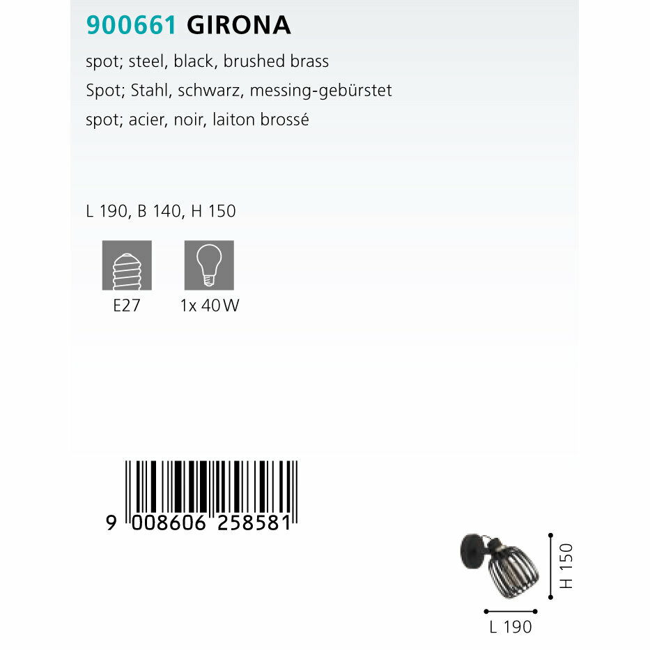 Спот из серии «GIRONA» от производителя Eglo (Австрия). Дизайн-стиль лофт. Цвет товара золотистый, черный. Используемые материалы: металл. Способ крепления: монтажная пластина. Дизайн и форма плафона конус. Направление плафонов изменяемое. Цоколь E27. Количество ламп 1 шт. Мощность одной лампы составляет 40 Вт. Расширенная гарантия на товар 2 года. Длина 190 мм. Ширина 140 мм. Высота 150 мм.