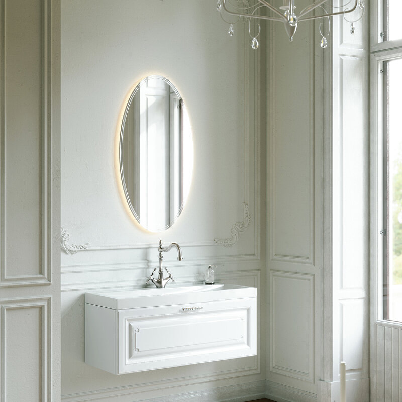 Изысканная и элегантная форма зеркала в виде эллипса дает хороший обзор, а оставшееся сбоку место можно дополнить акцентными бра. Благородства добавляет сложная фреза по периметру. Это зеркало – идеальный компонент для классического и неоклассического интерьера.
