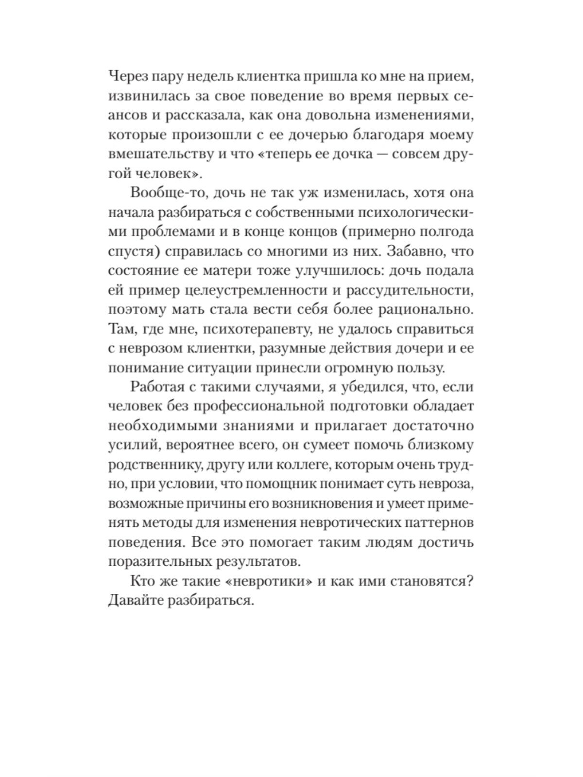 Как справляться с поведением людей, которое мы не в силах изменить? Невротическое поведение проявляют время от времени абсолютно все, но примерно половина людей делает это регулярно. Такие люди окружают нас в семье или на работе. Невротиками обычно принято называть тех, чьи чувства кажутся неуместными, а поведение настолько неэффективным или разрушительным, что они часто испытывают тревогу, депрессию, обиду или враждебность. Как быть, когда у близкого человека резко меняется настроение? Что делать, если он вдруг становится подозрительным и тревожным? Как строить планы, если он не может принять решение? Альберт Эллис, один из лучших психологов в мире, уверен, что вы научитесь регулировать свое состояние и эмоции, правильно подбирать слова и что ваша жизнь перестанет быть такой, как прежде.