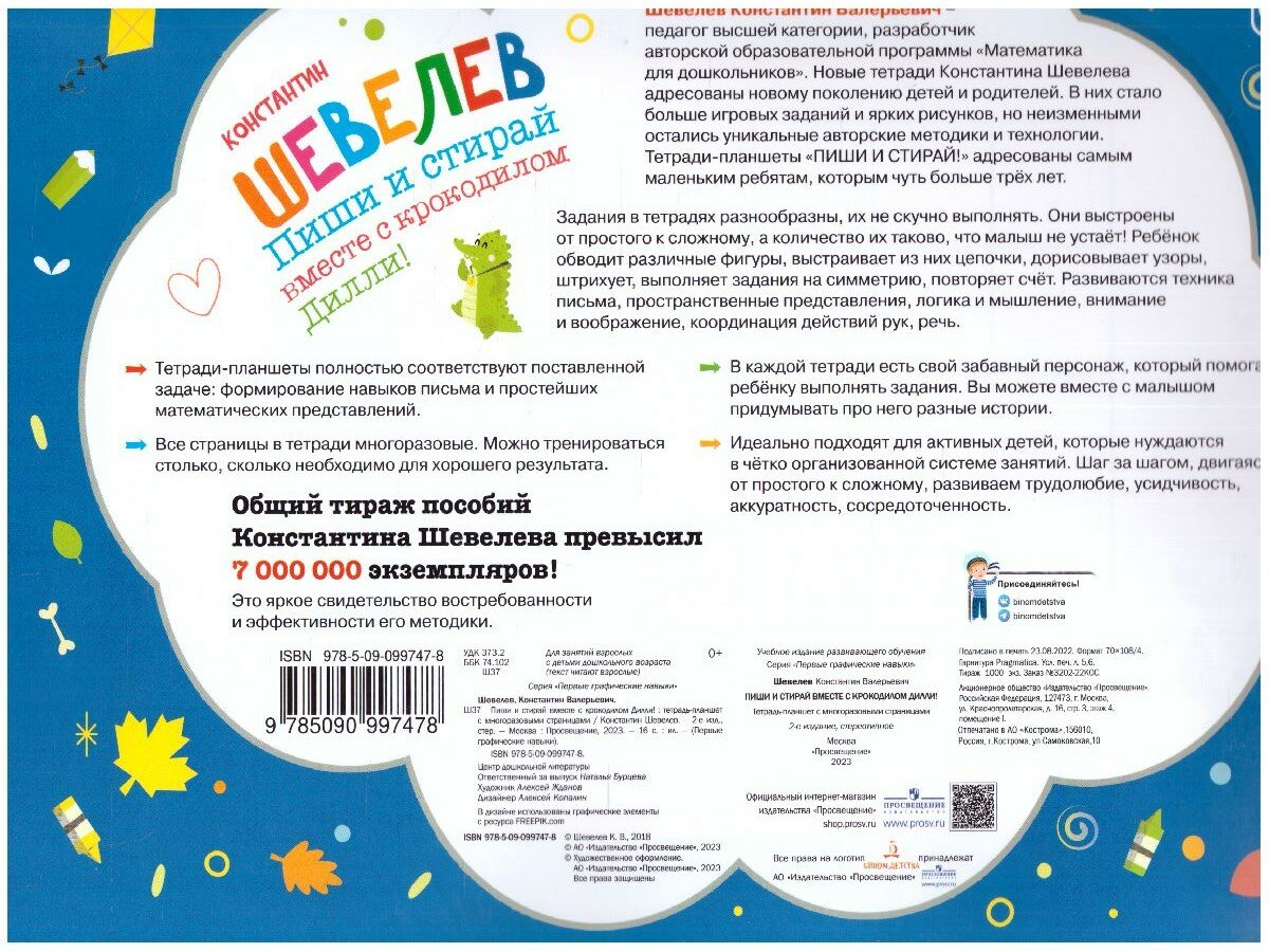 Шевелев Константин Валерьевич - педагог высшей категории, разработчик авторской образовательной программы "Математика для дошкольников". Новые тетради Константина Шевелева адресованы новому поколению детей и родителей. В них стало больше игровых заданий и ярких рисунков, но неизменными остались уникальные авторские методики и технологии. Тетради-планшеты "пиши И стирай!" адресованы самым маленьким ребятам, которым чуть больше трёх лет. Задания в тетрадях разнообразны, их не скучно выполнять. Они выстроены от простого к сложному, а количество их таково, что малыш не устаёт! Ребёнок обводит различные фигуры, выстраивает из них цепочки, дорисовывает узоры, штрихует, выполняет задания на симметрию, повторяет счёт. Развиваются техника письма, пространственные представления, логика и мышление, внимание и воображение, координация действий рук, речь. Тетради-планшеты полностью соответствуют поставленной задаче: формирование навыков письма и простейших математических представлений.