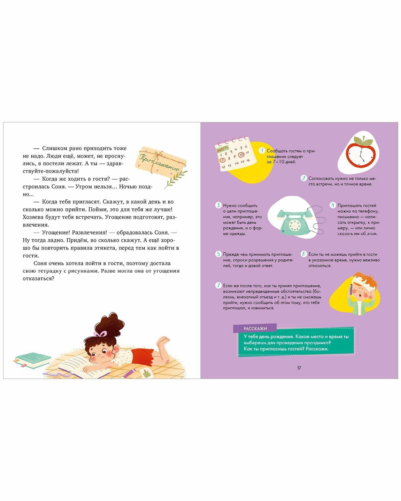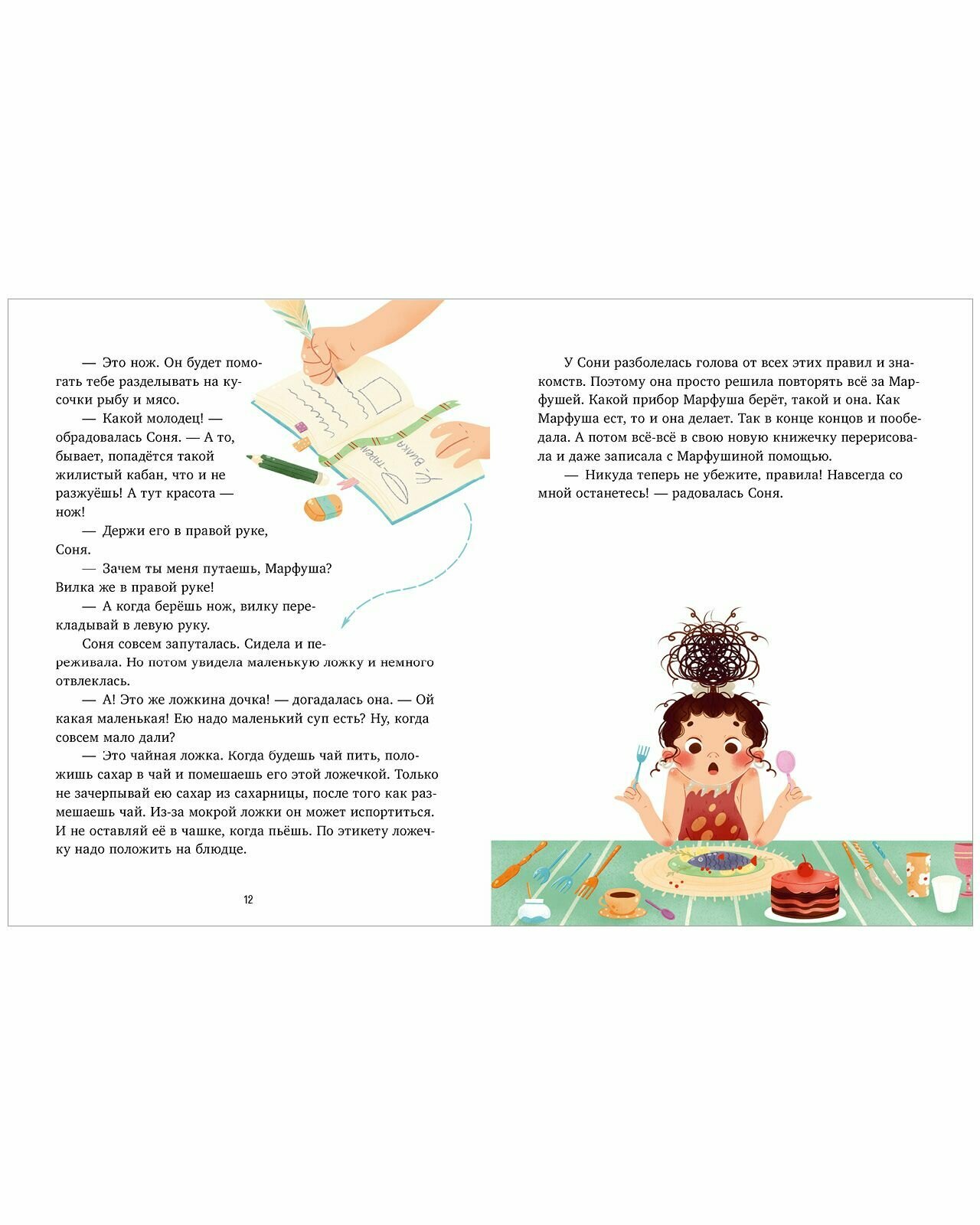 В этой книге собраны забавные и поучительные истории, которые помогут ребенку: культурно вести себя за столом; пользоваться столовыми приборами; проявлять чувство такта дома и в гостях; готовиться к предстоящему визиту; прислушиваться к добрым и уместным советам. Однажды первобытная девочка Соня отправилась на прогулку вместе со своим мамонтёнком Лохматом. Вдруг налетела снежная буря и заморозила их, погрузив в глубокий сон. Так и проспали они до наших дней. За это время появилось множество новых вещей, а вместе с ними и правил поведения, о которых озорной Соне ещё только предстоит узнать.