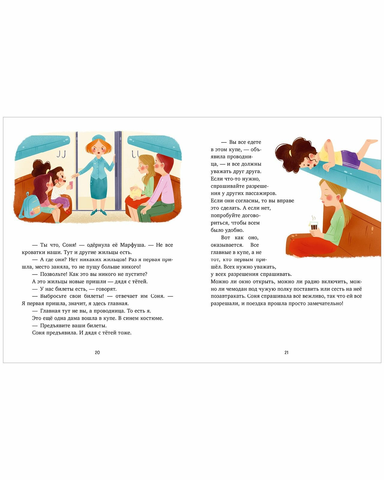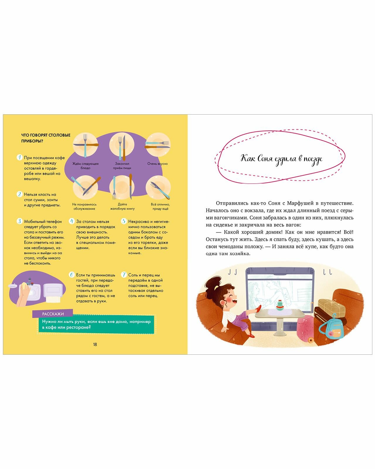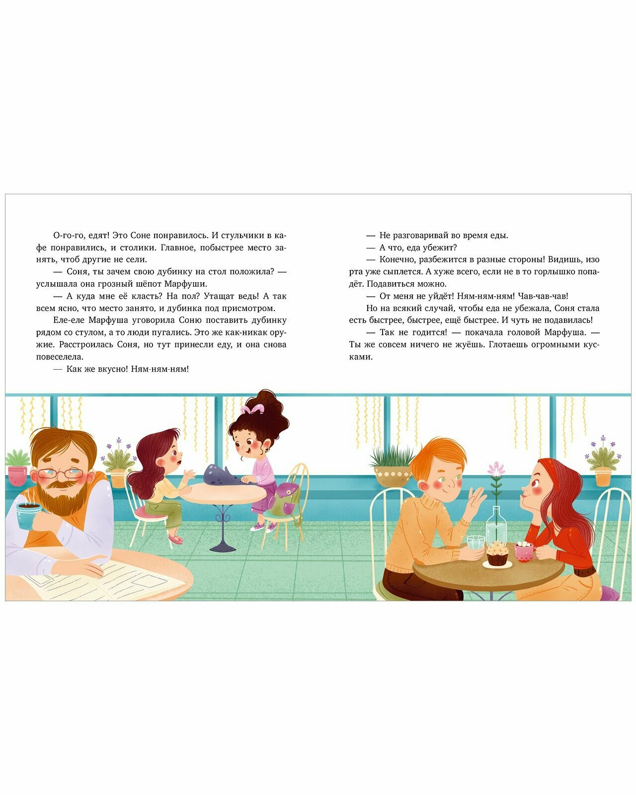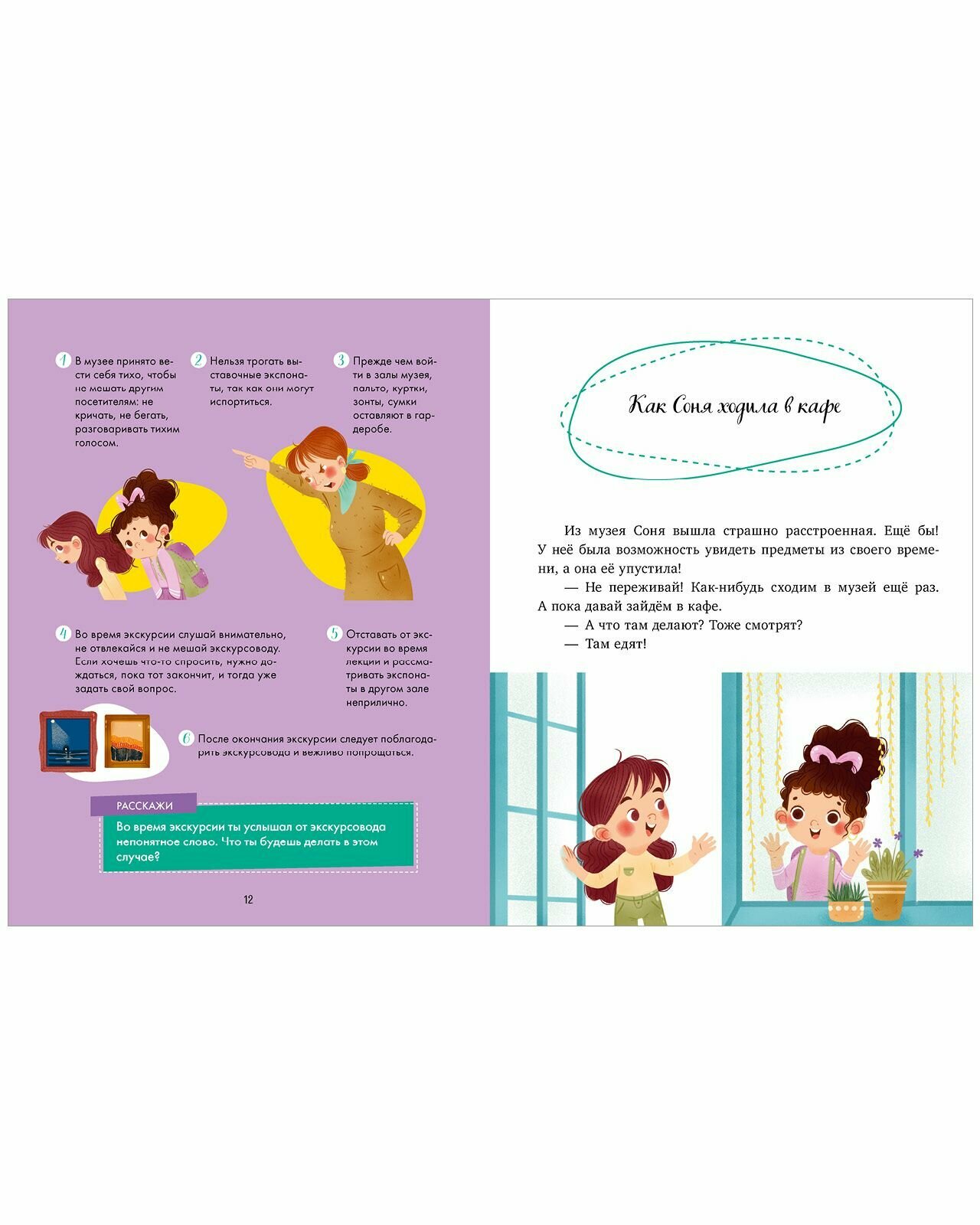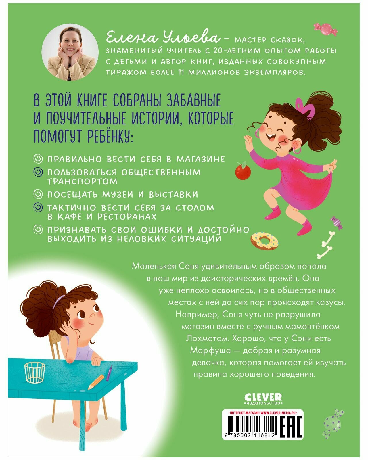 В этой книге собраны забавные и поучительные истории, которые помогут ребенку: правильно вести себя в магазине; пользоваться общественным транспортом; посещать музеи и выставки; тактично вести себя за столом в кафе и ресторанах; признавать свои ошибки и достойно выходить из неловких ситуаций. Маленькая Соня удивительным образом попала в наш мир из доисторических времён. Она уже неплохо освоилась, но в общественных местах с ней до сих пор происходят казусы. Например, Соня чуть не разрушила магазин вместе с ручным мамонтёнком Лохматом. Хорошо, что у Сони есть Марфуша добрая и разумная девочка, которая помогает ей изучать правила хорошего поведения.