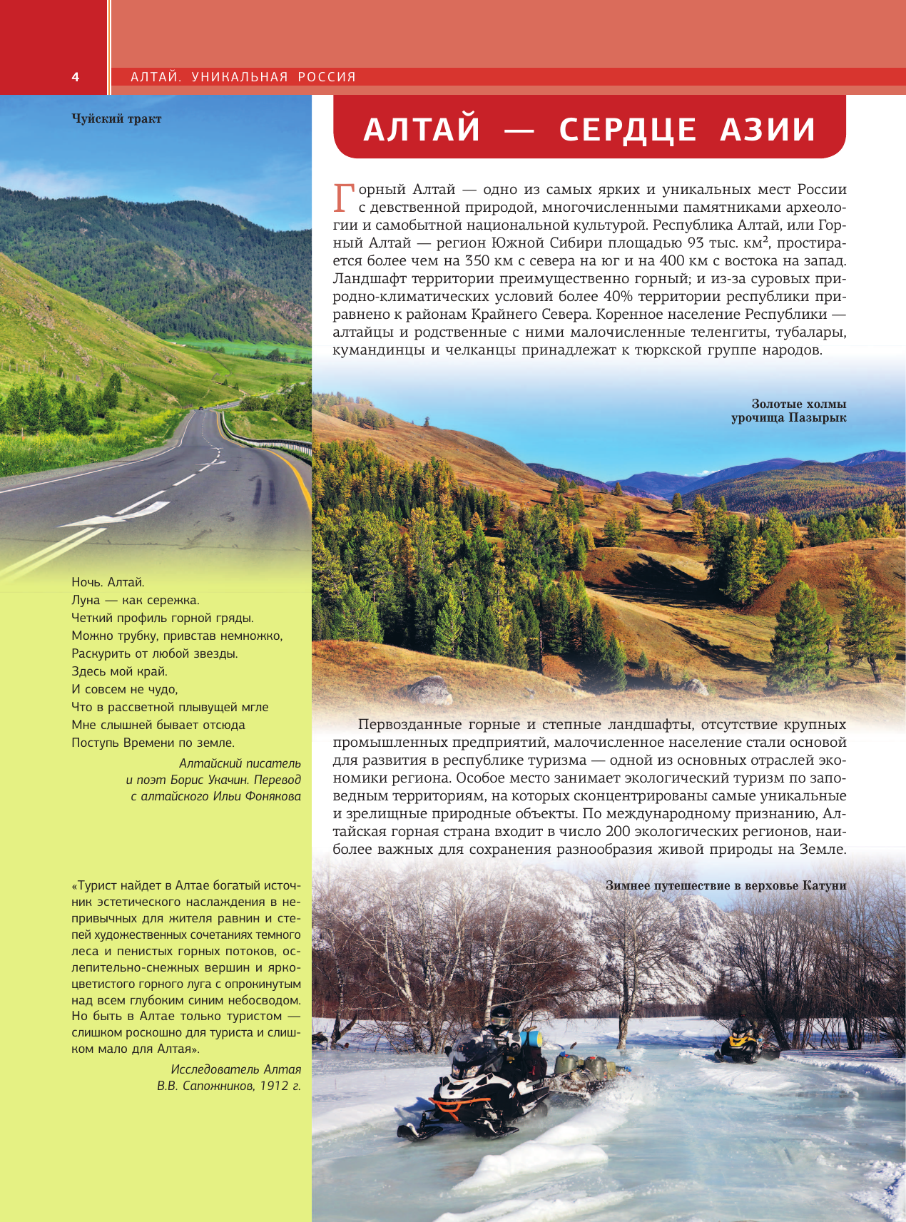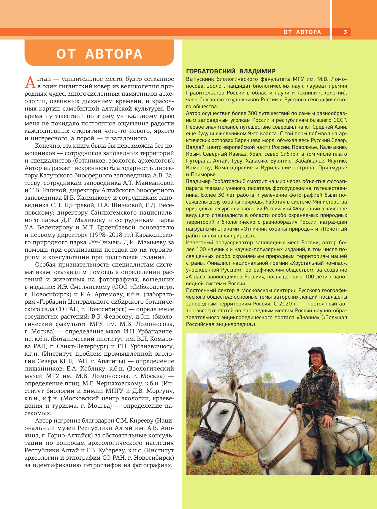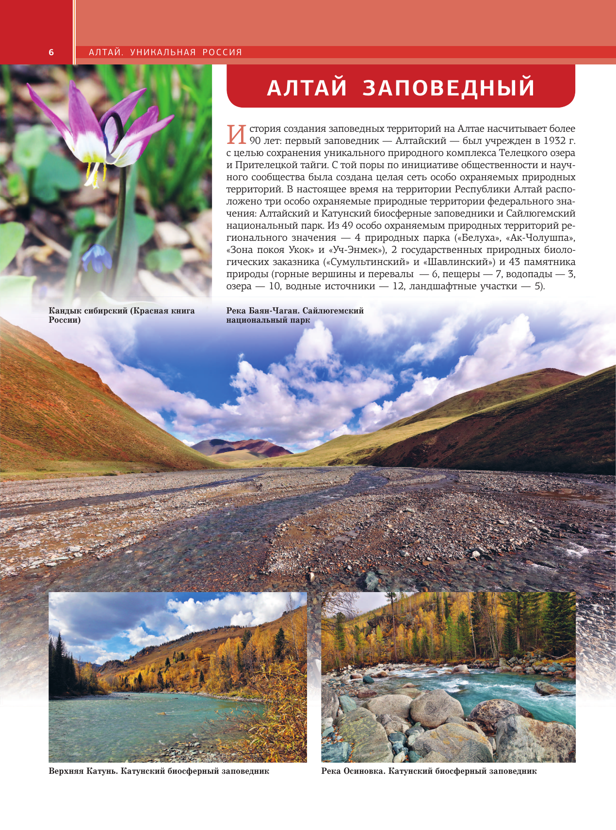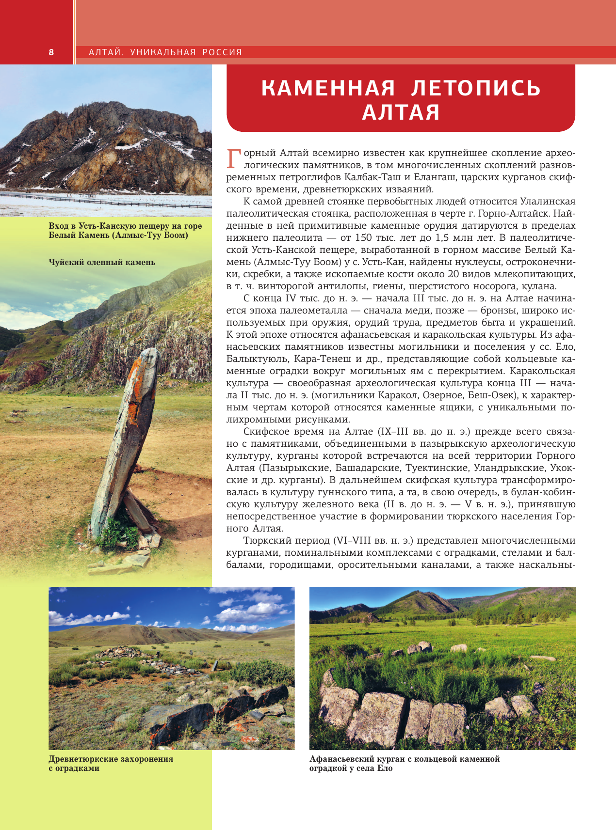 Издание посвящено Алтаю – одному из самых удивительных и уникальных мест не только в России, но и в мире. Достаточно отметить, что главные природные изюминки Алтая – Алтайский и Катунский заповедники, Телецкое озеро, священная гора Белуха и высокогорное плато Укок входят в состав объекта Всемирного природного наследия ЮНЕСКО "Золотые горы Алтая". В книге впервые представлено подробное описание с многочисленными красочными авторскими фотографиями наиболее живописных заповедных мест Алтая. Именно на этих территориях сконцентрированы самые значимые природные достопримечательности Алтая, к ним проложены экологические маршруты, оборудованные стоянками и местами для отдыха. Но Алтай – не только первозданная природа, но и многочисленные древности, овеянные дыханием времени – курганы, изваяния, оленные камни, петроглифы, которые образуют гигантский археологический музей под открытым небом. Книга знакомит с наиболее значимыми памятниками археологии Алтая, которыми можно полюбоваться не только на заповедных территориях.