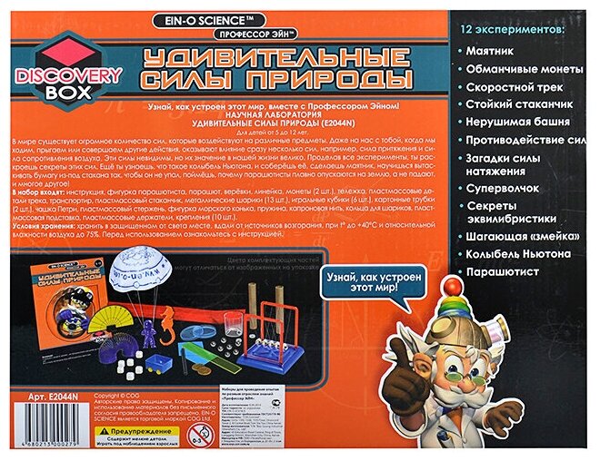 Набор для проведения экспериментов Профессор Эйн: Удивительные силы природы - комплект, который заинтересует юного исследователя миром увлекательной науки. Вместе с героями одноименного мультфильма будущему владельцу предстоит узнать множество тайн, которые можно подтвердить опытным путем! Он сможет понять, почему парашютисты медленно опускаются на землю, своими руками сумеет сделать маятник и научится выдергивать бумагу из-под стакана. Полученные навыки и знания пригодятся юному ученому на занятиях в школе, чтобы удивить всех своих одноклассников и получить заслуженную отметку «отлично».