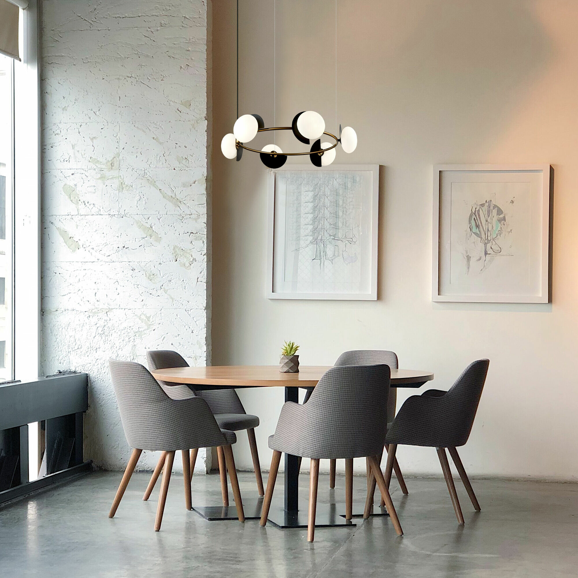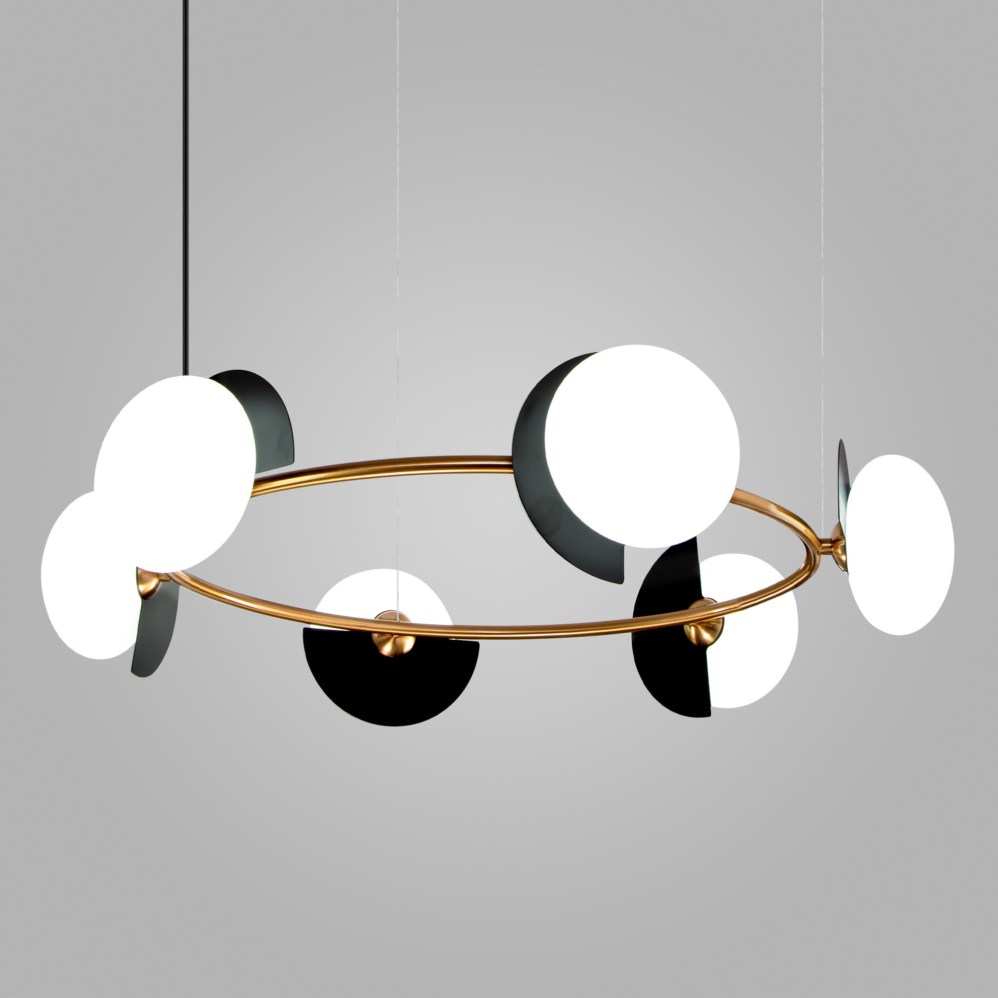 Подвесной светильник на 6 стеклянных плафонов Eurosvet Moity 70150/6 в цвете черный и латунь предназначен для создания основного освещения и акцентной подсветки в любом дизайне вашего интерьера. Простые минималистичные формы и сдержанные тона станут идеальным дополнением для вашего дизайна. В качестве источника света используются сменные лампы с цоколем G9, питание от сети 230В, 50Гц. Патрон рассчитан на максимальную мощность 25Вт и поможет создать качественное освещение на площади 7м?. Благодаря белому стеклянному плафону светильник создает мягкое рассеянное свечение, которое защищает глаза от слепящего воздействия источника света. Прочный металлический корпус светильника устойчив к механическим воздействиям, а защитное покрытие обеспечивает надежную электроизоляцию и презентабельный внешний вид. Подвесная люстра оснащена системой регулировки высоты подвеса, позволяющей размещать изделие на разных уровнях, уменьшая или увеличивая угол рассеивания светового потока. Светильник легко устанавливается на любых потолках при помощи монтажной планки. Серия Moity выполнена в трендовых цветах черный/латунь и состоит из: бра подвесных люстр на 4 и 6 плафонов в форме круга и линии. Важно! Лампочки в комплект не входят и докупаются дополнительно в зависимости от желаемой цветовой температуры (теплый, холодный свет).
