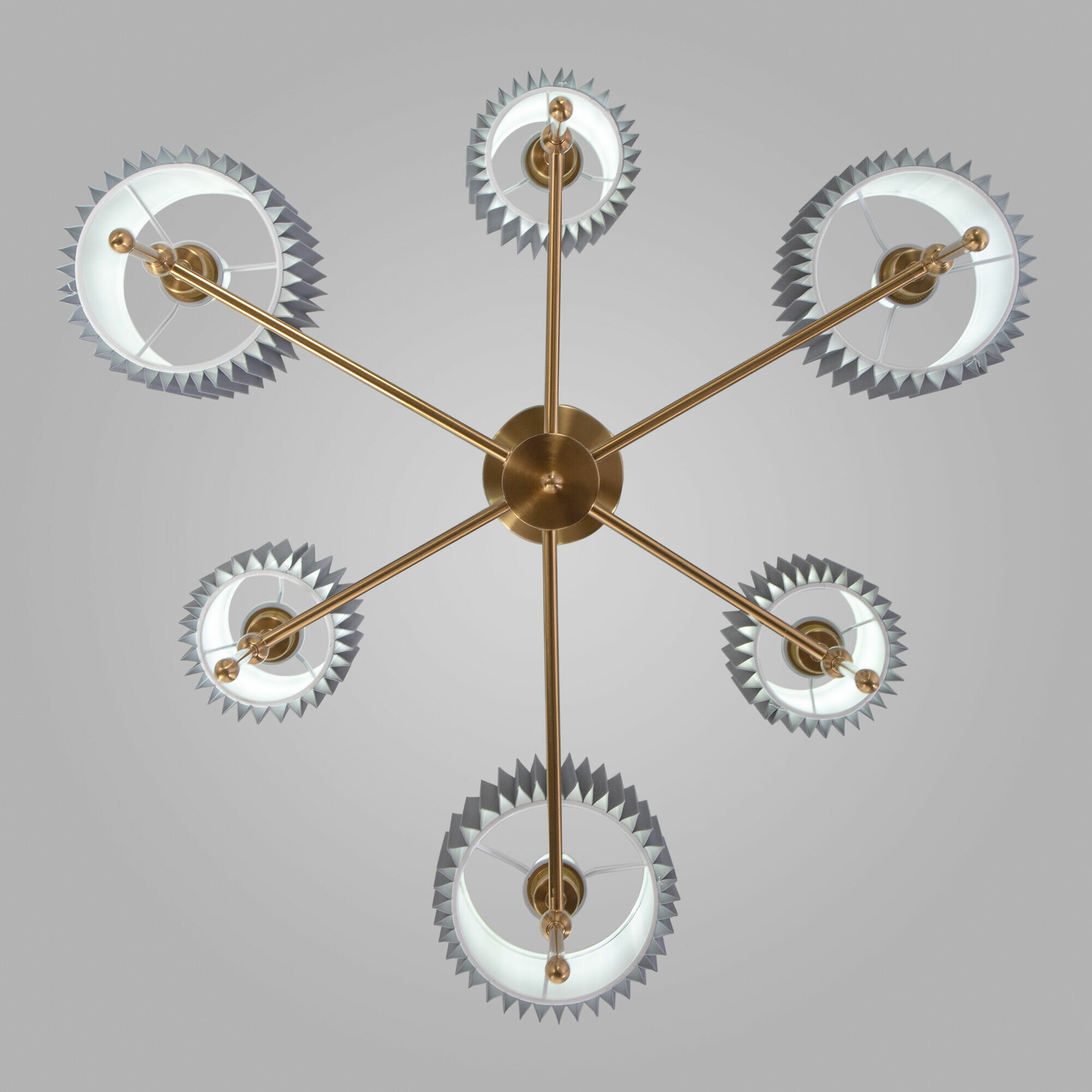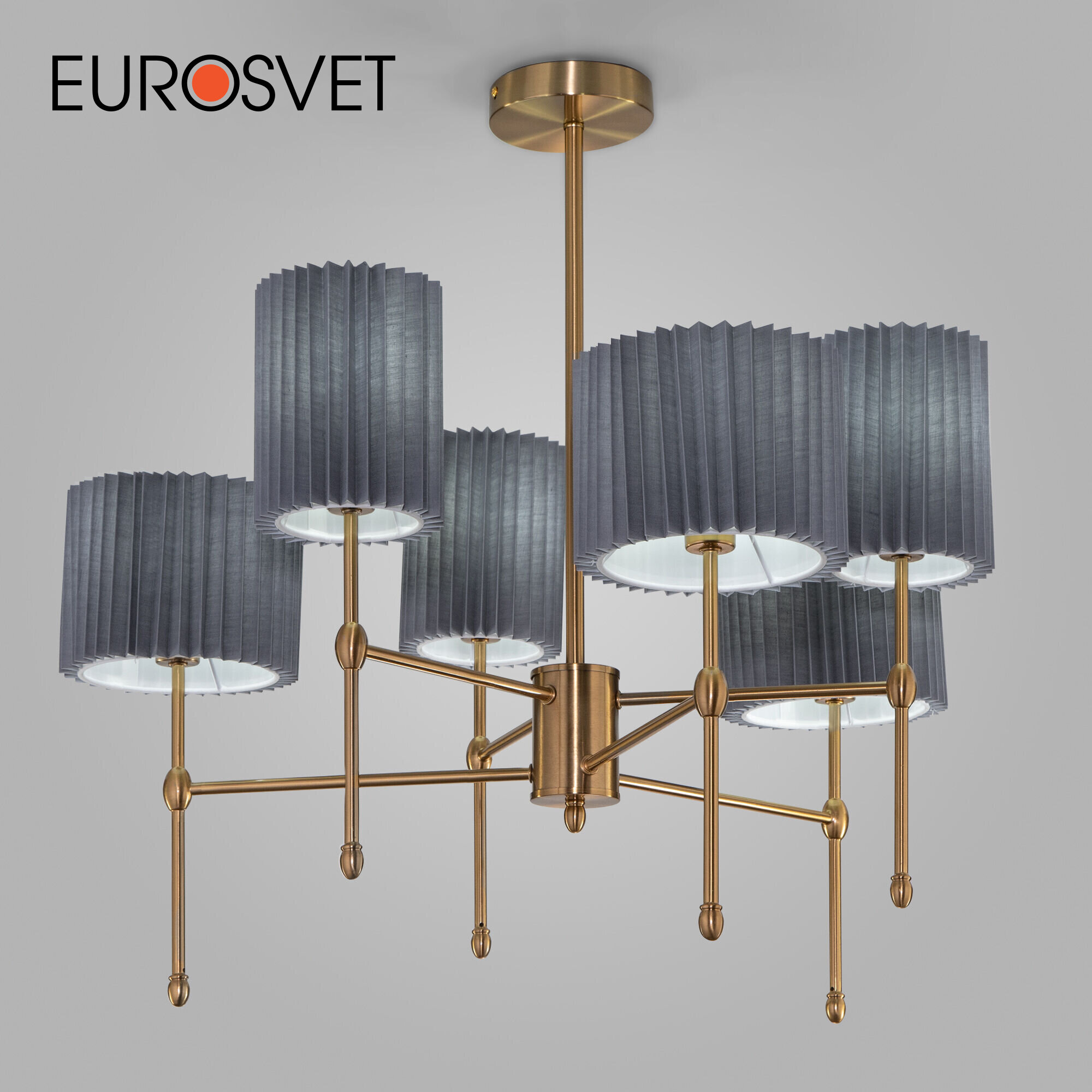 Потолочная люстра на 6 серых абажуров Eurosvet Notturno 60162/6 в цвете латунь является необходимым атрибутом для создания основного освещения и акцентной подсветки в современных и классических интерьерах. В светильнике используется сменные лампы с цоколем E14 с рекомендованной максимальной мощностью 40Вт. Светильник со сменными лампами создаст качественное освещение на площади 11м кв. и подсветит интерьерные зоны в гостиной, в прихожей и в других местах. Потолочный светильник легко устанавливается на подвесных и натяжных потолках при помощи монтажной планки. Прочный металлический корпус светильника устойчив к механическим воздействиям, а защитное покрытие обеспечивает надежную электроизоляцию и презентабельный внешний вид. Серия Notturno состоит из торшера, настольного светильника, бра и потолочных люстр на 6 и 8 рожков в двух актуальных цветах: латунь и черный, что станет отличным дополнением к любому классическому дизайну. Важно! Лампочки в комплект не входят и докупаются дополнительно в зависимости от желаемой цветовой температуры (теплый, холодный свет).