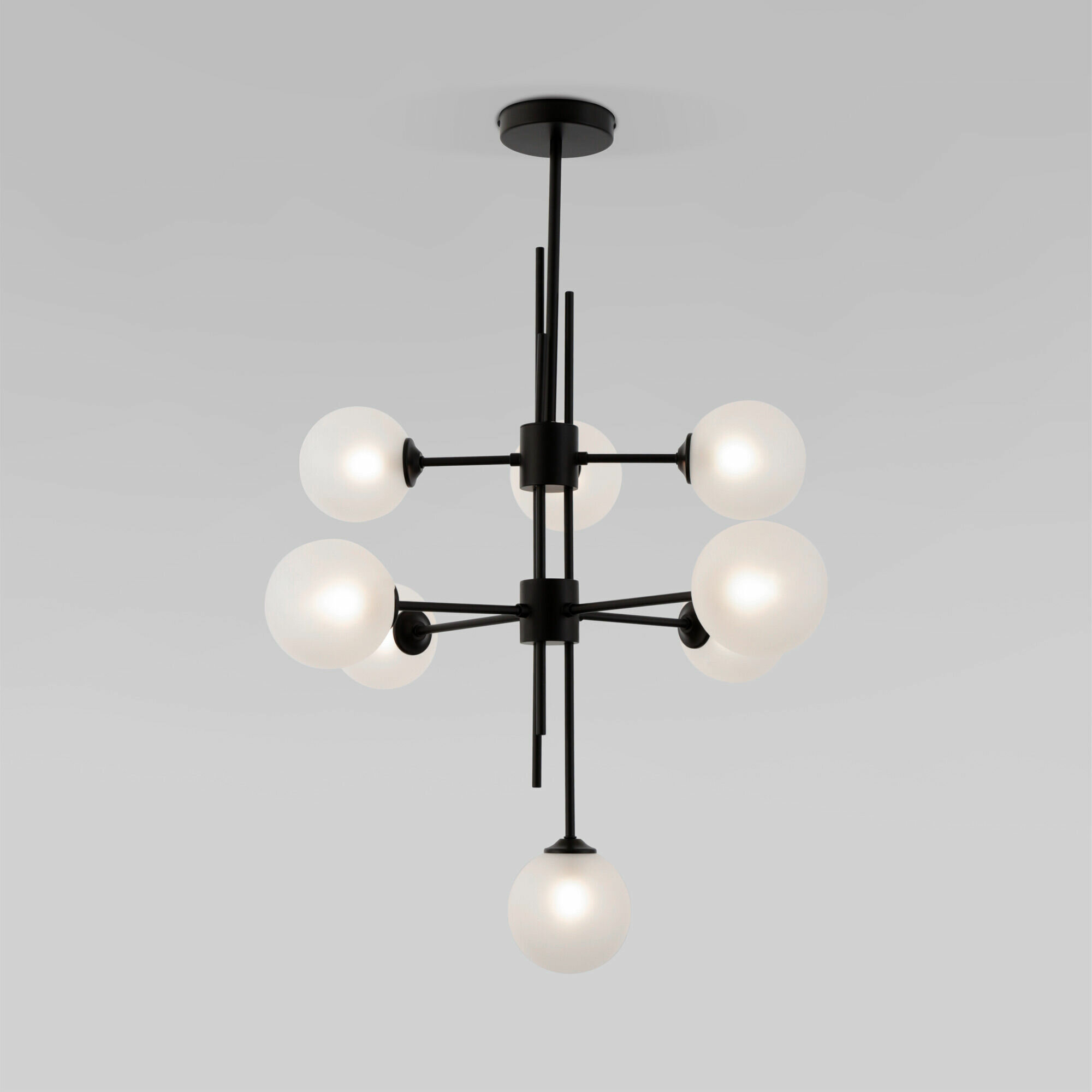 Потолочная люстра на 8 стеклянных плафонов Eurosvet Volver 50383 G9 в черном цвете предназначена для создания основного освещения и акцентной подсветки в любом дизайне вашего интерьера. Простые минималистичные формы и сдержанные тона станут идеальным дополнением для вашего дизайна.В качестве источника света используются сменные лампы с цоколем G9, питание от розетки 230В, 50Гц. Патрон рассчитан на максимальную мощность 40Вт и поможет создать качественное освещение на площади 4м.кв.Благодаря матовому белому стеклянному плафону светильник равномерно распределяет световой поток и защищает глаза от слепящего воздействия источника света. Прочный металлический корпус светильника устойчив к механическим воздействиям, а защитное покрытие обеспечивает надежную электроизоляцию и презентабельный внешний вид. Люстра легко устанавливается на любых потолках при помощи монтажной планки.Серия Volver выполнена в трендовых цветах: черный, латунь и состоит из: торшера, бра потолочных люстр 8 плафонов.Важно! Лампочки в комплект не входят и докупаются дополнительно в зависимости от желаемой цветовой температуры (теплый, холодный свет).