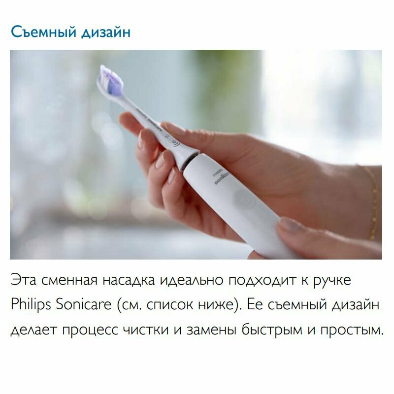 | Совместимость с моделями | Philips 2 Series Plaque Control, Philips 2 Series Plaque Defense, Philips 3 Series для более здоровых десен, Philips DiamondClean, Philips DiamondClean 9000, Philips DiamondClean Smart, Philips EasyClean, Philips Essence+, Philips ExpertClean, Philips ExpertResults, Philips FlexCare, Philips FlexCare Platinum, Philips FlexCare Platinum Connected, Philips For Kids, Philips HealthyWhite, Philips HealthyWhite+, Philips PowerUp, Philips Prestige 9900, Philips ProtectiveClean, Philips серия 1100, Philips серия 2100, Philips серия 3100 |