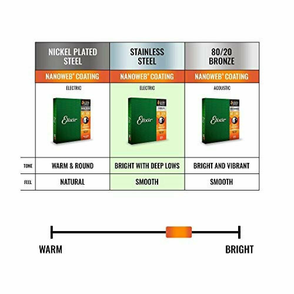 Струны покрыты слоем специально разработанного покрытия Nanoweb, который увеличивает срок службы комплекта с сохранением тона и звучания в три-четыре раза дольше относительно стандартных наборов. Сталь имеет более агрессивное рычащее звучание с насыщенной серединой. Звук струн можно охарактеризовать как насыщенный и яркий.
