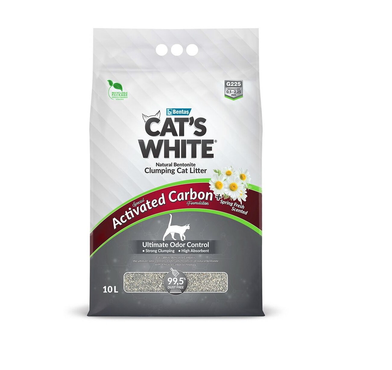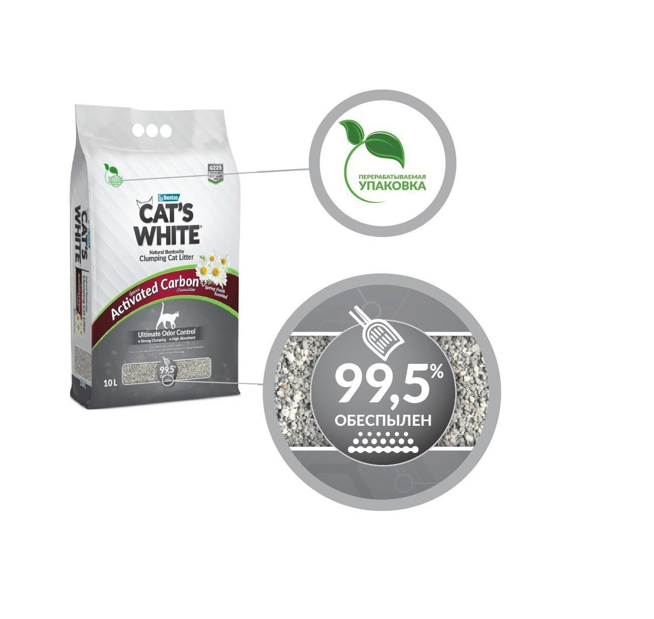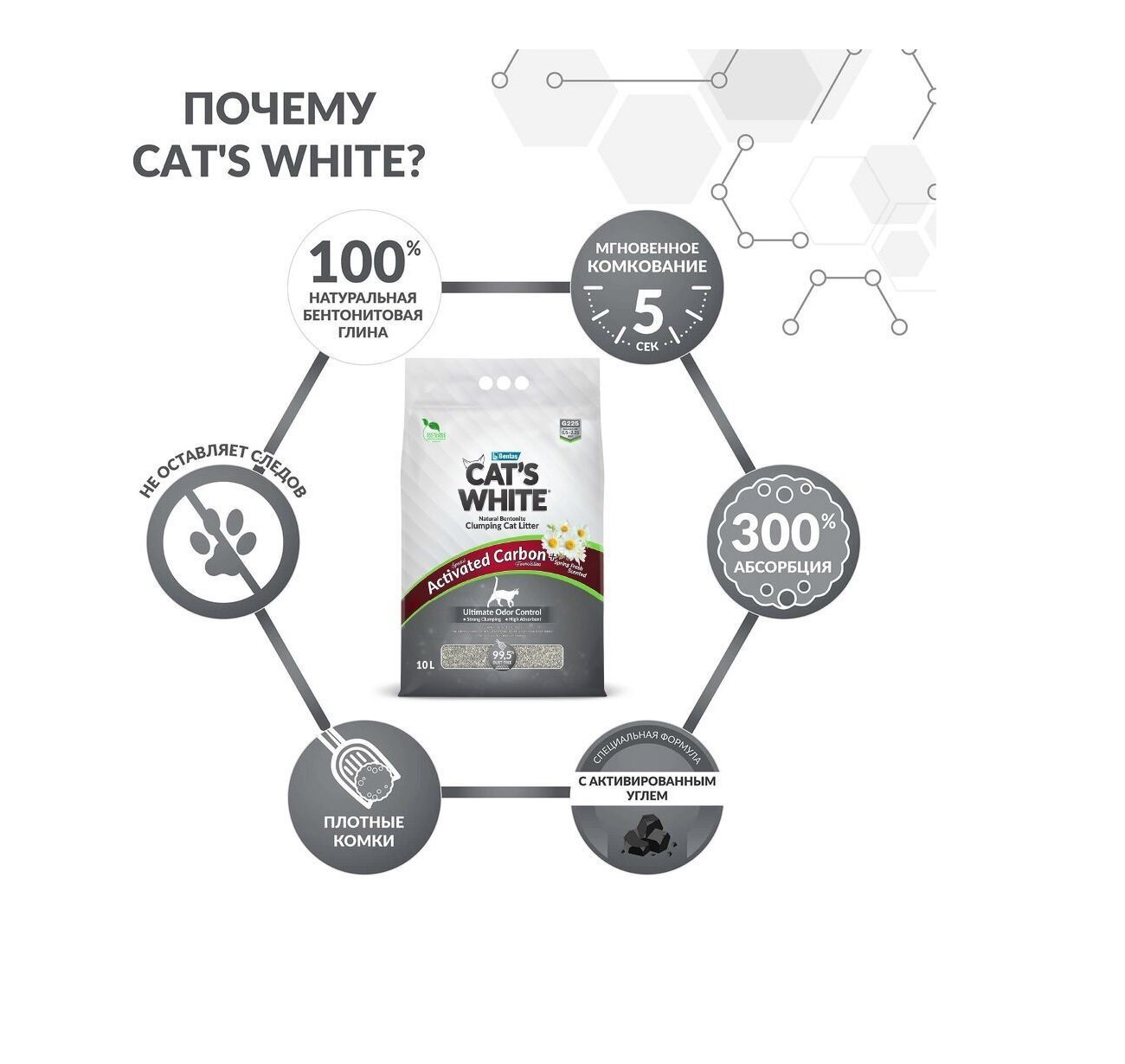 CAT'S WHITE - премиальные комкующиеся наполнители из 100% натуральной белой бентонитовой глины. Монтмориллонит в структуре глины полностью нейтрализует неприятные запахи. CAT'S WHITE ACTIVATED CARBON VANILLA SCENTED - это премиальный комкующийся наполнитель для кошачьего туалета с максимальным контролем неприятного запаха. специальная формула С активированным углем и легким ароматом ванили Уникальная формула наполнителя, сочетающая превосходные свойства натурального белого бентонита и активированного угля, надежно запирает неприятные запахи и обладает повышенной способностью к впитыванию влаги. Идеально подходит для использования даже несколькими кошками. Наполнитель содержит тонкий и ненавязчивый аромат ванили, который создаст уютную атмосферу в доме. Наполнители CAT'S WHITE создают гигиеничную среду благодаря превосходному комкованию за 5 секунд. Высокая абсорбирующая способность до 300% и мгновенное образование плотного комка за 5 секунд позволяют не только быстро и надежно запирать неприятные запахи, но и сохранять наполнитель чистым. Плотные комки надежно удерживают влагу, не крошатся и легко удаляются из лотка, поэтому полная замена наполнителя не требуется. Благодаря этому CAT'S WHITE удобен и экономичен. На 99,5% очищен от пыли, не оставляет следов в доме и безопасен для кошек и их владельцев. забота об окружающей среде. Мягкая премиальная эко-упаковка CAT'S WHITE ACTIVATED CARBON VANILLA SCENTED полностью подлежит переработке. преимущества: натуральность. 100% натуральная бентонитовая глина. экологичность. Перерабатываемая упаковка. специальная формула С активированным углём. Уникальная формула наполнителя, сочетающая в себе превосходные свойства натурального белого бентонита и активированного угля, надежно запирает неприятные запахи и обладает повышенной способностью к впитыванию влаги. С ароматом ванили. Тонкий и ненавязчивый аромат ванили создаст уютную атмосферу в вашем доме. свежесть воздуха И чистота ЛАП. На 99,5% очищен от пыли. чистота. Плотные комки надежно удерживают влагу, не крошатся и легко удаляются во время уборки лотка. экономичность И легкость уборки. Высокая абсорбирующая способность до 300%. гигиеничность И контроль запахов. Создает гигиеничную среду благодаря превосходному комкованию за 5 секунд.