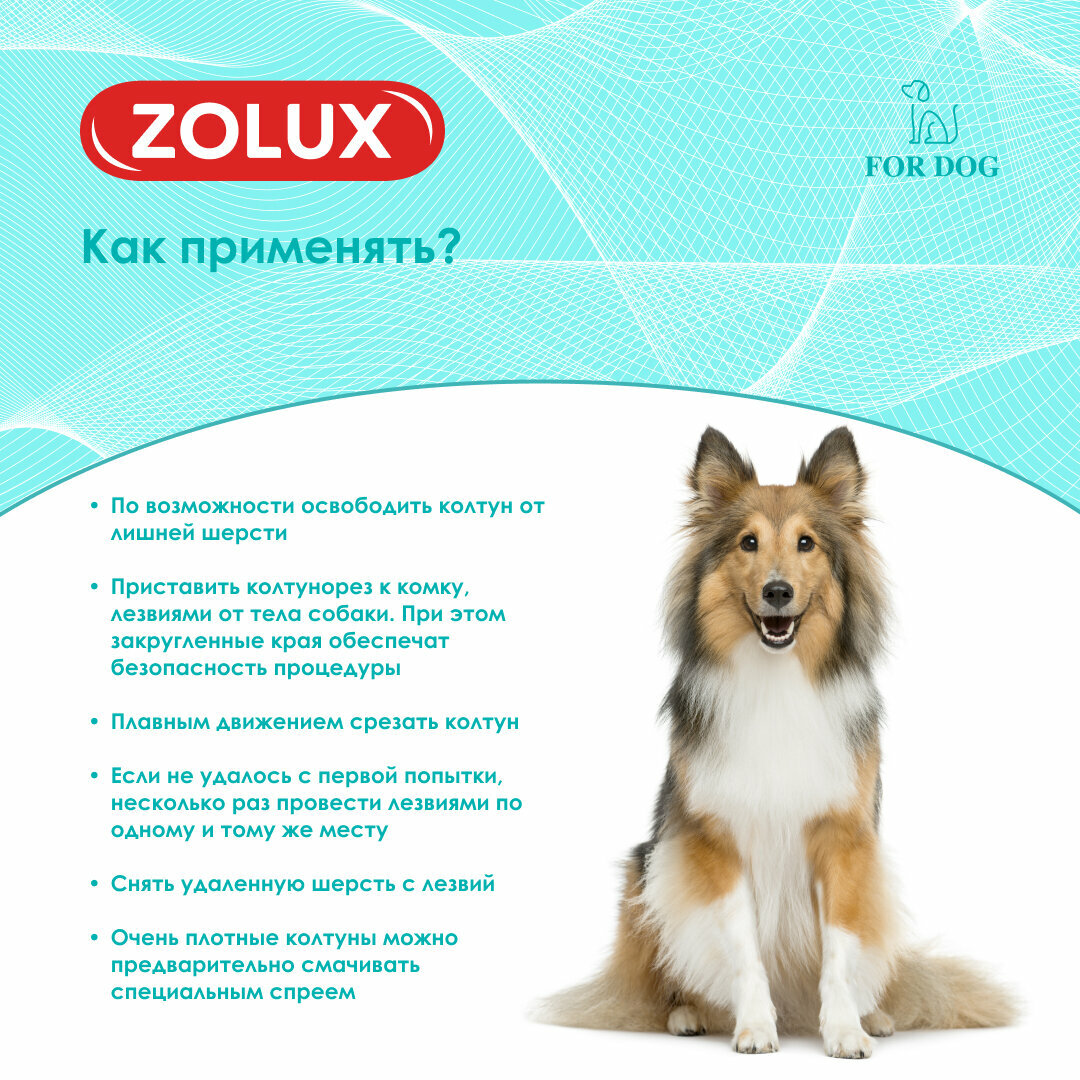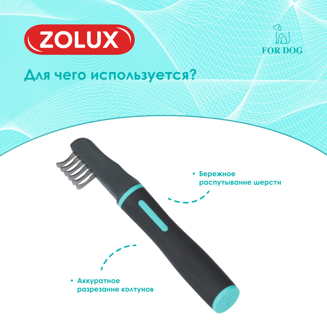 Спутанная шерсть (трихома) образуется из пухового подшерстка, на ощупь она напоминает куски войлока. Чаще всего колтуны локализуются в области паха, живота, в подмышечных впадинах, на хвосте. В запущенных случаях трихома встречается на спине и шее животного. Колтунорез бренда Zolux эффективно и безболезненно удаляет спутанные волосы во время распутывания. Закругленные кончики лезвий мягко воздействуют на кожу вашей собаки и безопасны как для домашних животных, так и для человека. Эта расческа особенно подходит для длинных и вьющихся волос, а также подходит для всех других типов шерсти. Лезвия из нержавеющей стали. Мягкая, эргономичная нескользящая ручка для большего комфорта и оптимального захвата. Колтунорезом пользоваться запрещено, если на коже питомца есть ссадины, раны, а также такие заболевания, как экзема и дерматит.
