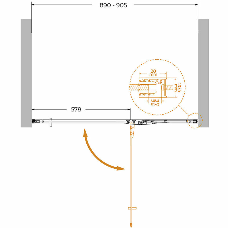 - Размеры с диапазоном регулировок (ШхВ): 890-905x1950 мм.